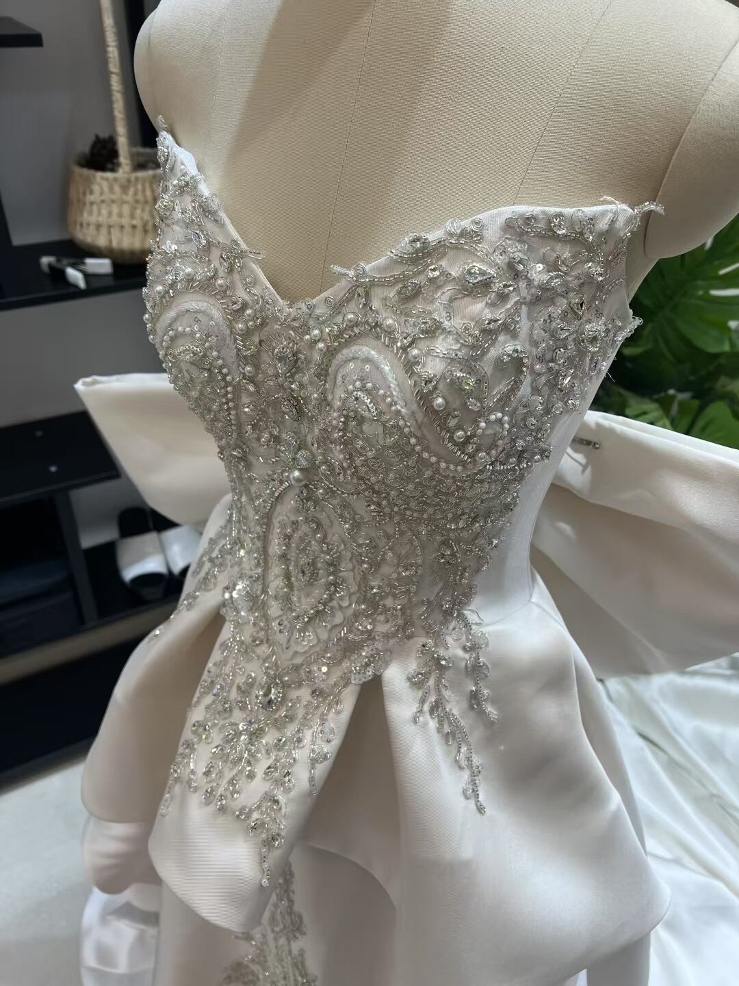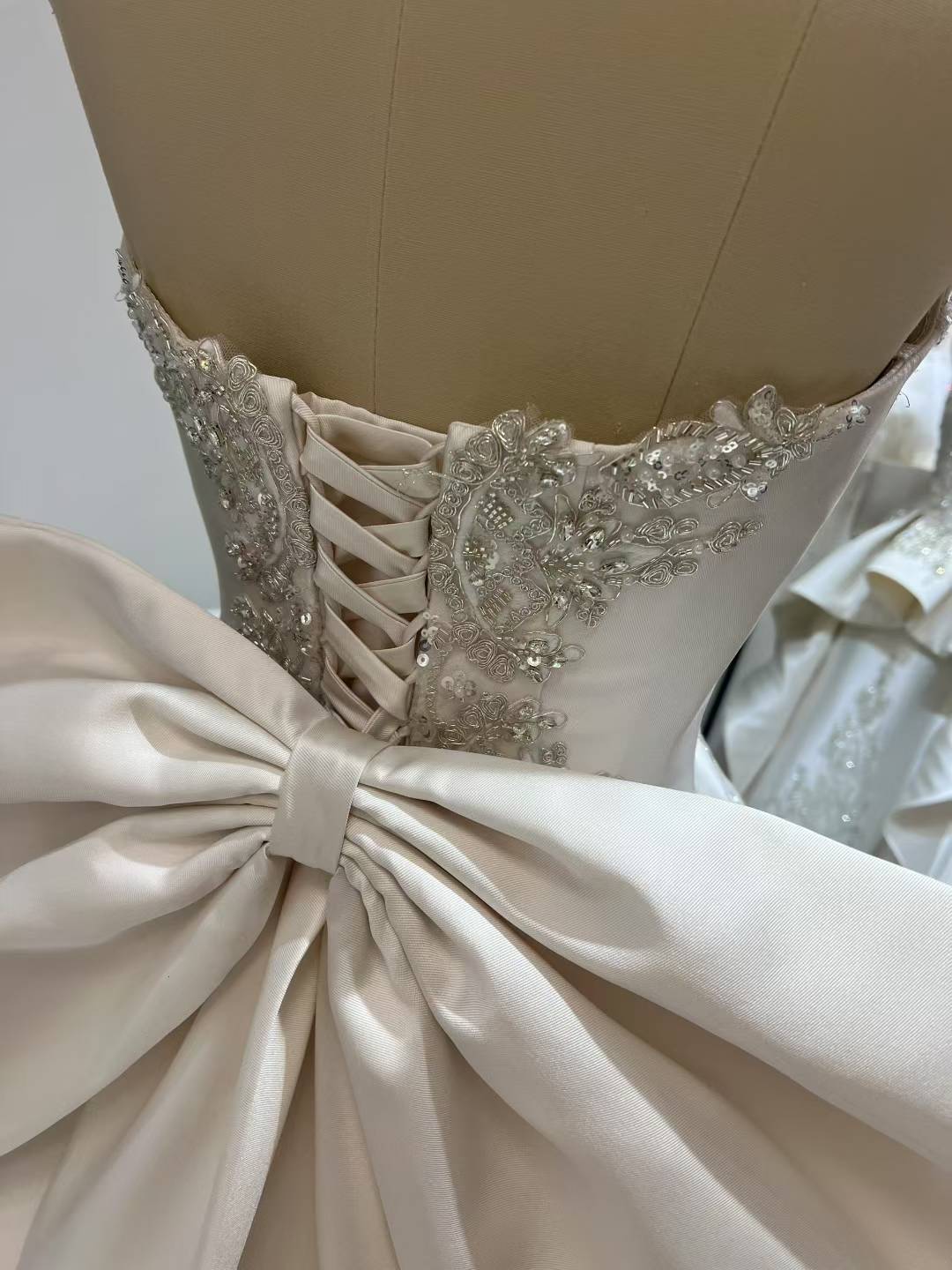 上品! 3D立体レース刺繍 ミカドサテン ウエディングドレスふっくら柔らかなバックリボン /前撮り/花嫁/結婚式/披露宴/
