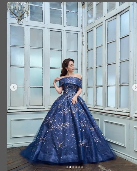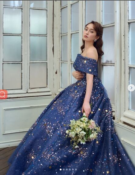 ネイビー オフショルダー 上品花レース カラードレス プリンセスライン 結婚式 披露宴オフショルダー カラードレス 柔らかく重ねたチュールスカート プリンセスライン フレアスカート 結婚式 披露宴