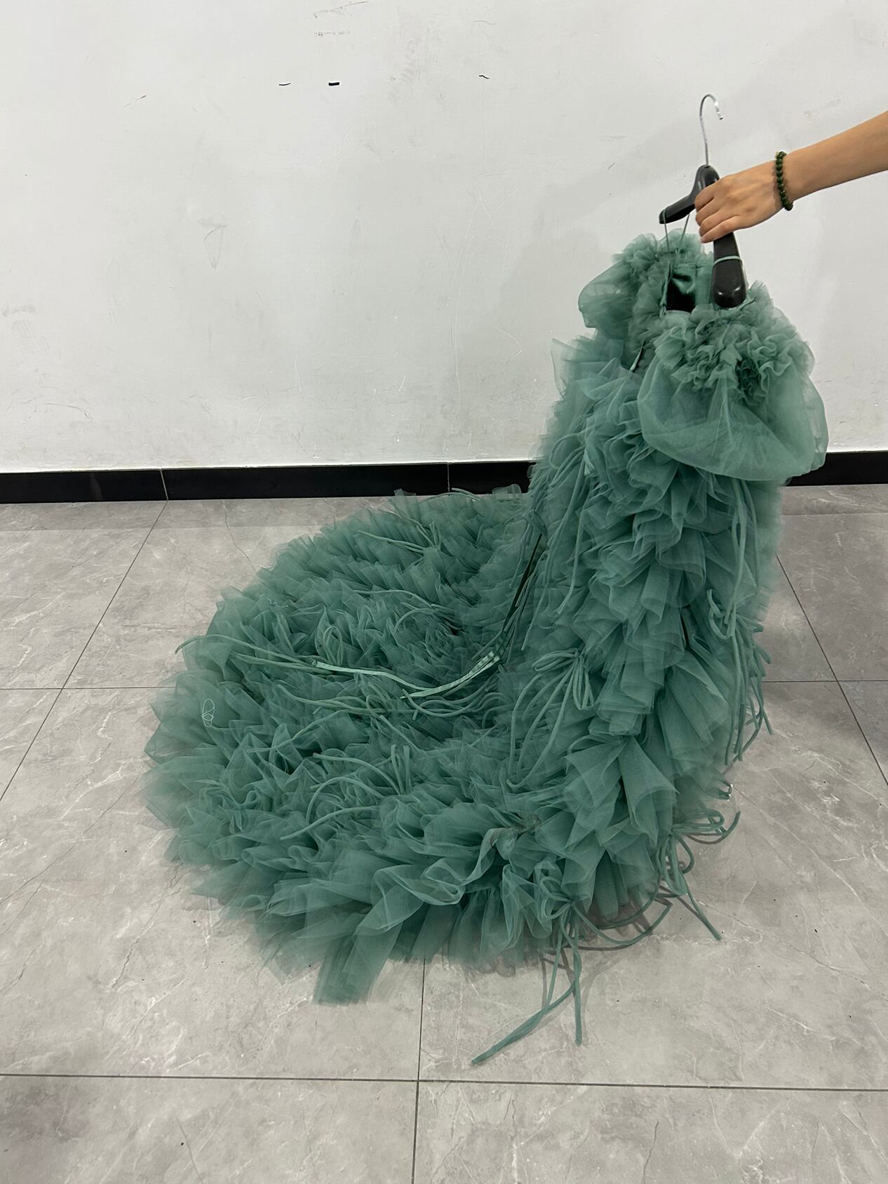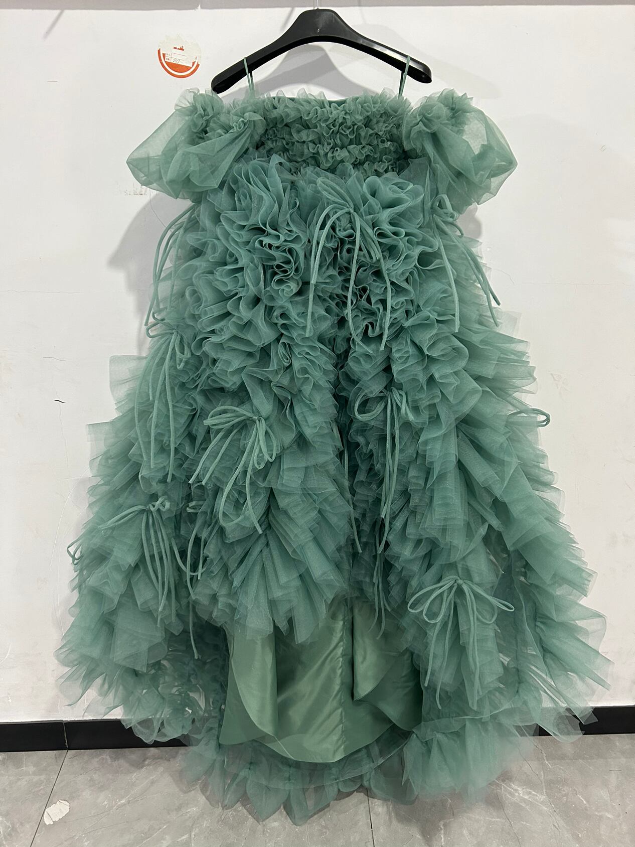 韓国風もこもこチュールドレス グリーン カラードレスフリルオフショルダー お色直し ふわふわしミニトレーン