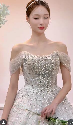 上品!オフホワイト キラキラチュール 3D立体レース刺繍 プリンセスライン 前撮り/花嫁/結婚式/披露宴/