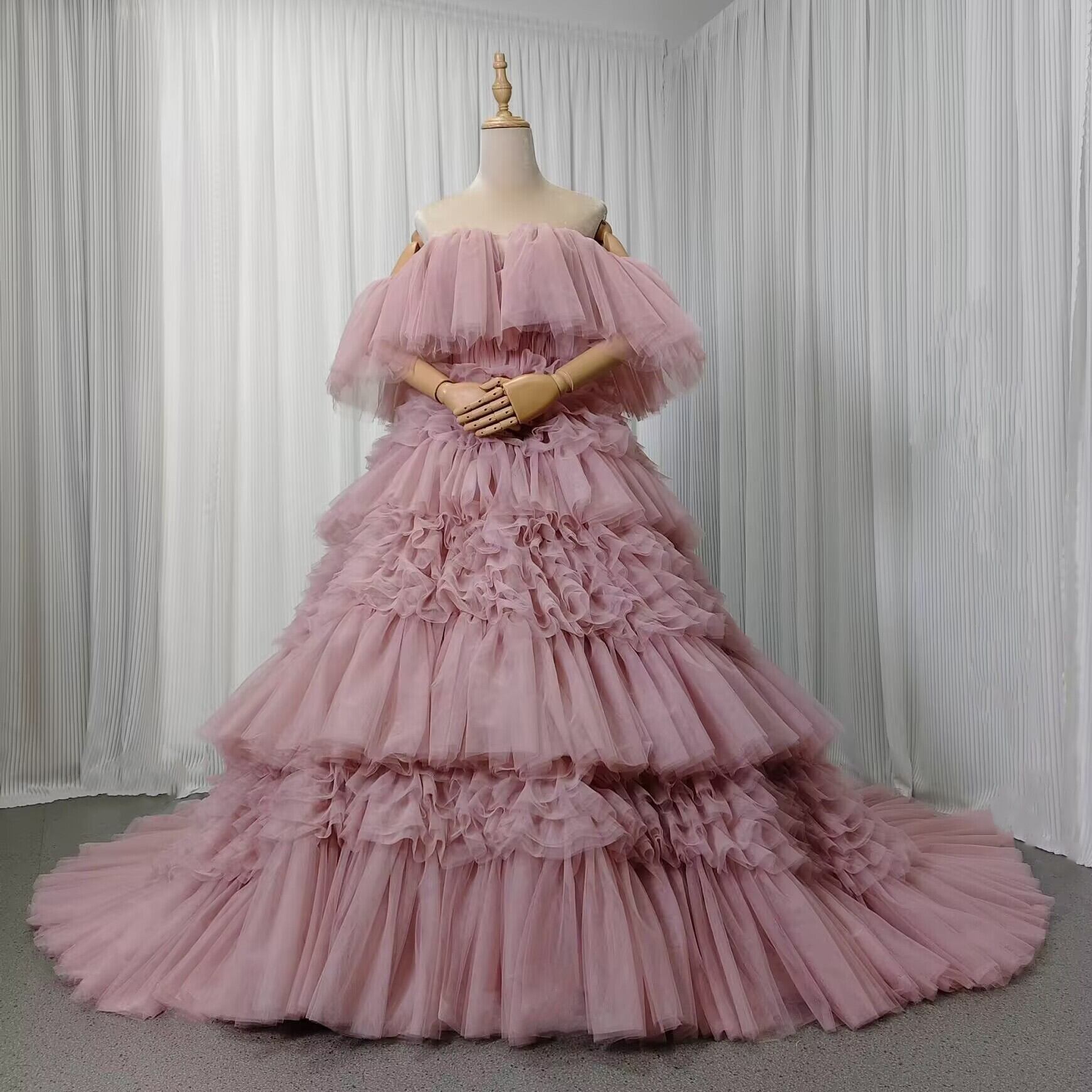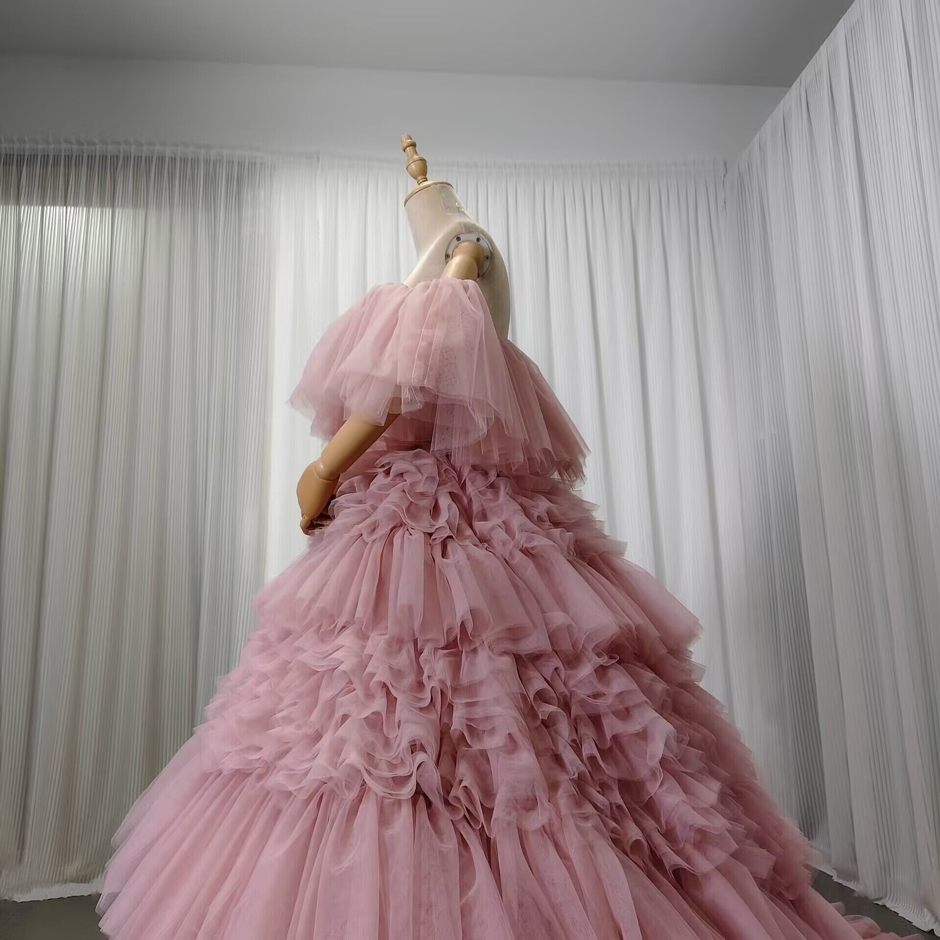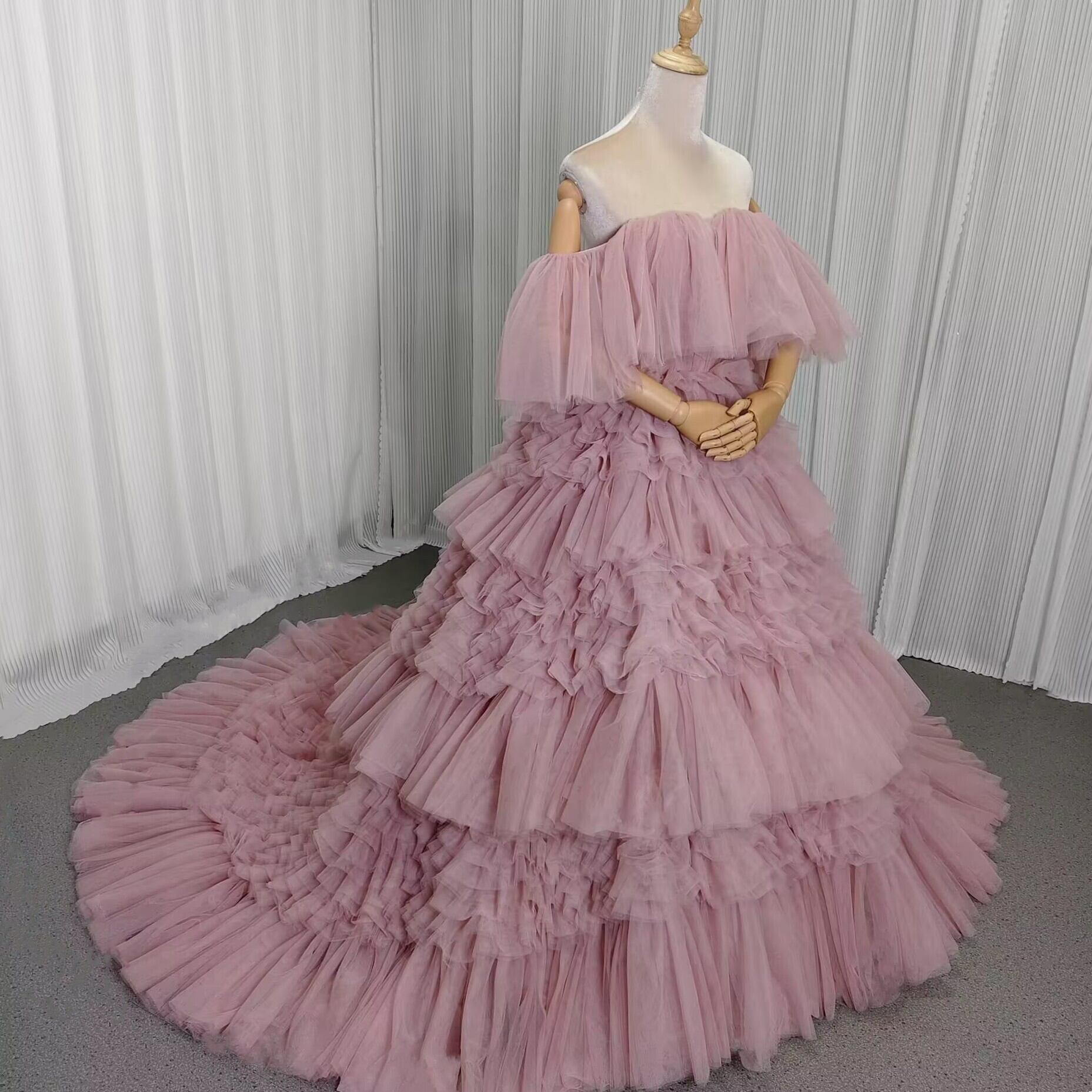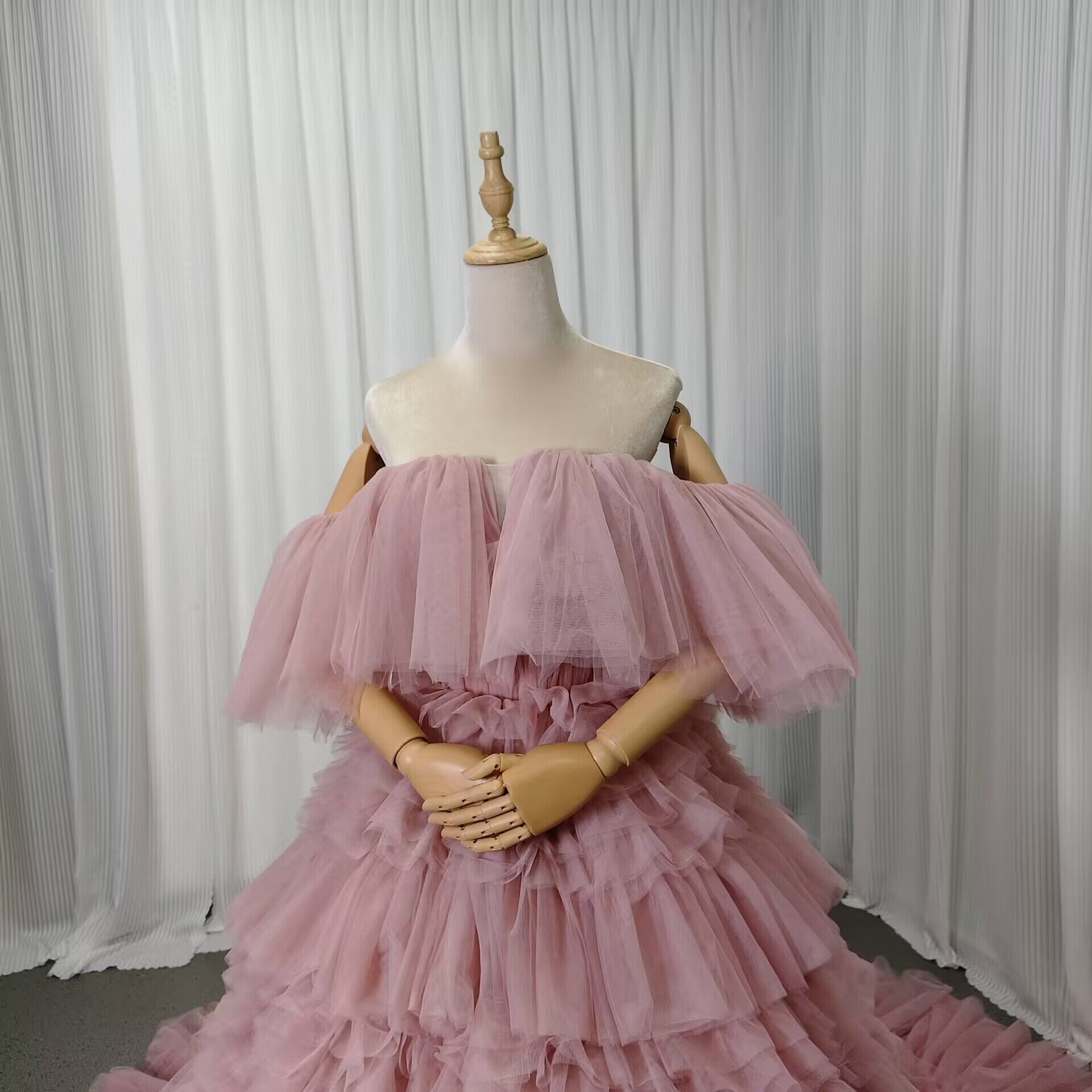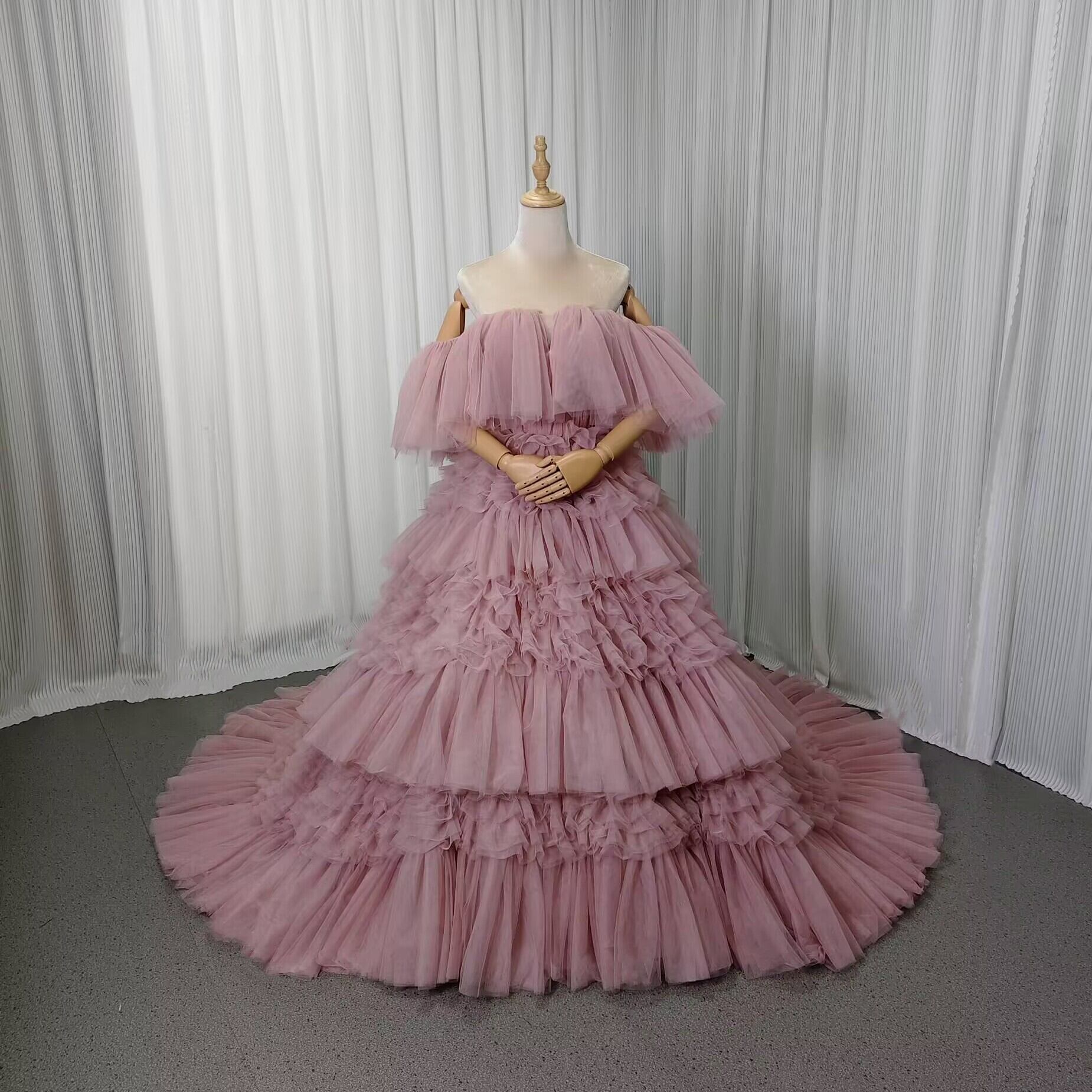 韓国風もこもこ ピンク オフショルダー カラードレス リ華やかなリボントレーンティアードのドレス 花嫁