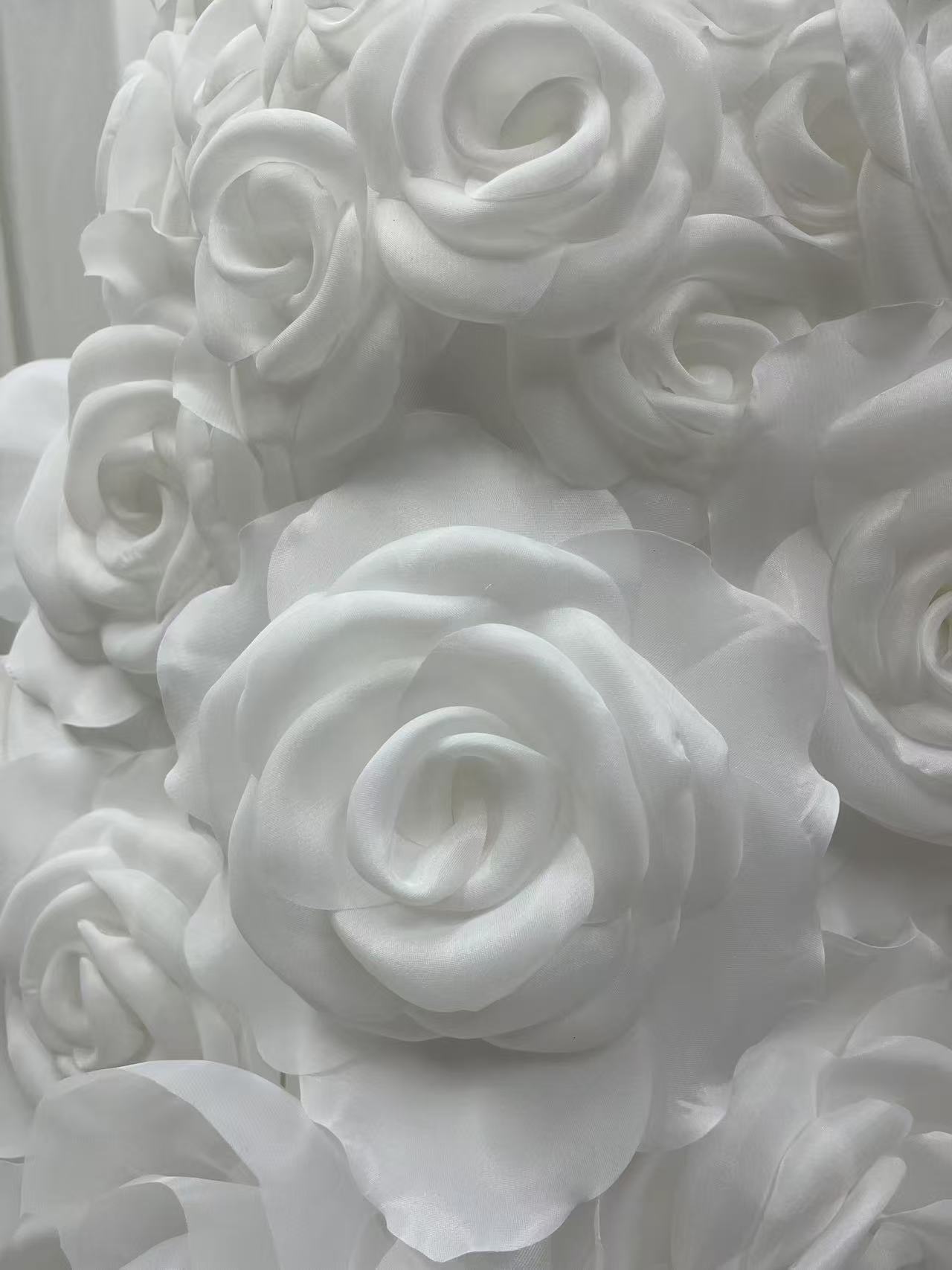 韓国風 オフホワイト バラ ベアトップ ウエディングドレス 華やかなリボントレーン 花嫁