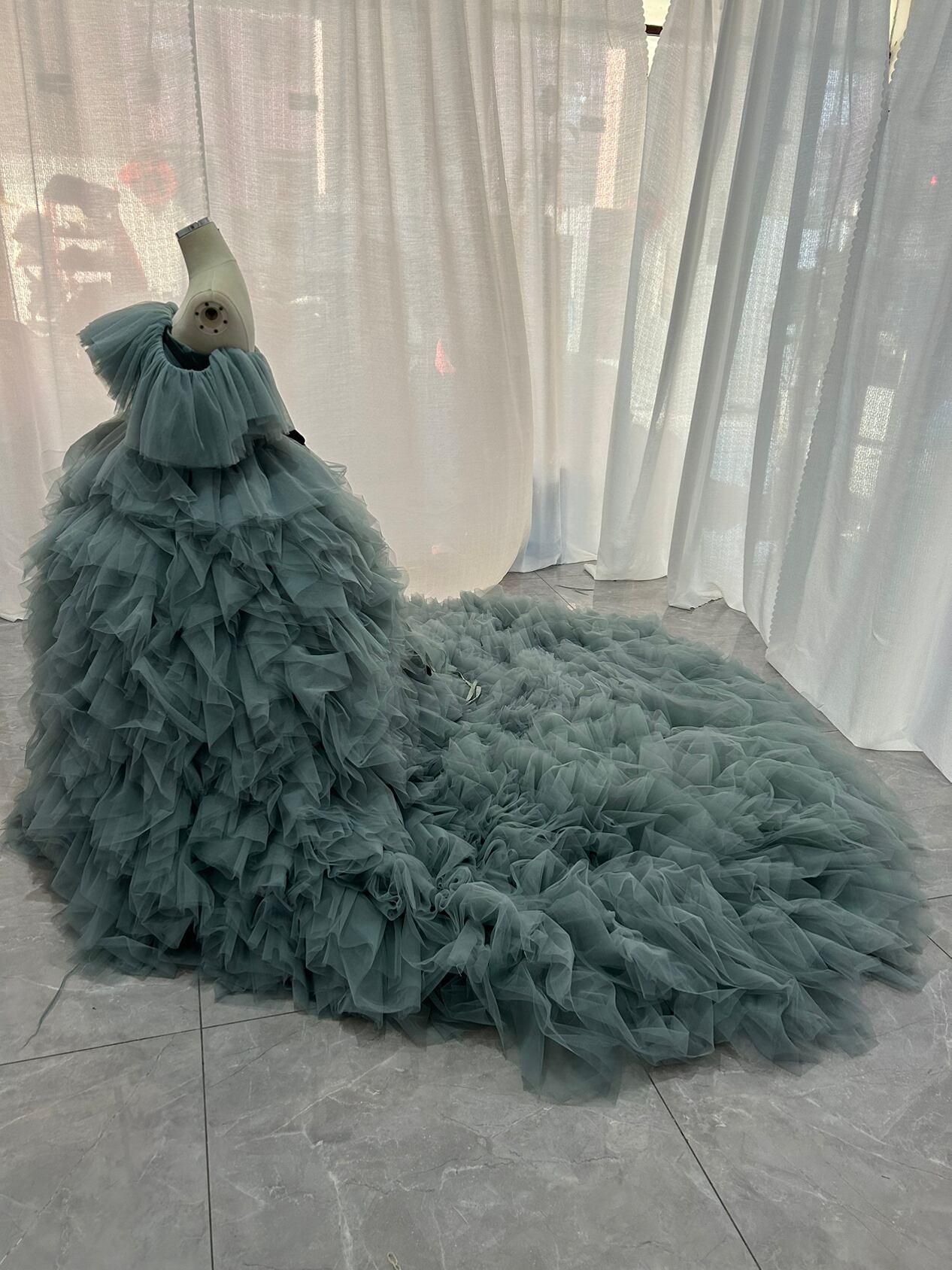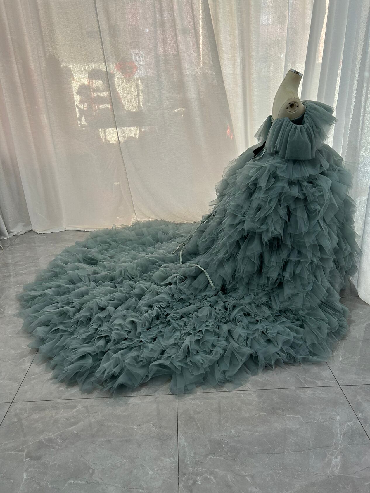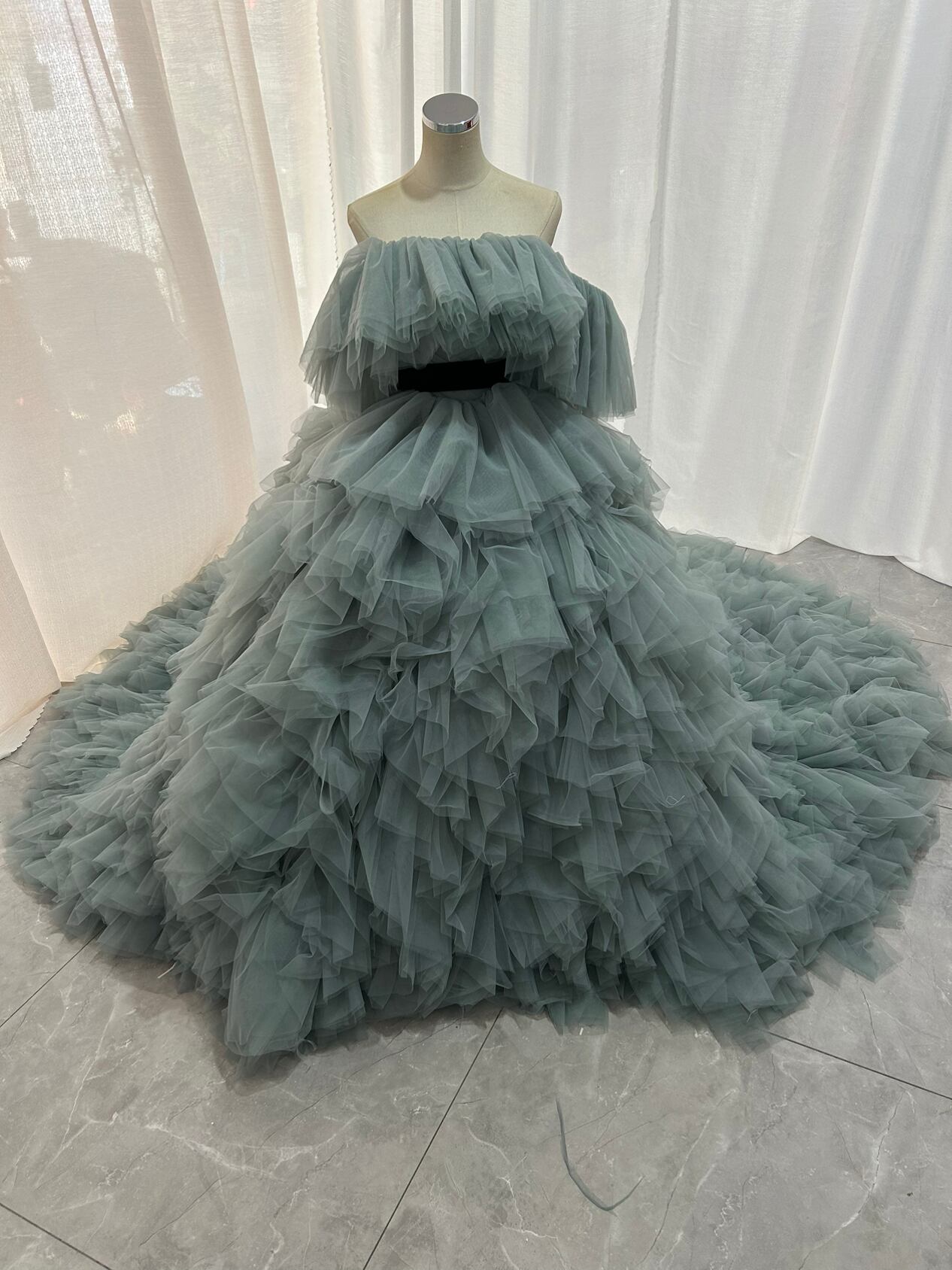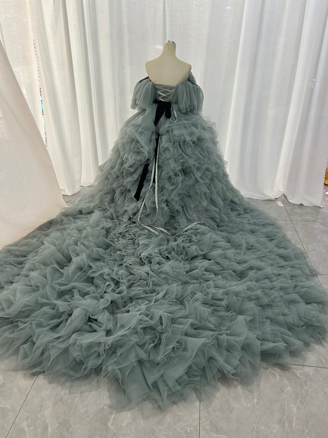 グレー オフショルダー カラードレス 韓国風ドレス チュールドレス もこもこフリルドレス ボリューミー 前撮り