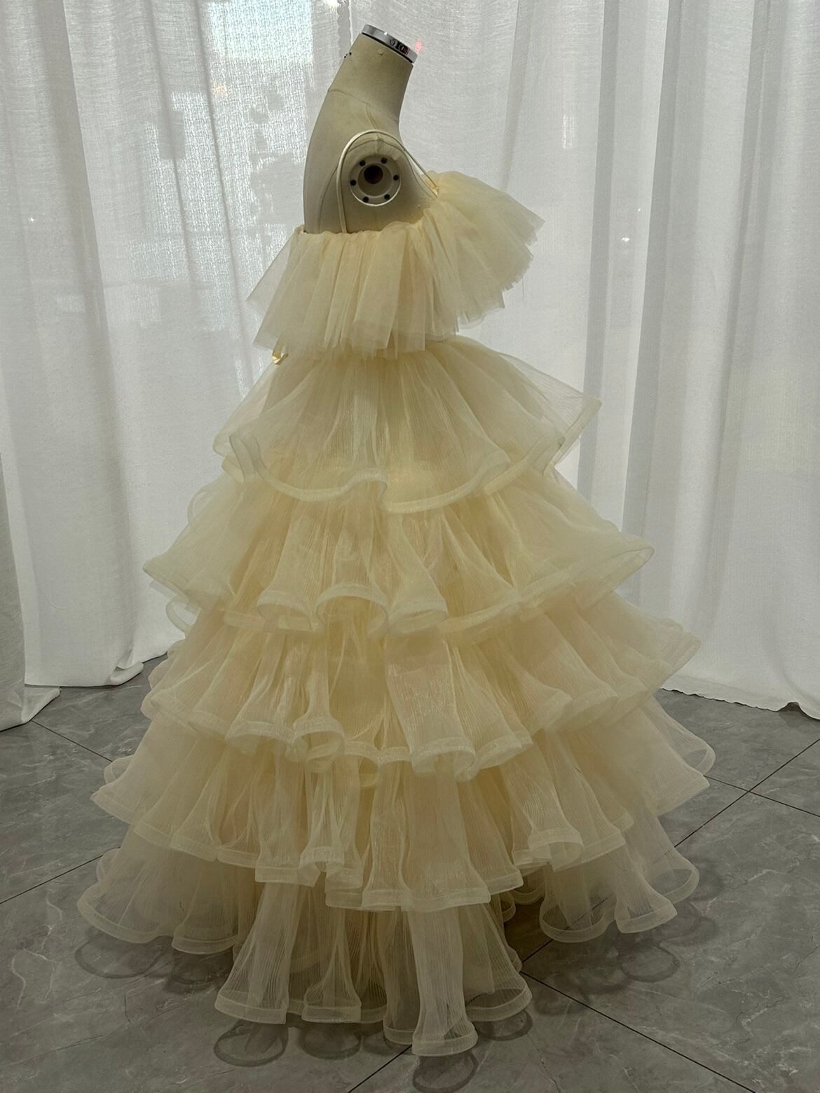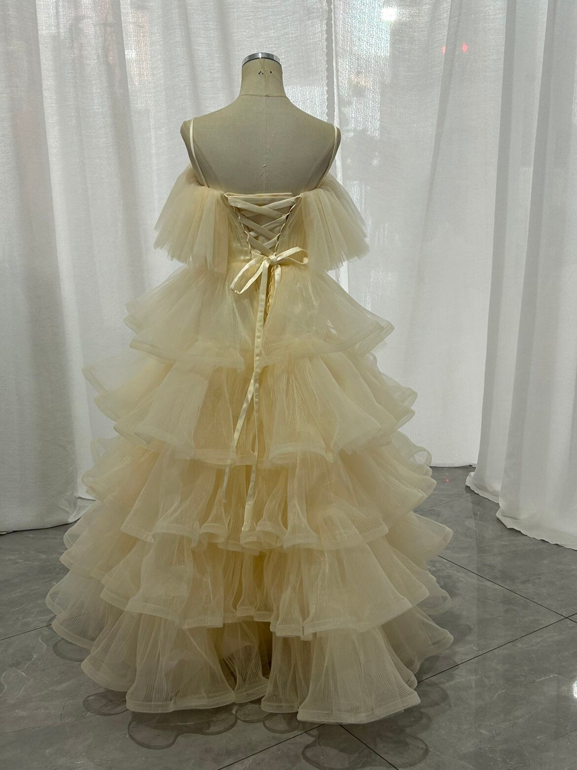 人気上昇!キャミソール 薄シャンパンカラードレス オフショルダーの 柔らかく重ねたチュールスカートパーティードレス お色直し