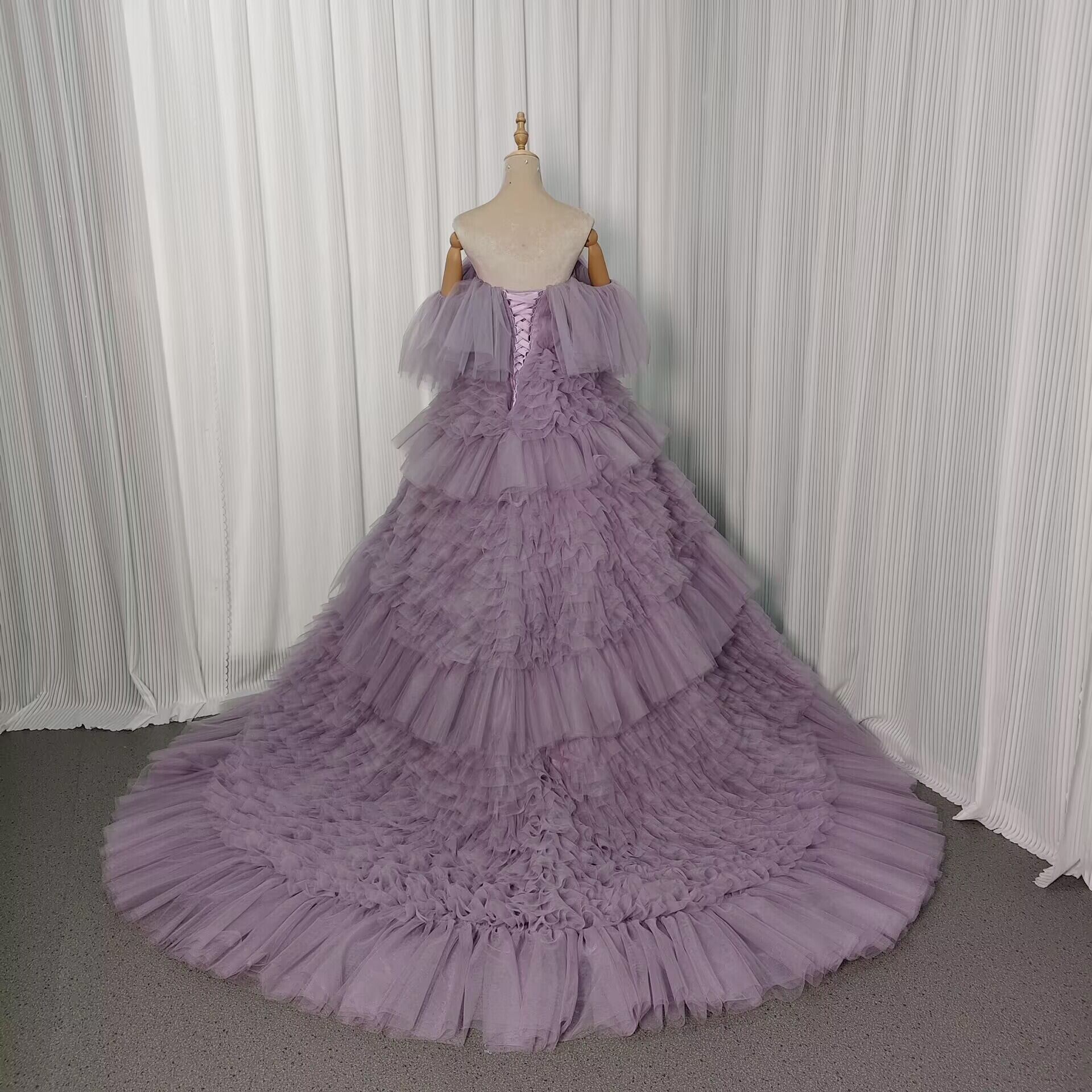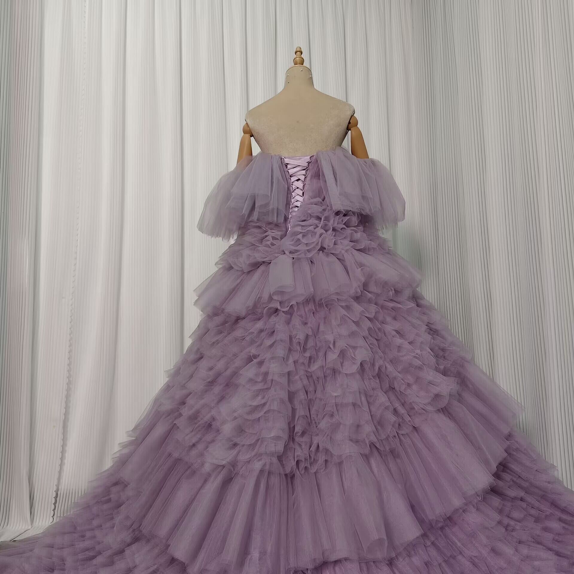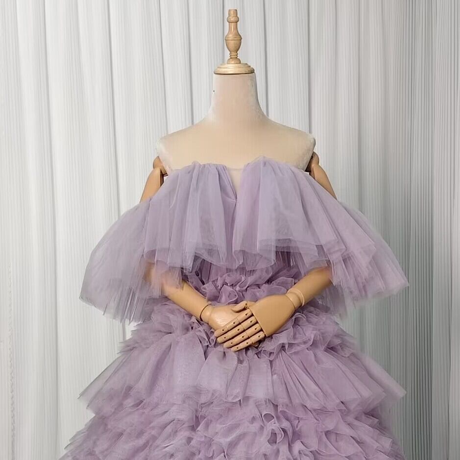 韓国風もこもこ 紫 カラードレス チュールドレス フリルオフショルダー お色直し ふわふわ もこもこドレス