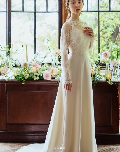 上品! オフホワイト 流れる透け花レース ウエディングドレスソフトマーメイドライン +フェミニンなフレームレースの袖トップス 花嫁/結婚式/披露宴/ | David1021k Dress(ダヴィドレス)