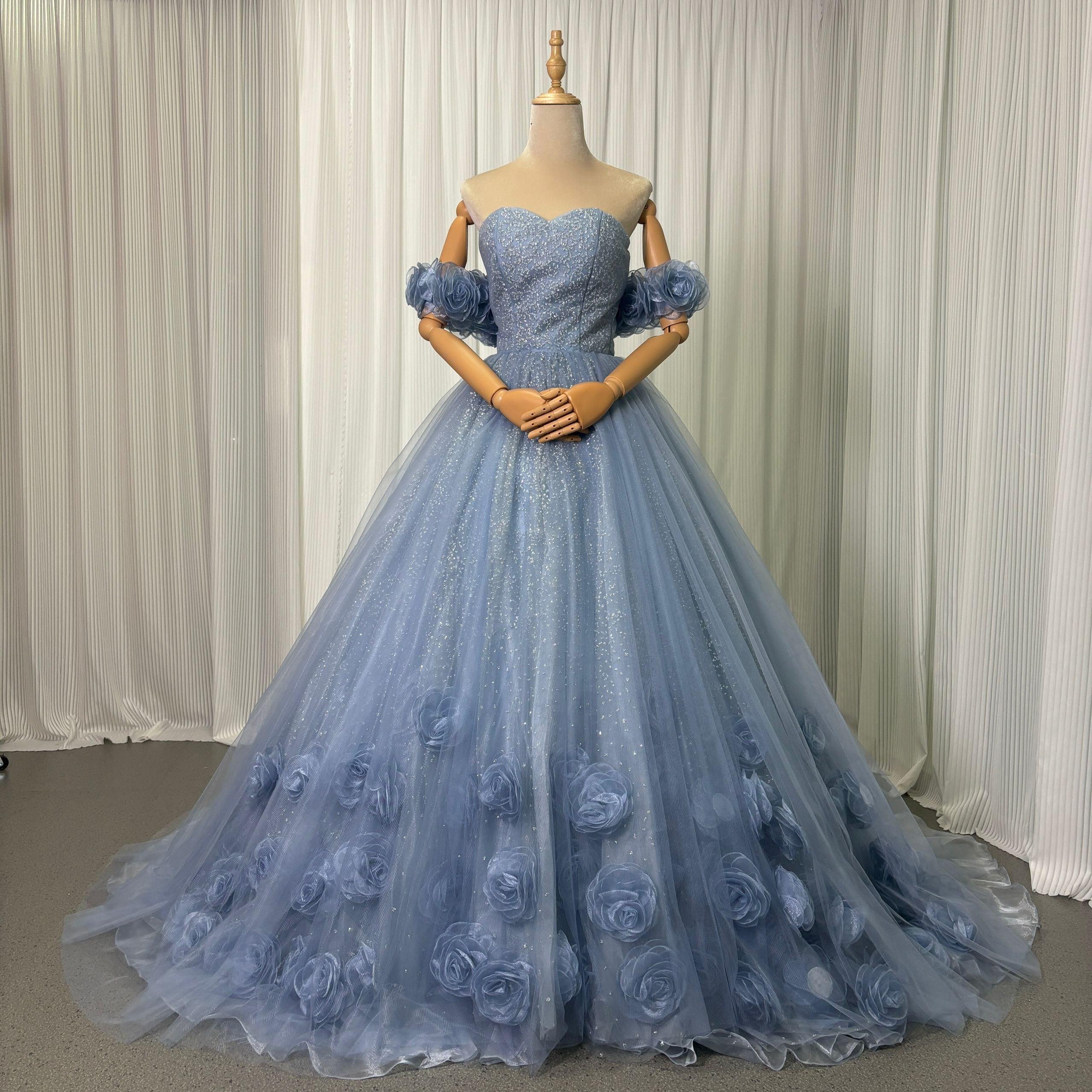 上品! ブルーグレー 取り外しオフショルダー 流れる透け花レース キラキラチュール カラードレス 華やかなトレーン 花嫁/結婚式/披露宴/