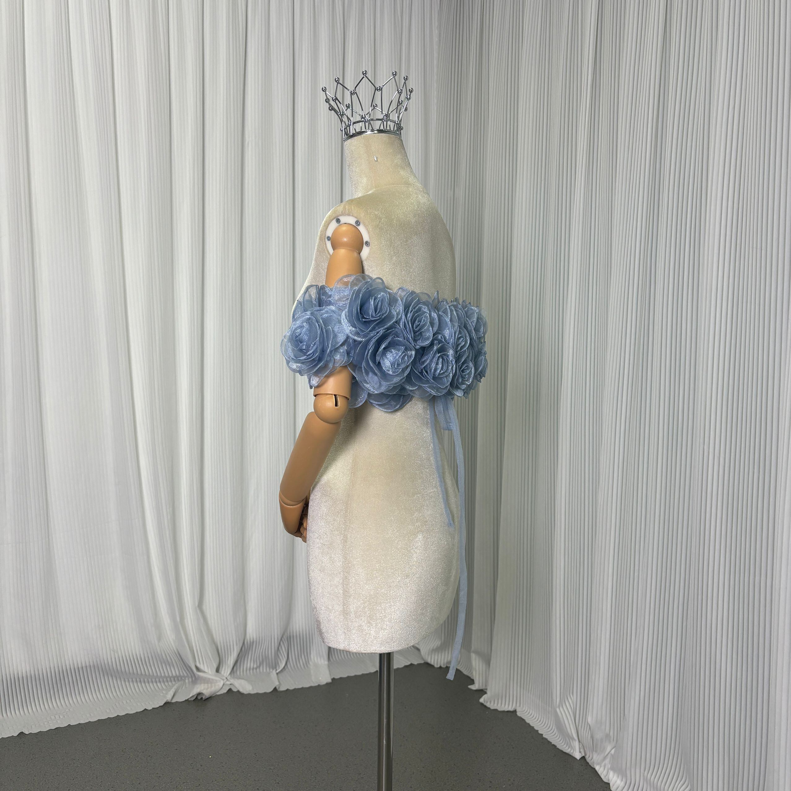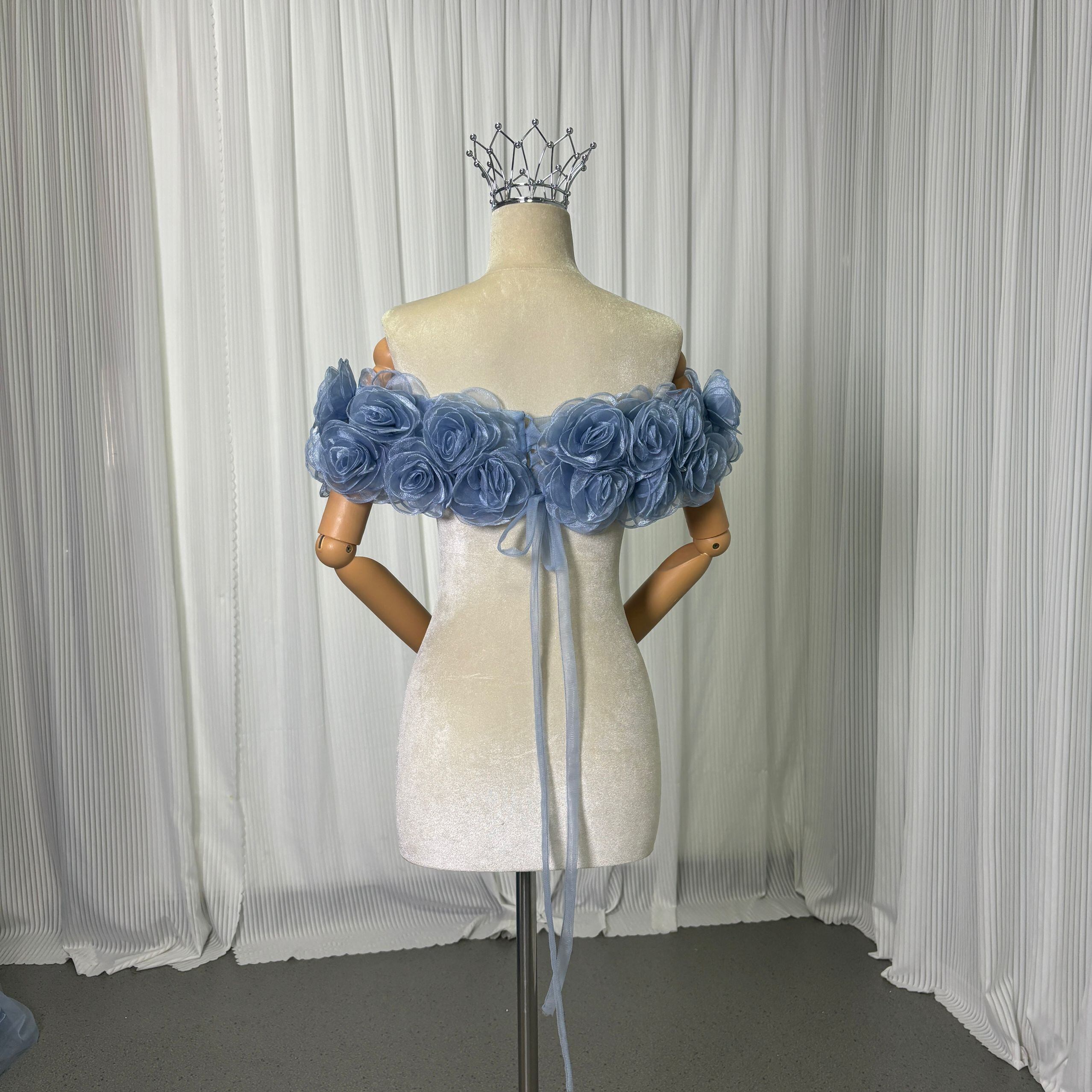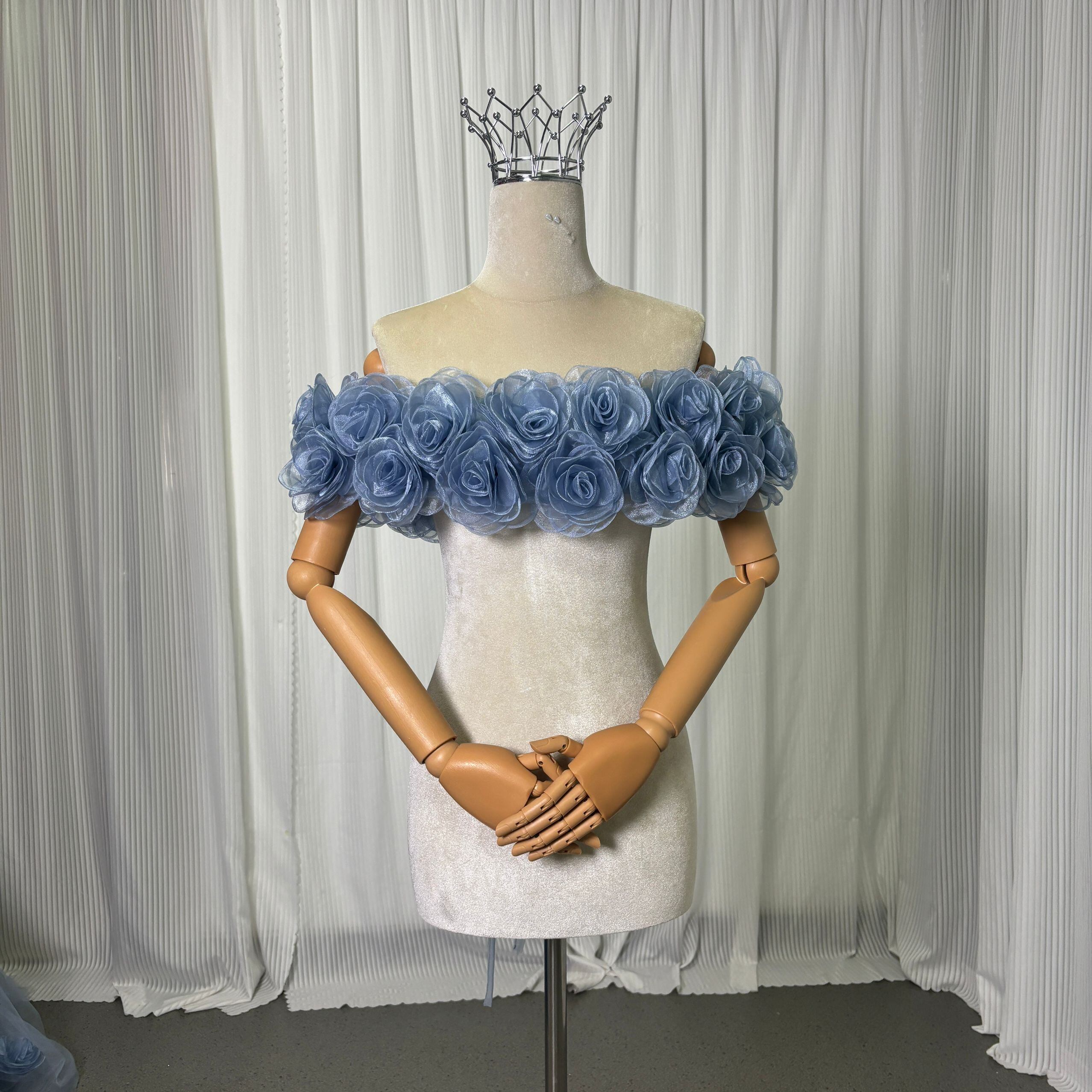 送料無料! ブルーグレー バラ 上質オーガンジー オフショルダー 色直し サイズ調整可能ドレスアレンジ お色直し ロールカラー