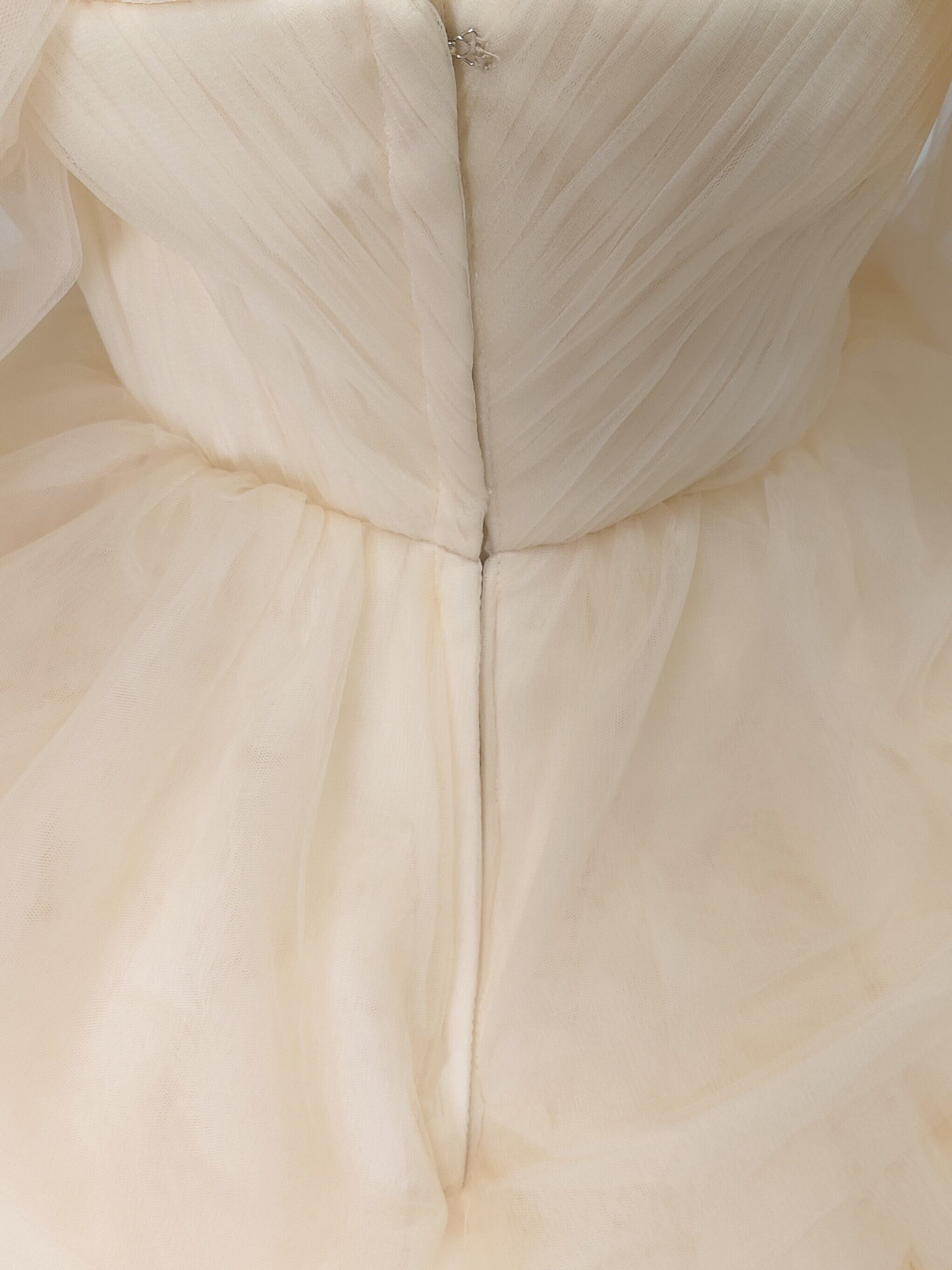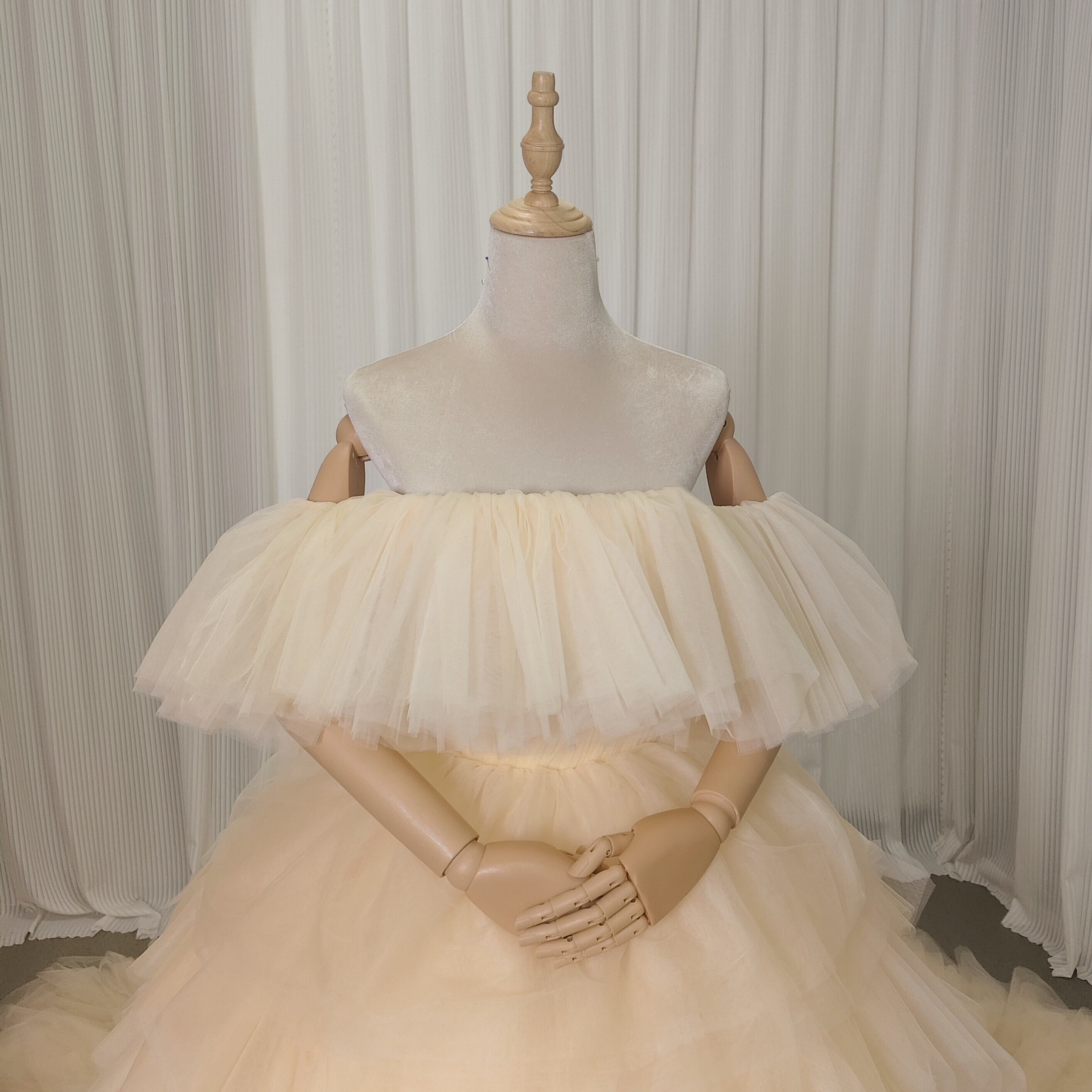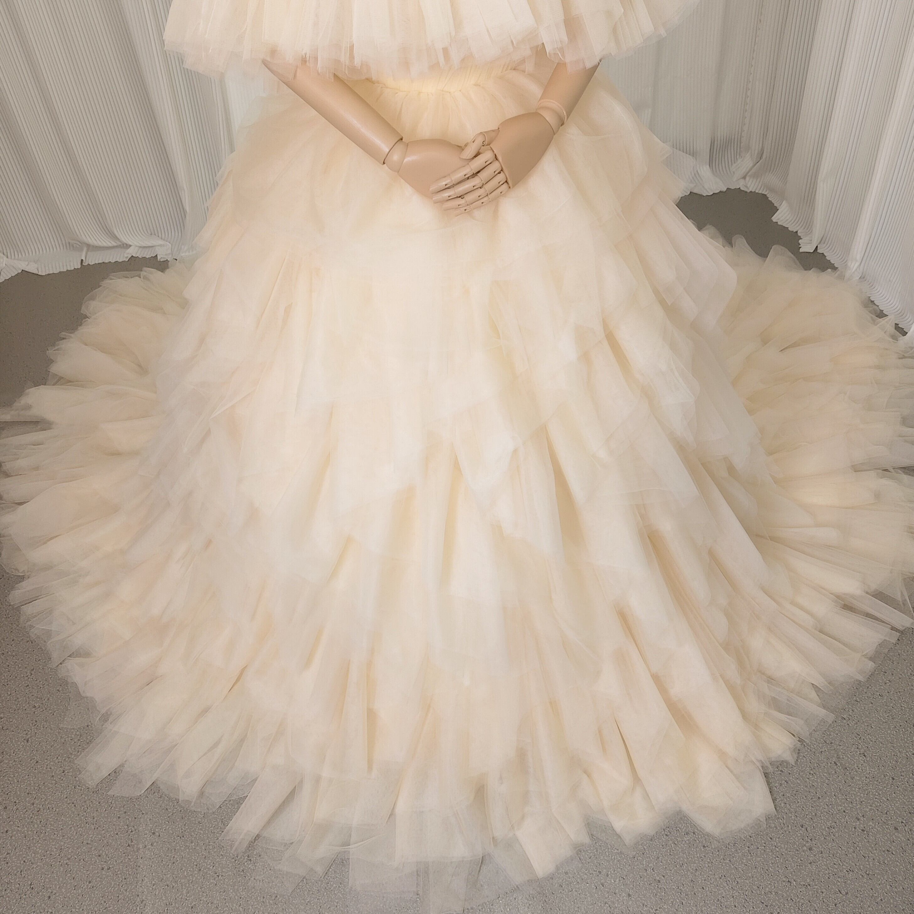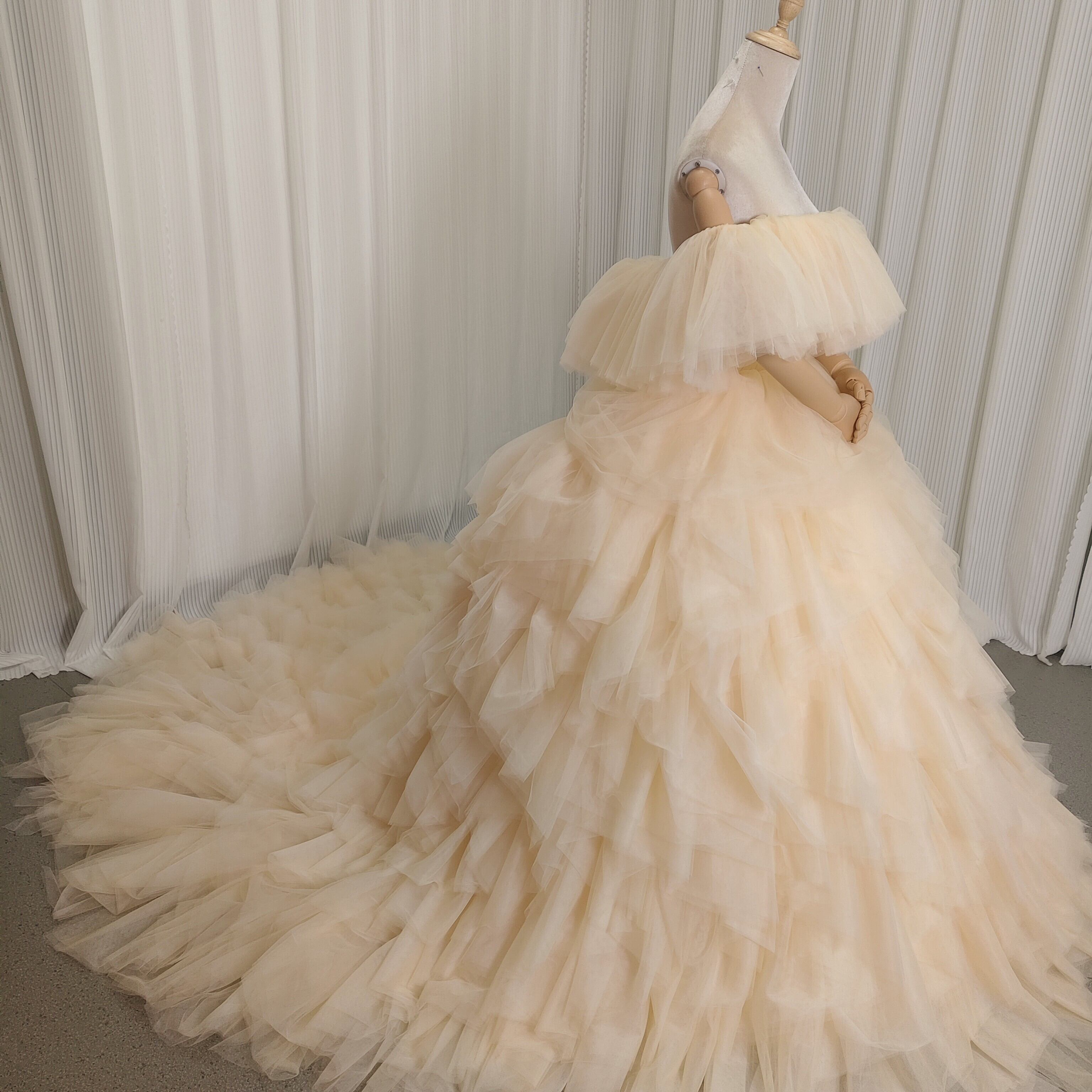 シャンパン色 オフショルダー カラードレス韓国風ドレス チュールドレス もこもこフリルドレス ボリューミー 前撮り
