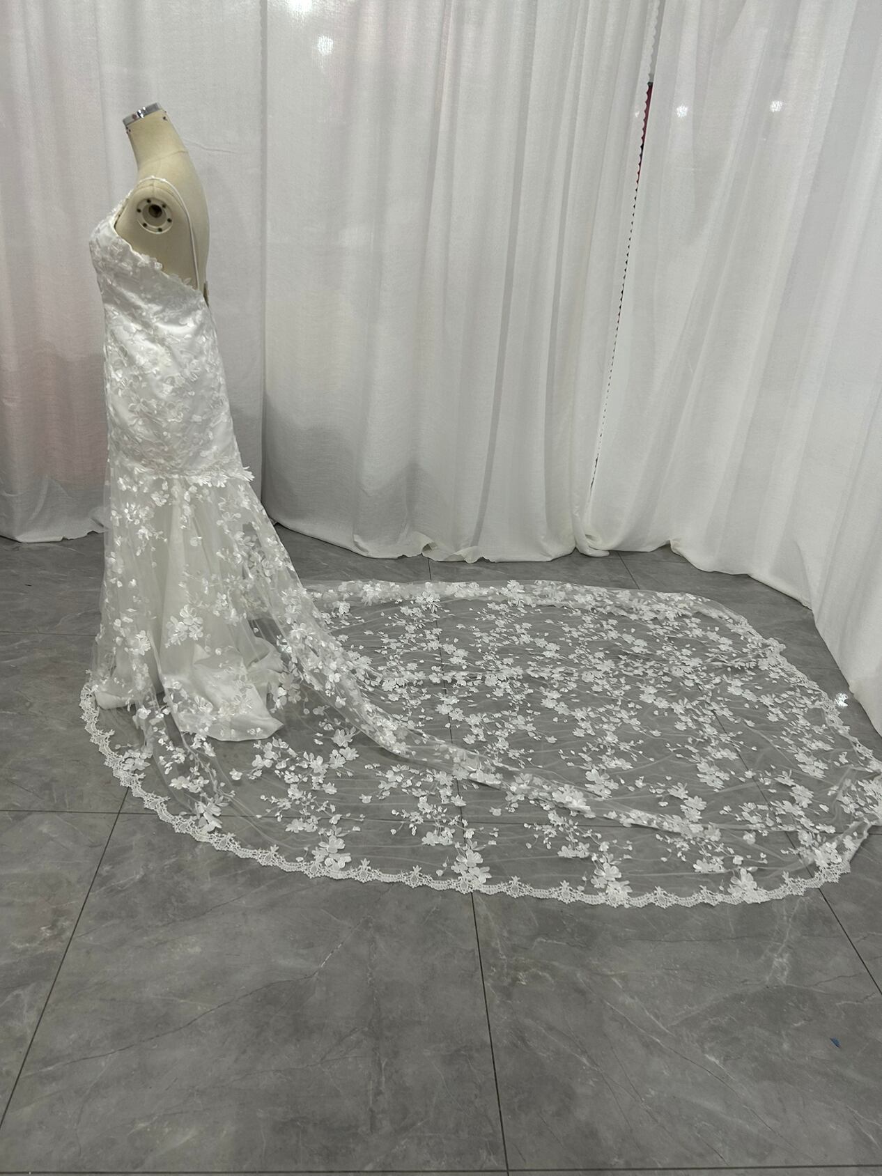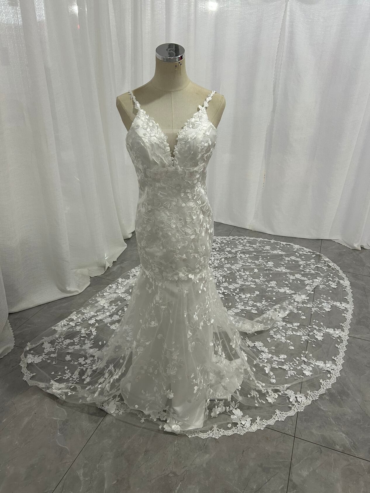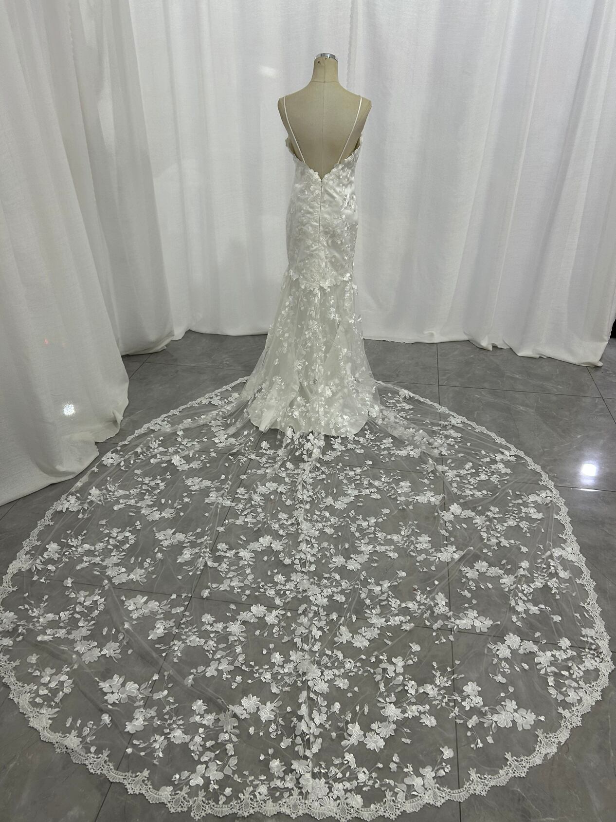 上品! オフホワイト キャミソール 流れる透け花レース ウエディングドレス 華やかなトレーン 花嫁/結婚式/披露宴/