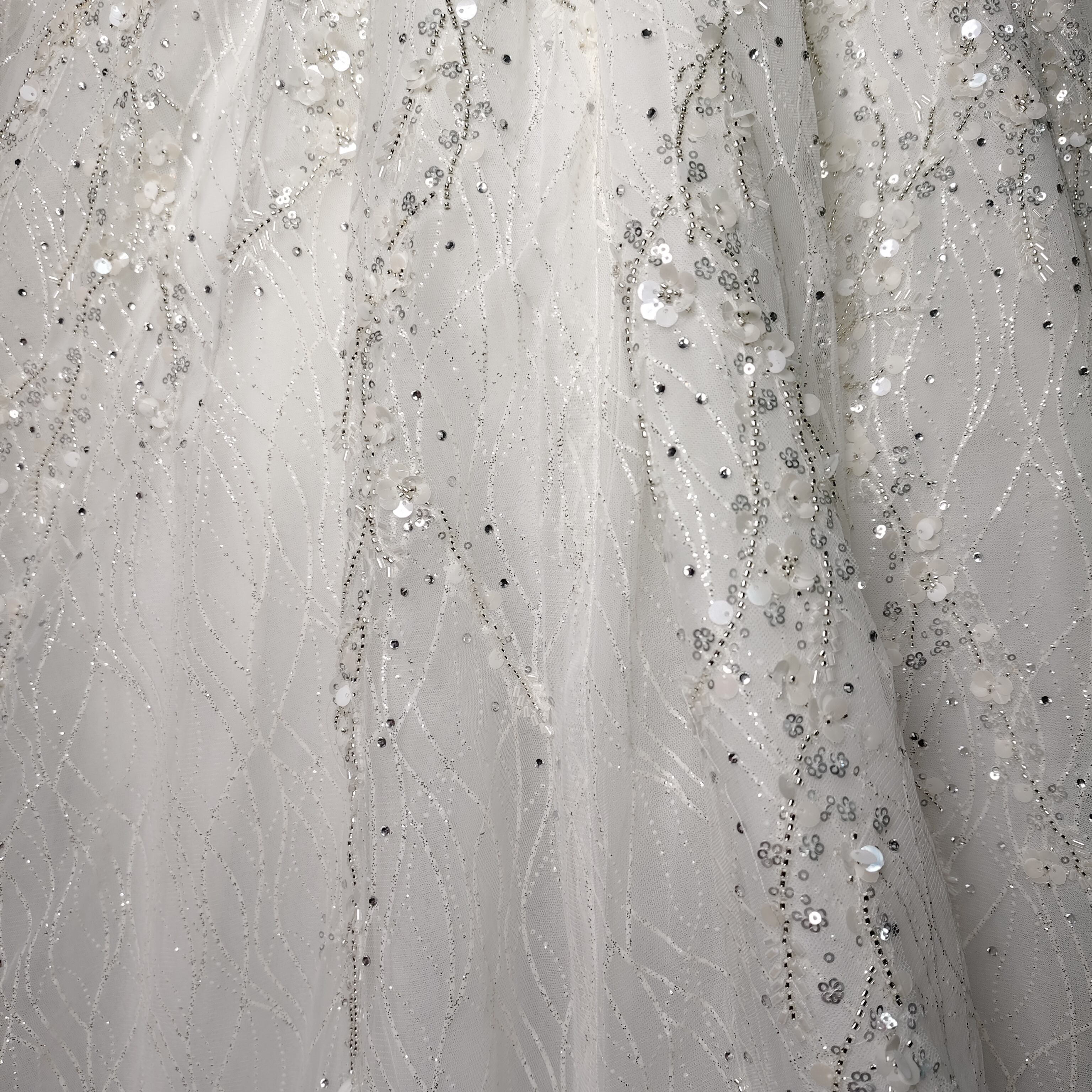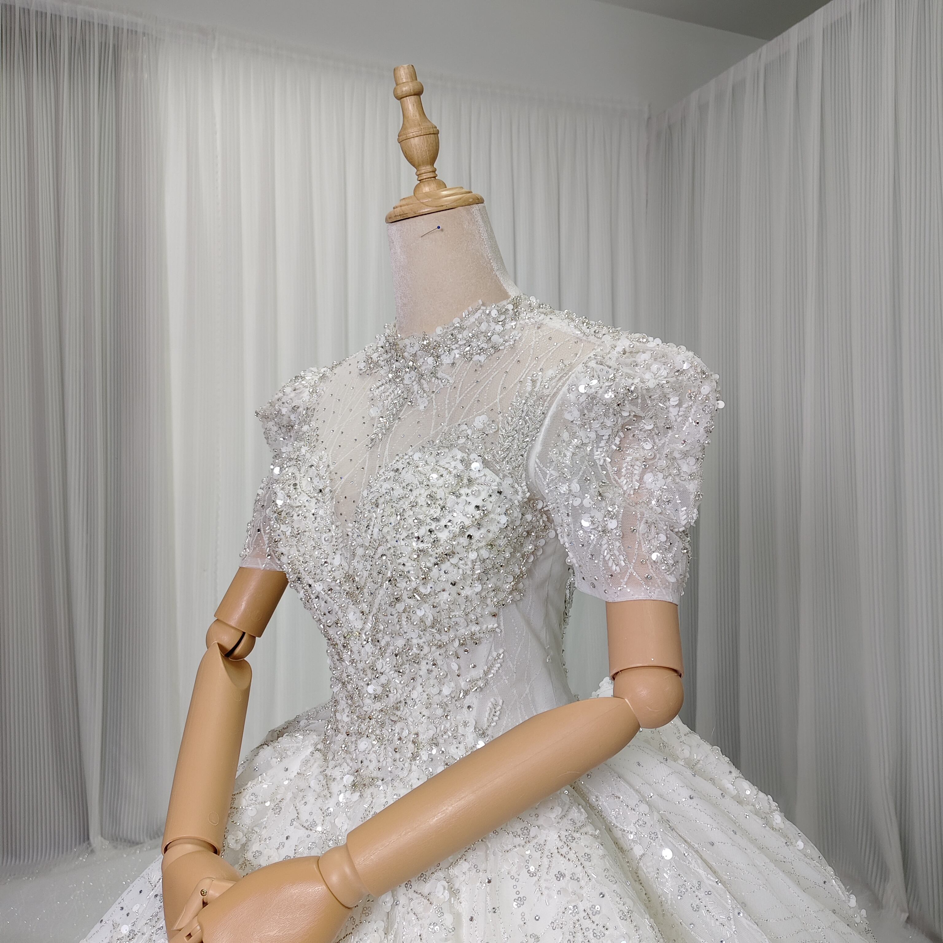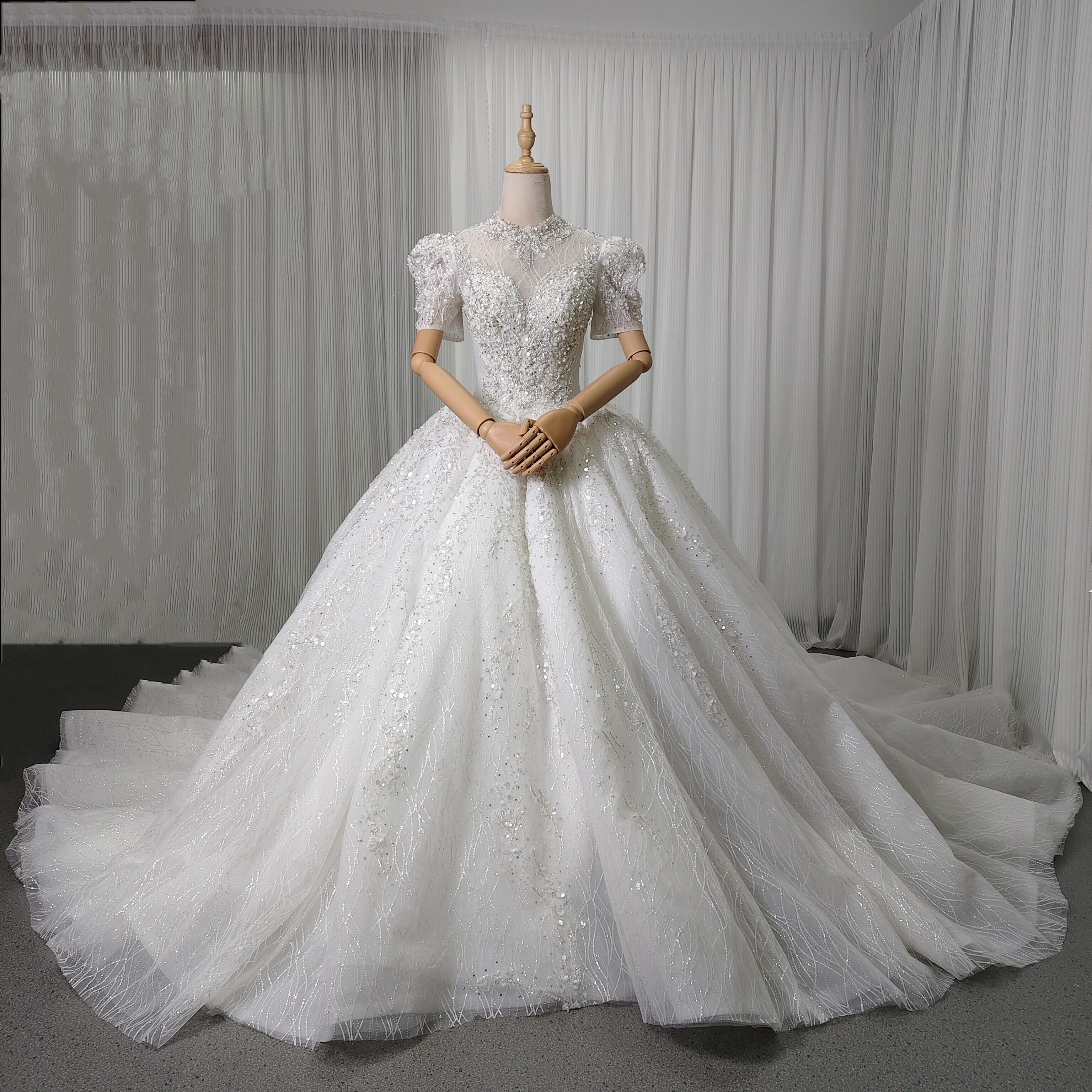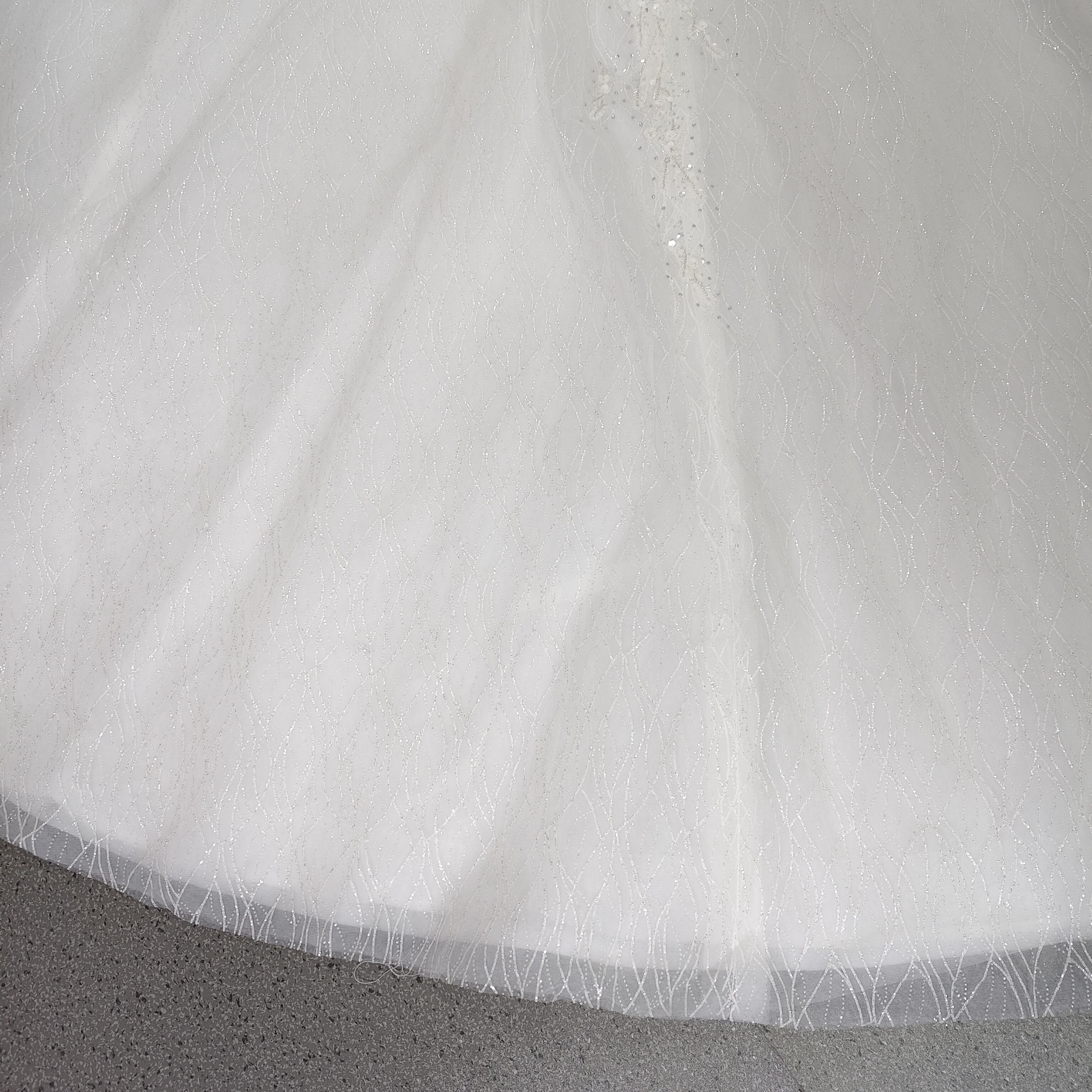 韓国風キラキラウエディングドレス 短袖 ロングトレーン ビジュードレス グリッターチュール 結婚式 前撮り 披露宴