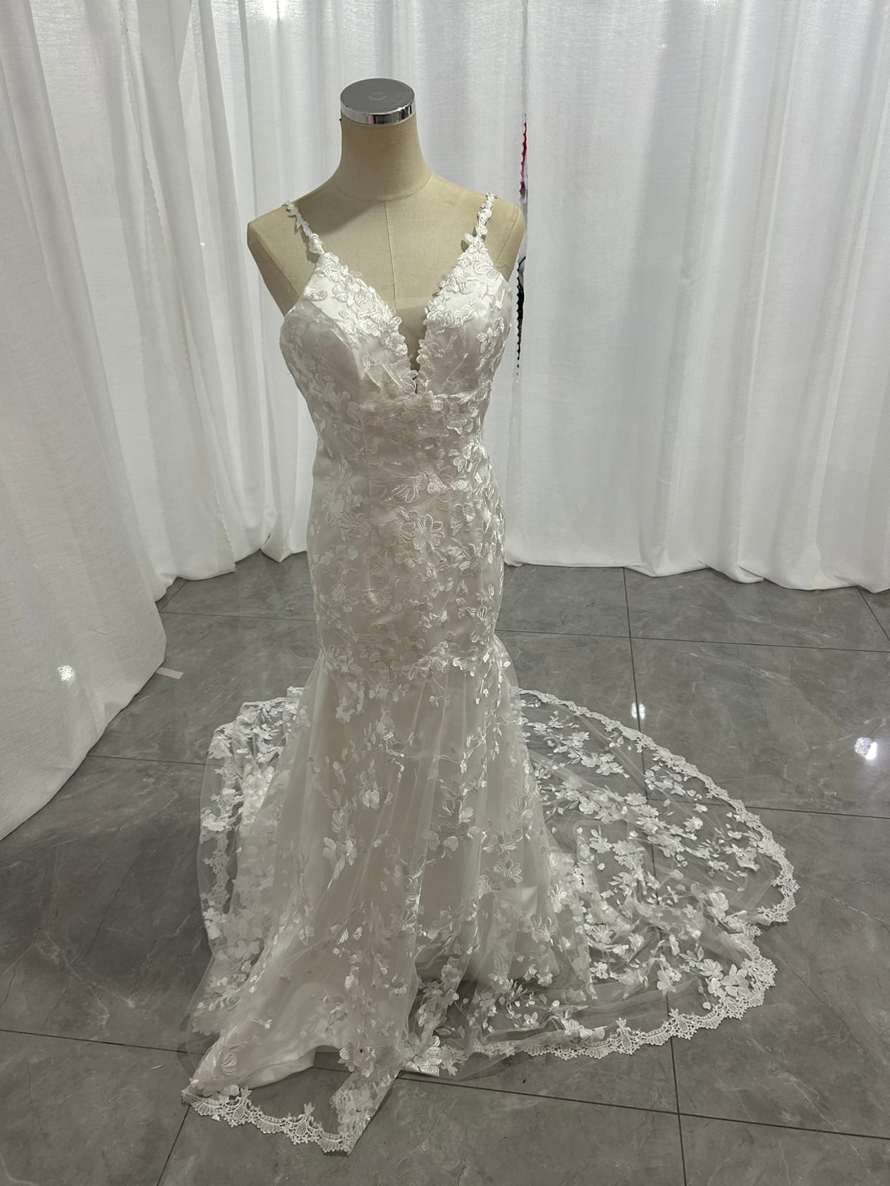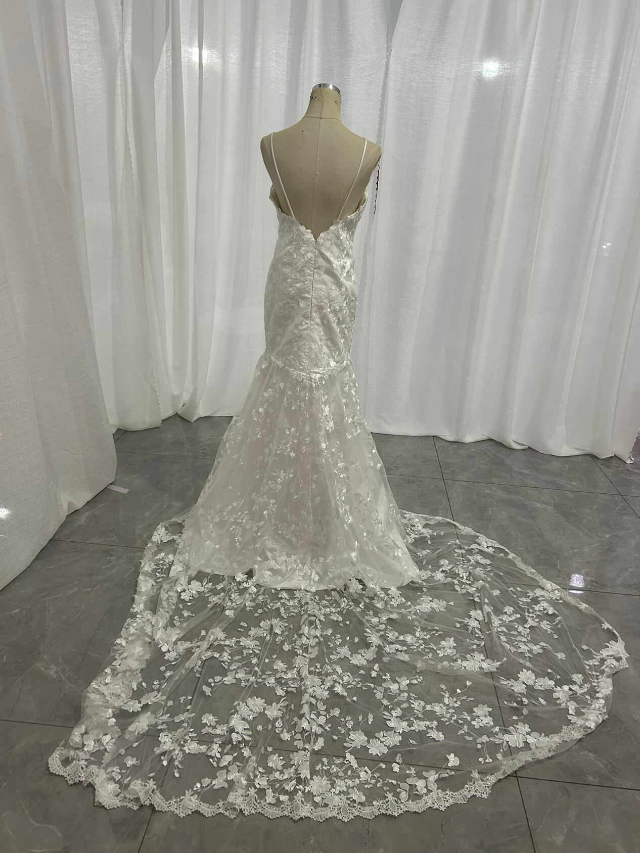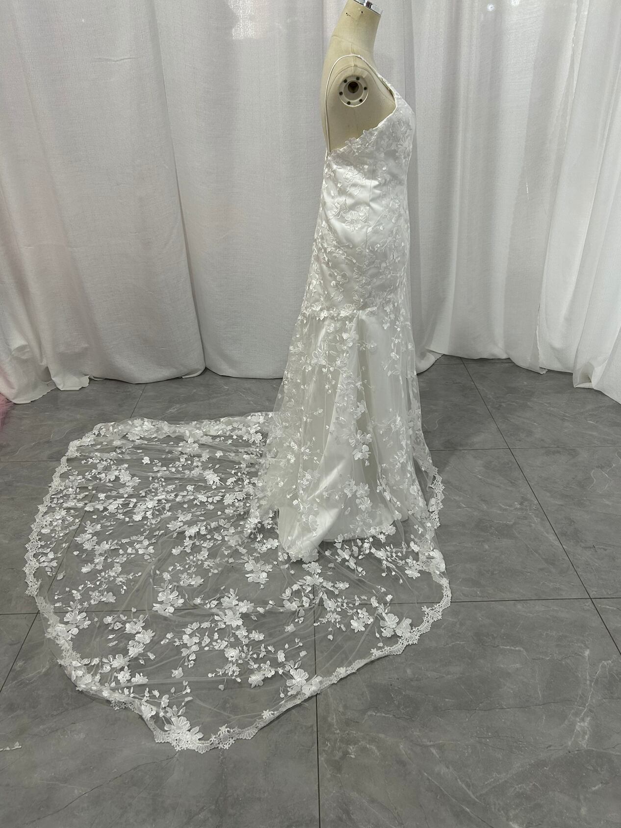上品! オフホワイト キャミソール 流れる透け花レース ウエディングドレス 華やかなトレーン 花嫁/結婚式/披露宴/