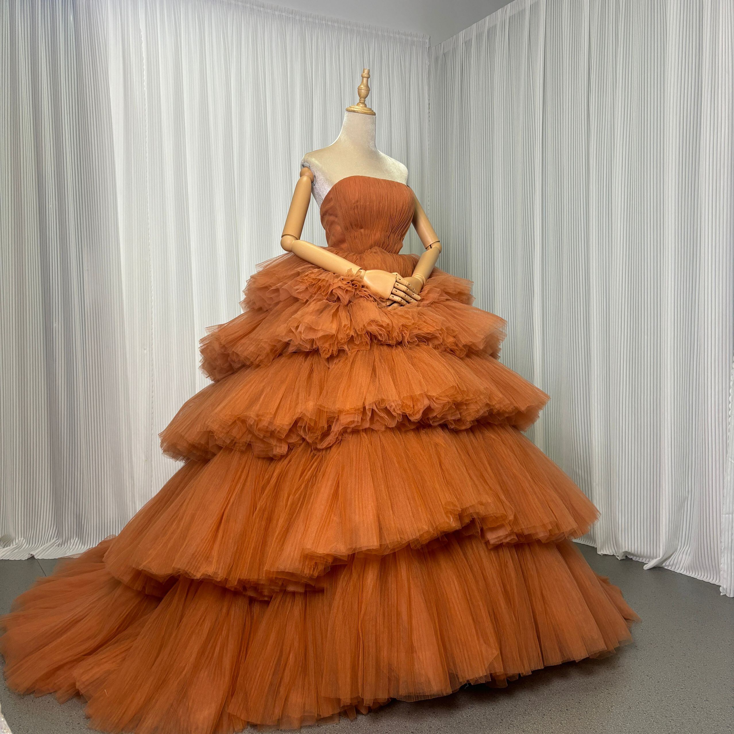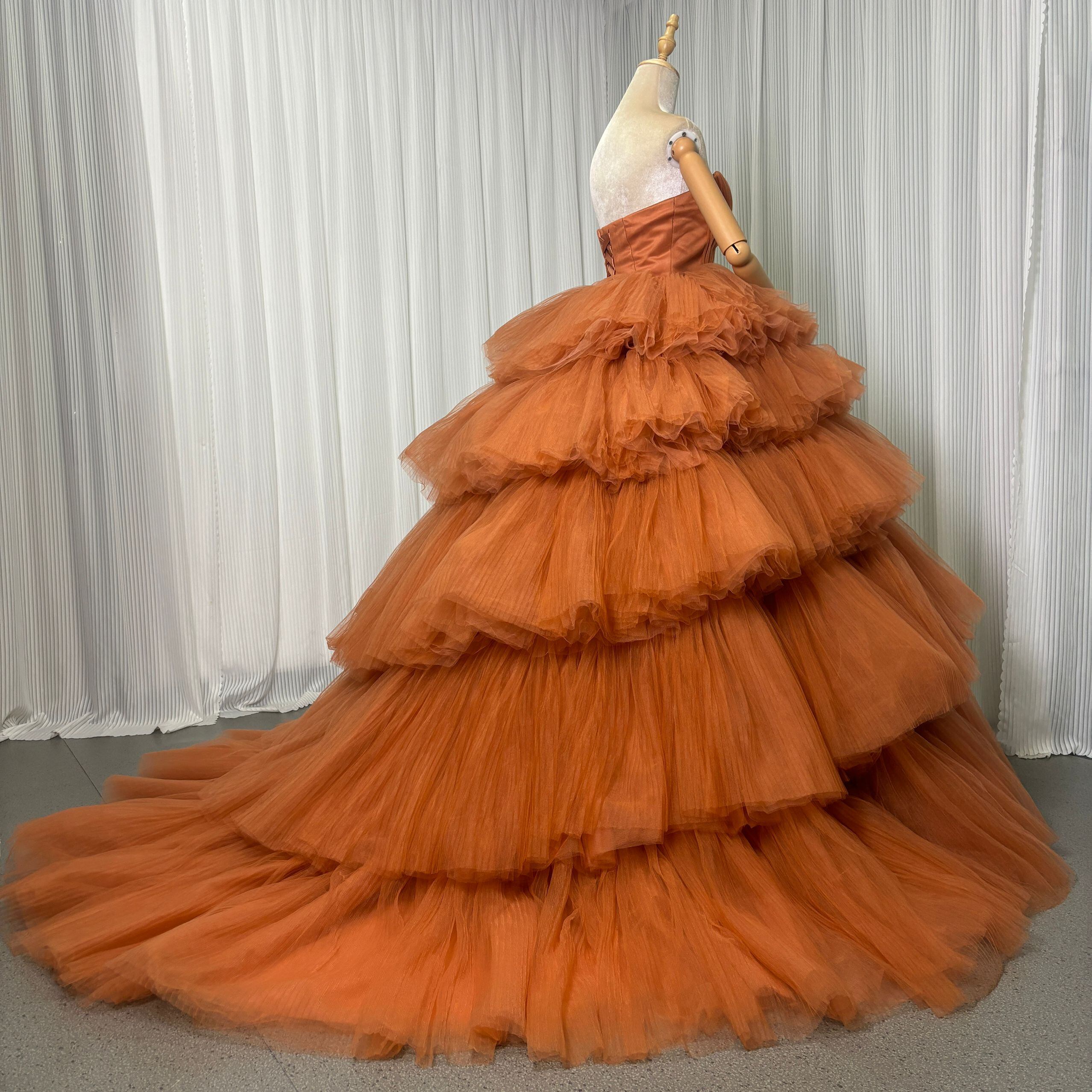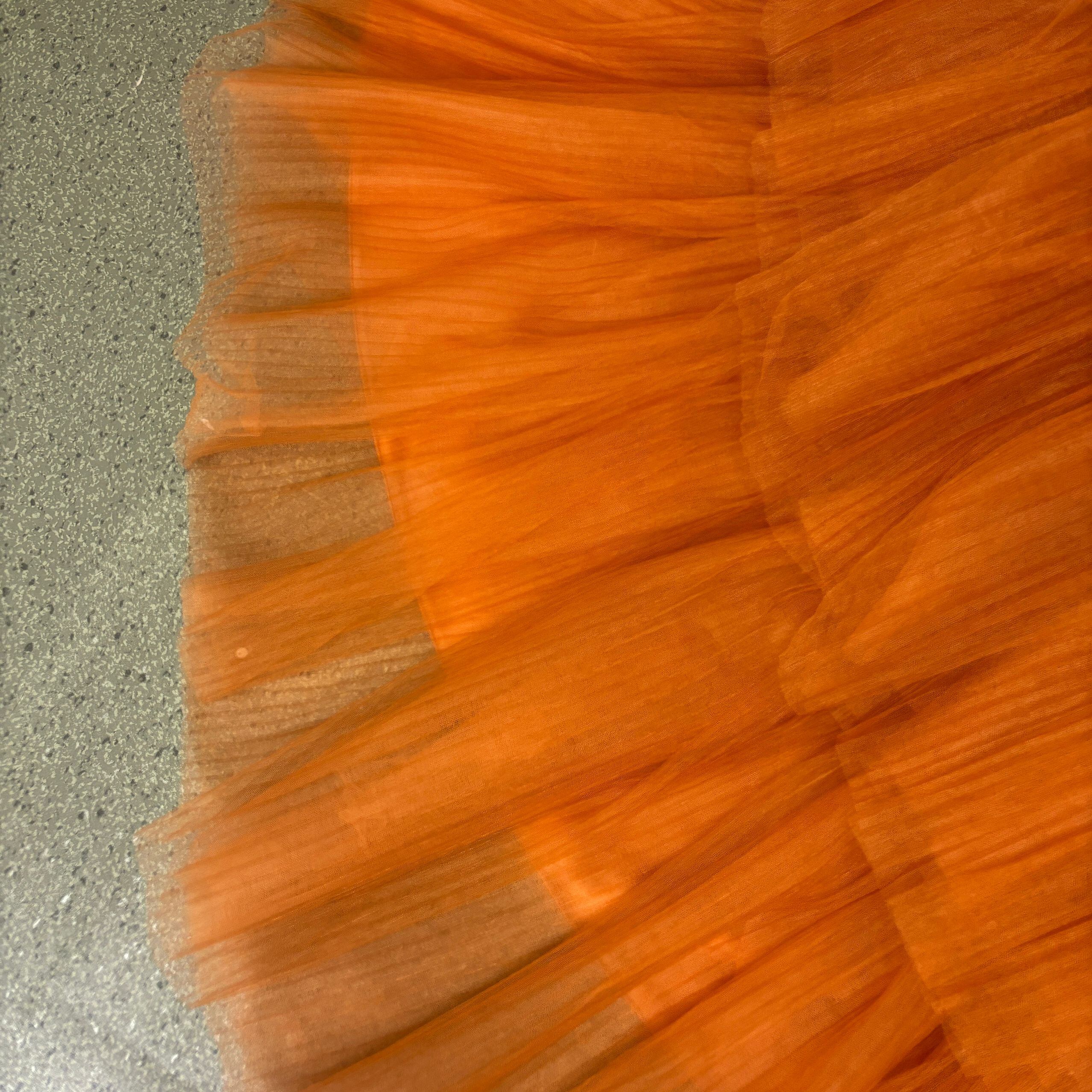 上品 オレンジ ベアトップ カラードレス 柔らかく重ねたチュールスカート ロングトレーン 2次会 花嫁 挙式