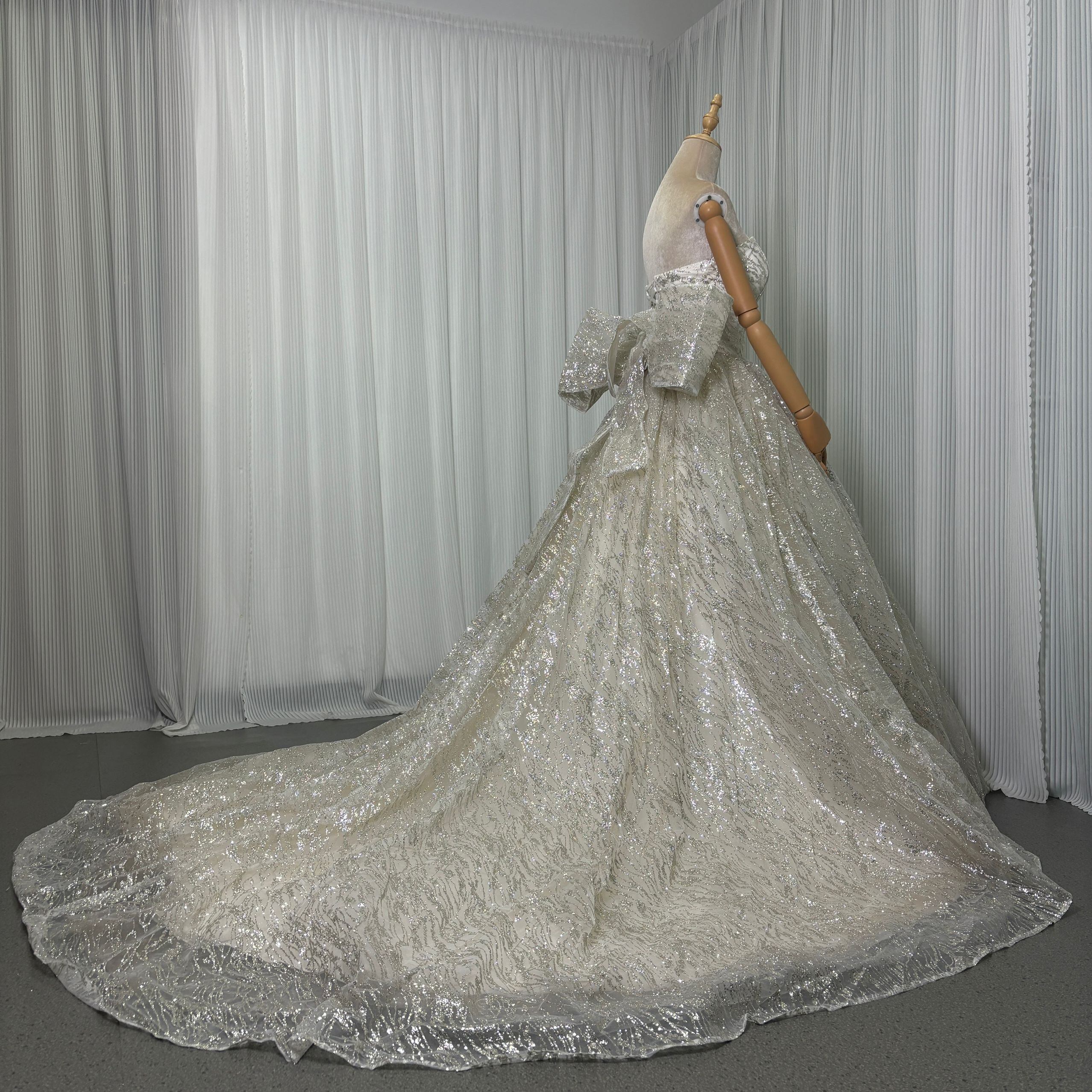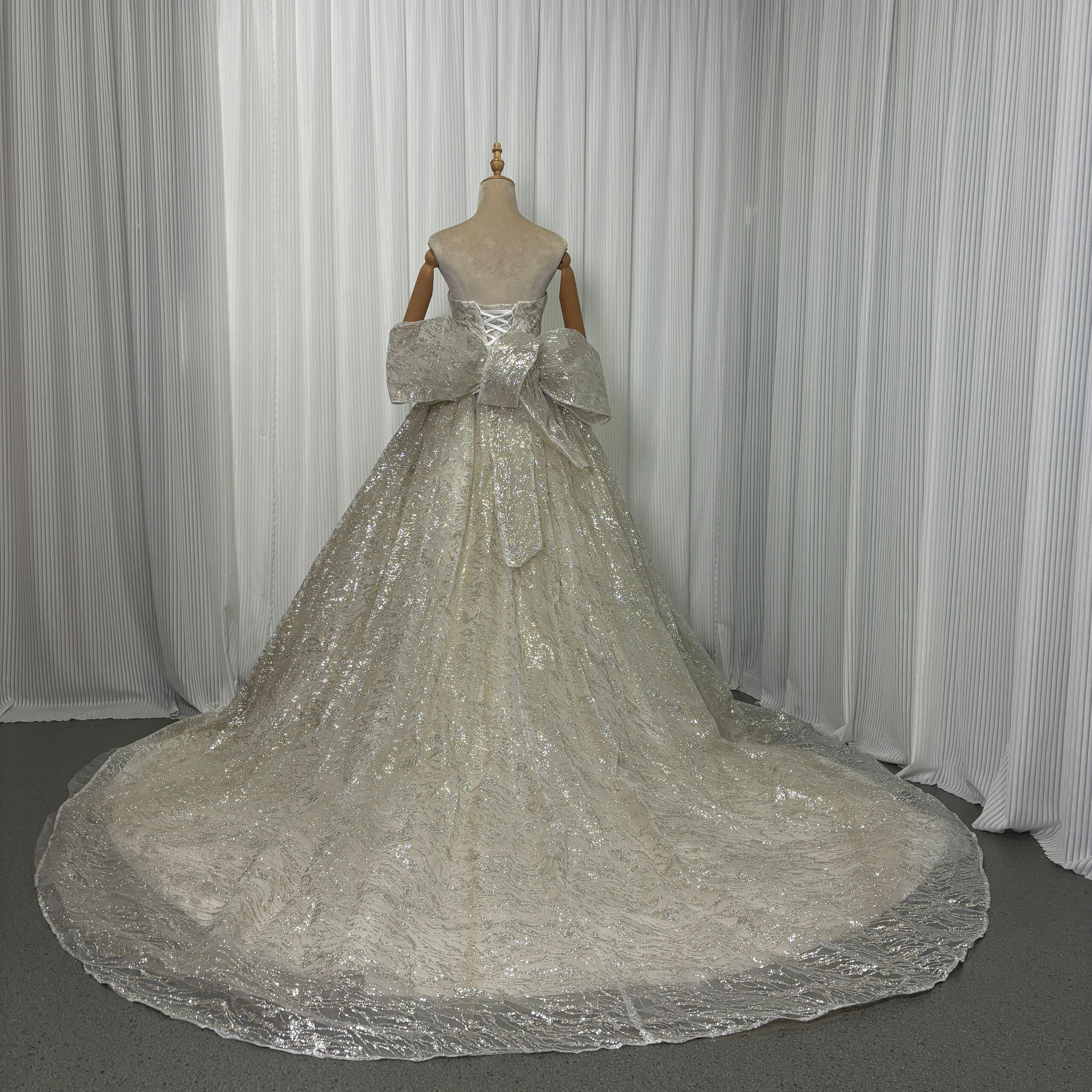 送料無料!オフホワイト キラキラチュール レース刺繍たっぷり ウエディングドレスふっくら柔らかなバックリボン 華やかなトレーン