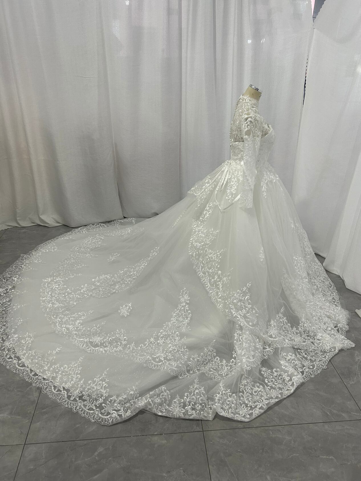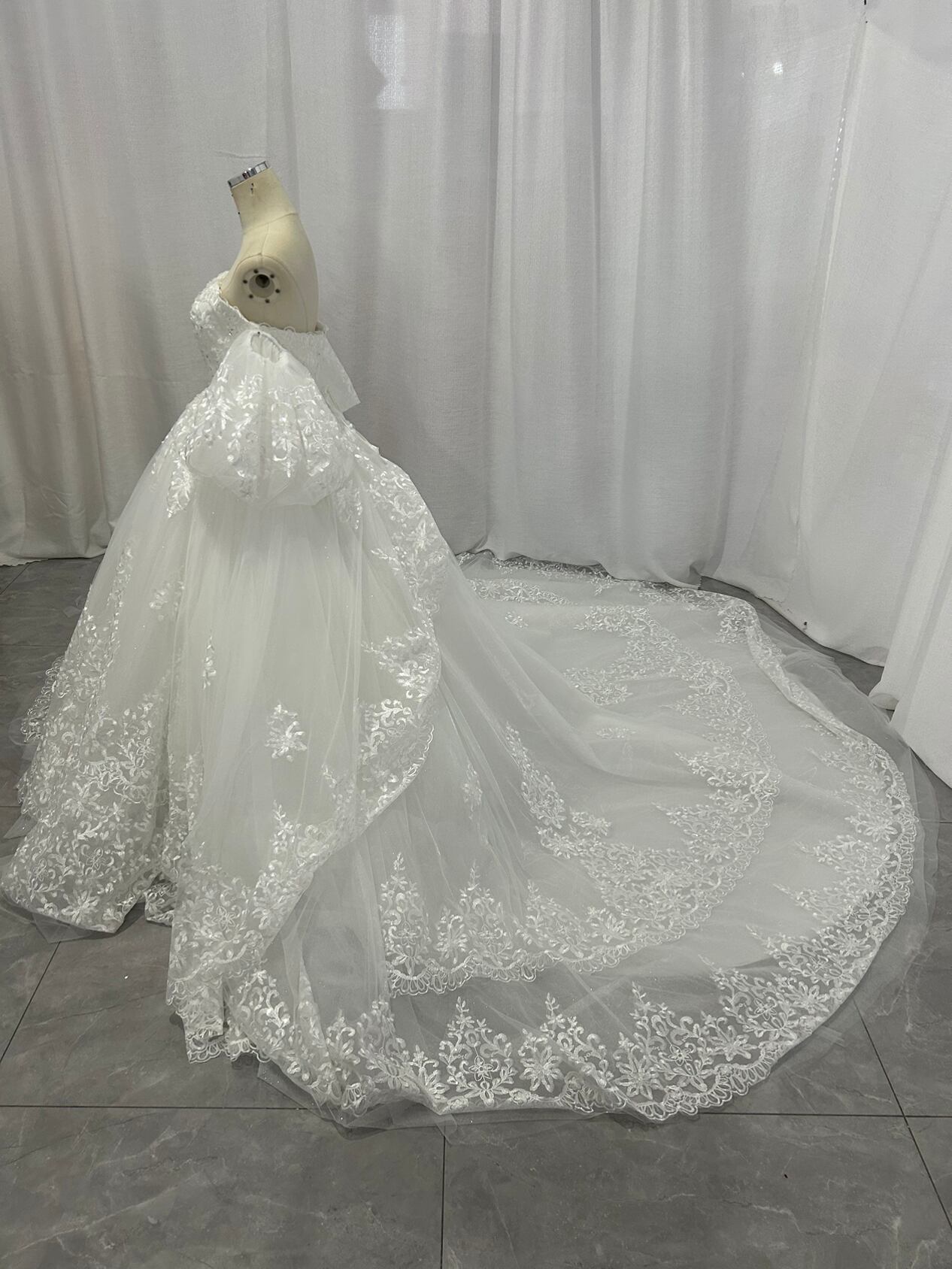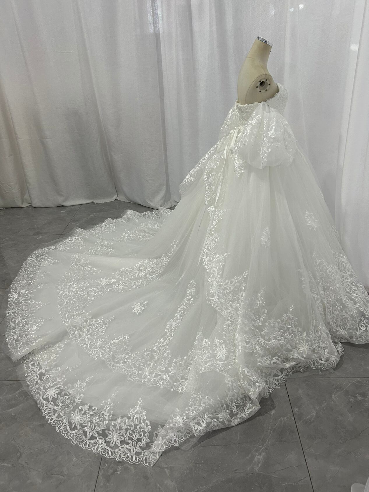送料無料!オフホワイト レース刺繍たっぷり ウエディングドレス 華やかなトレーン+ 3D立体レース刺繍トッ トップ