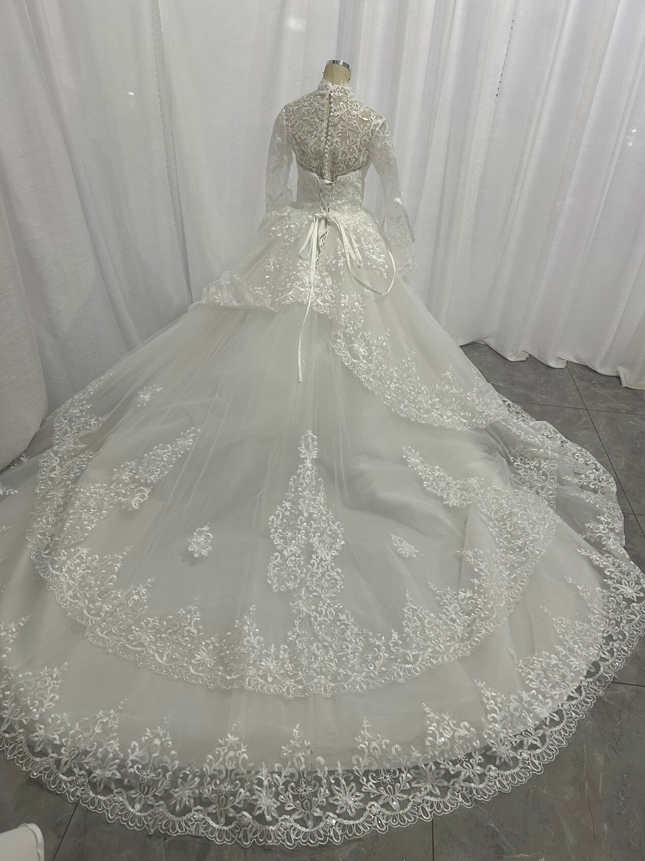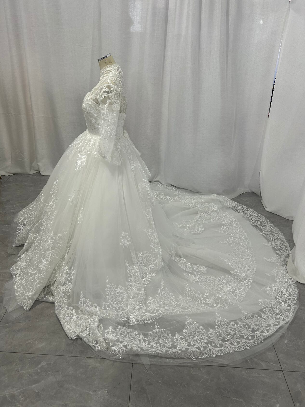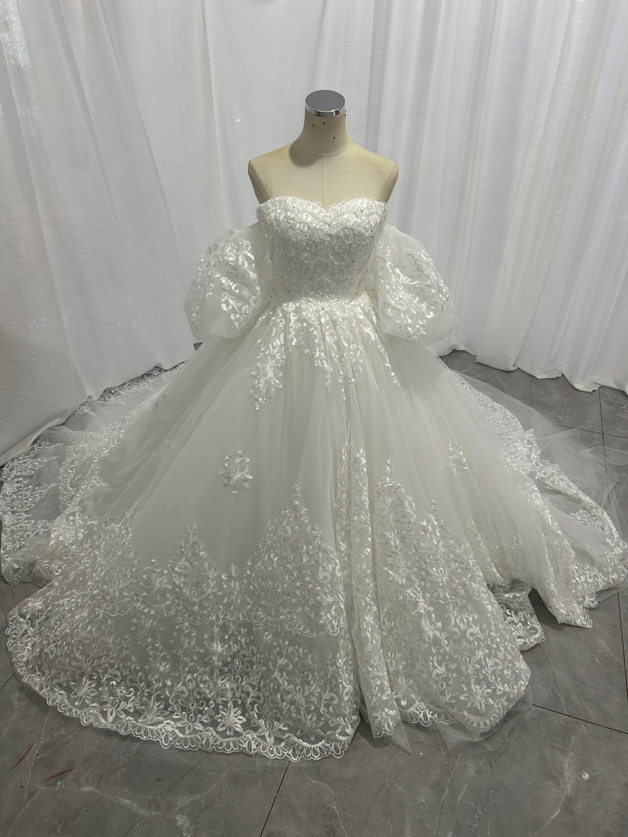 送料無料!オフホワイト レース刺繍たっぷり ウエディングドレス 華やかなトレーン+ 3D立体レース刺繍トッ トップ