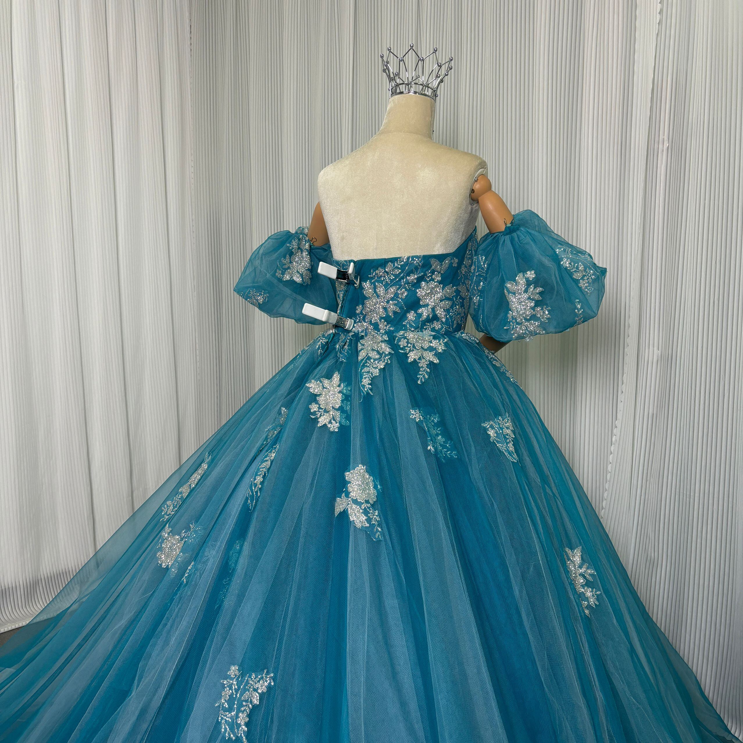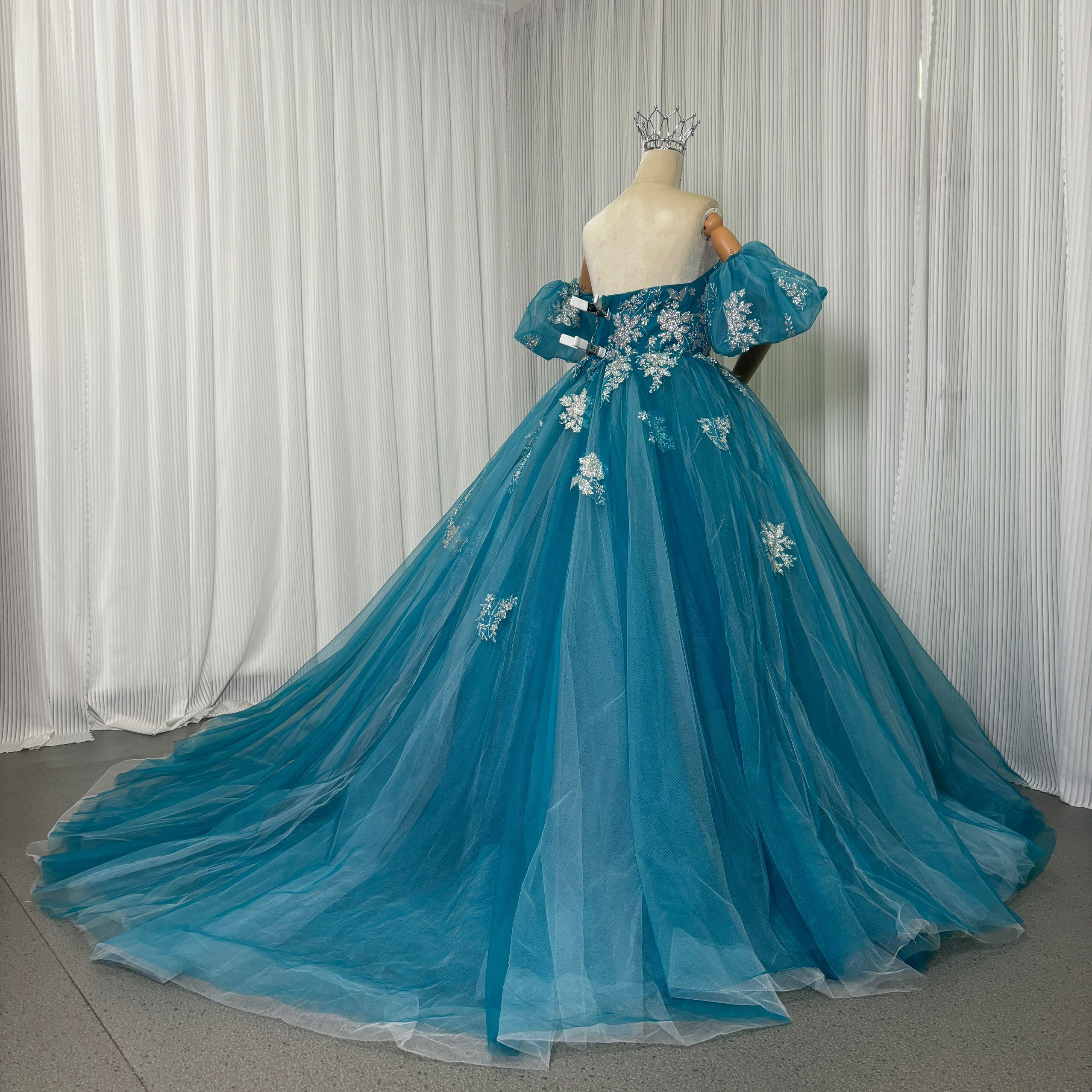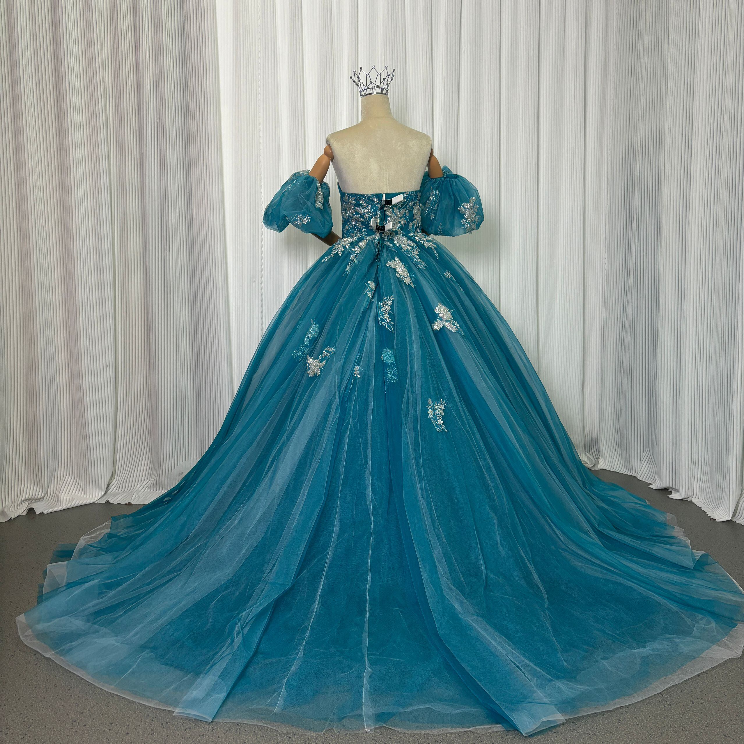 上品 青 ベアトップ カラードレス ラッパ袖 魅惑の花レース 華やかなトレーン 2次会 花嫁 挙式