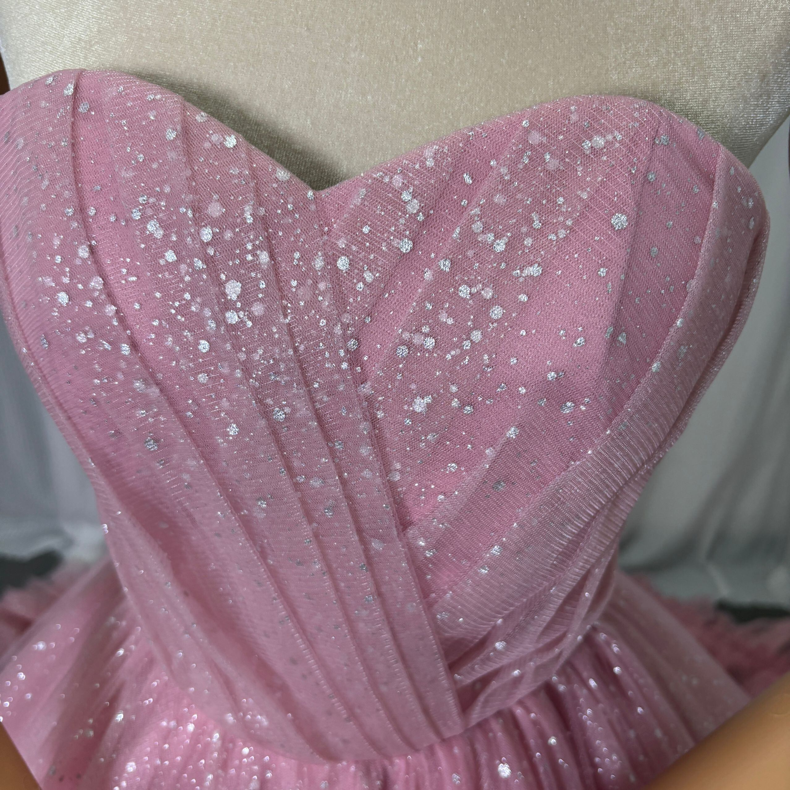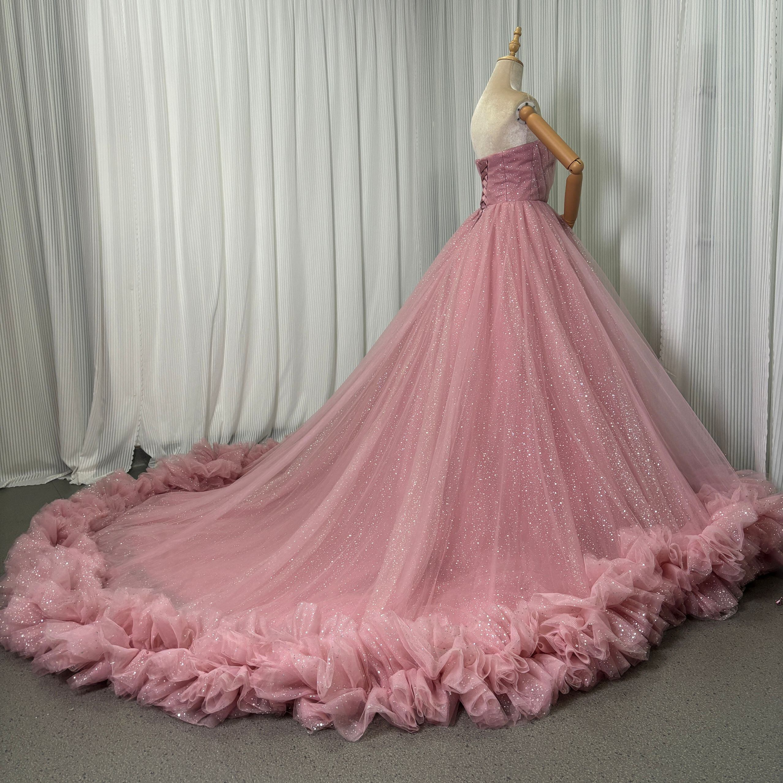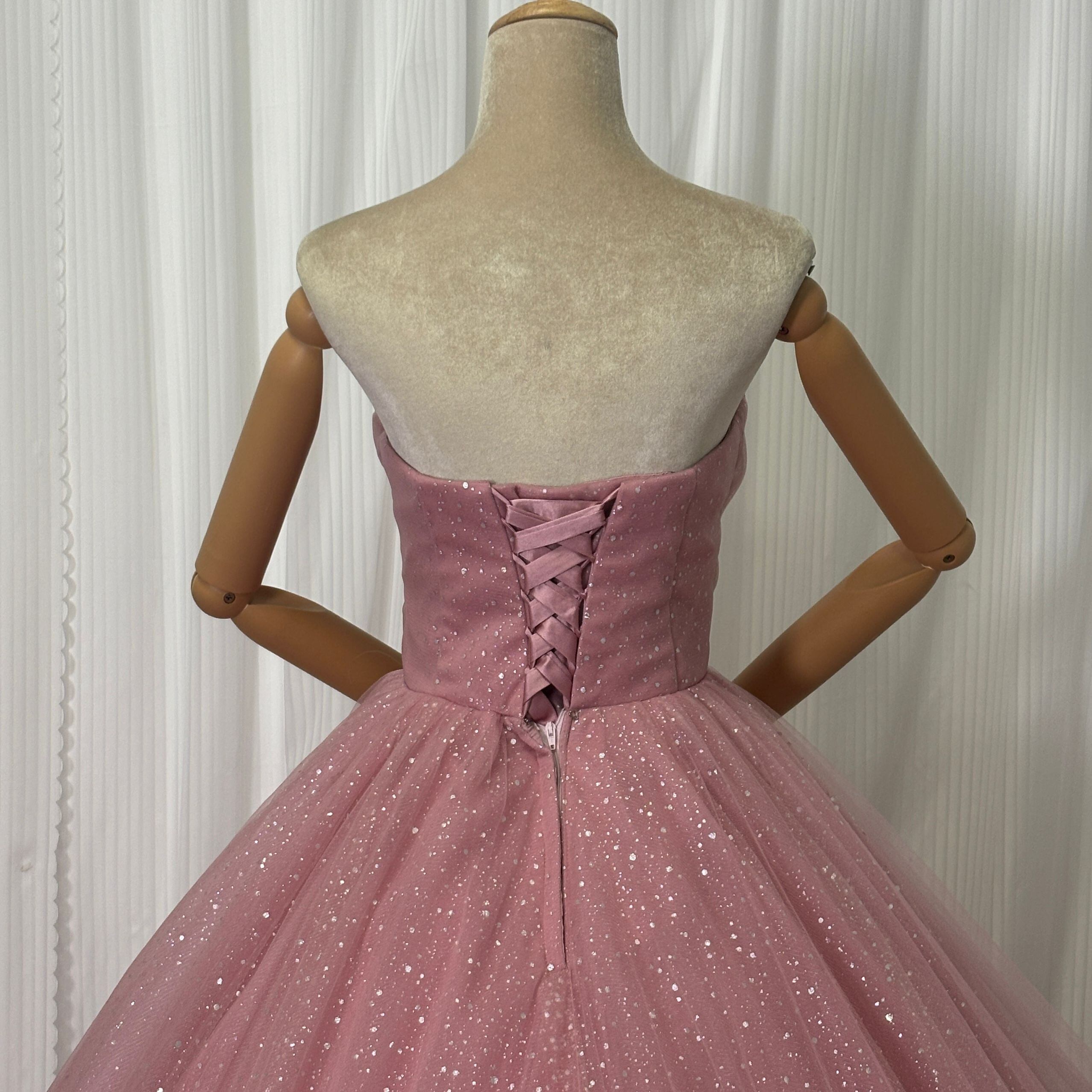 輝きな光彩を放つ ベアトップ ピンク カラードレスキラキラチュール裾に繊細レースをあしらった華やかなトレーン