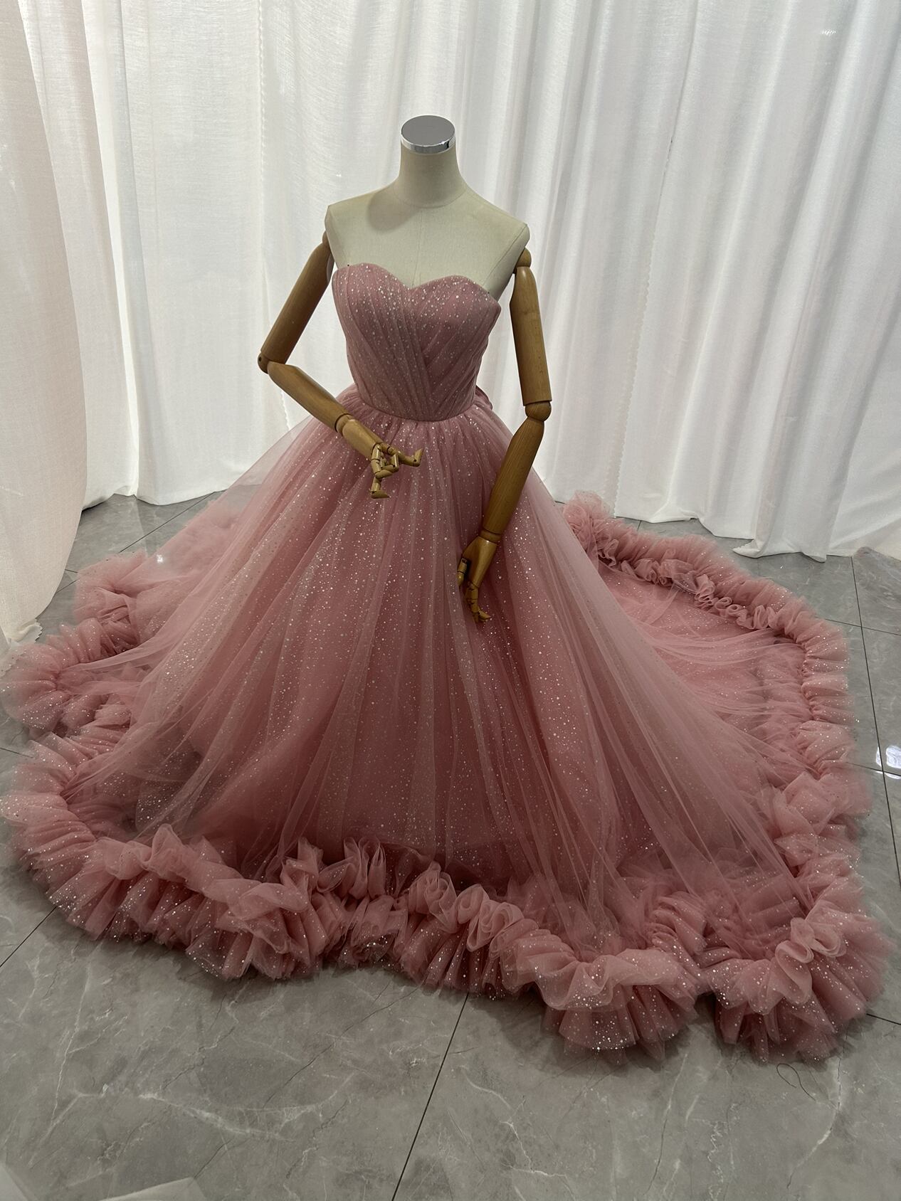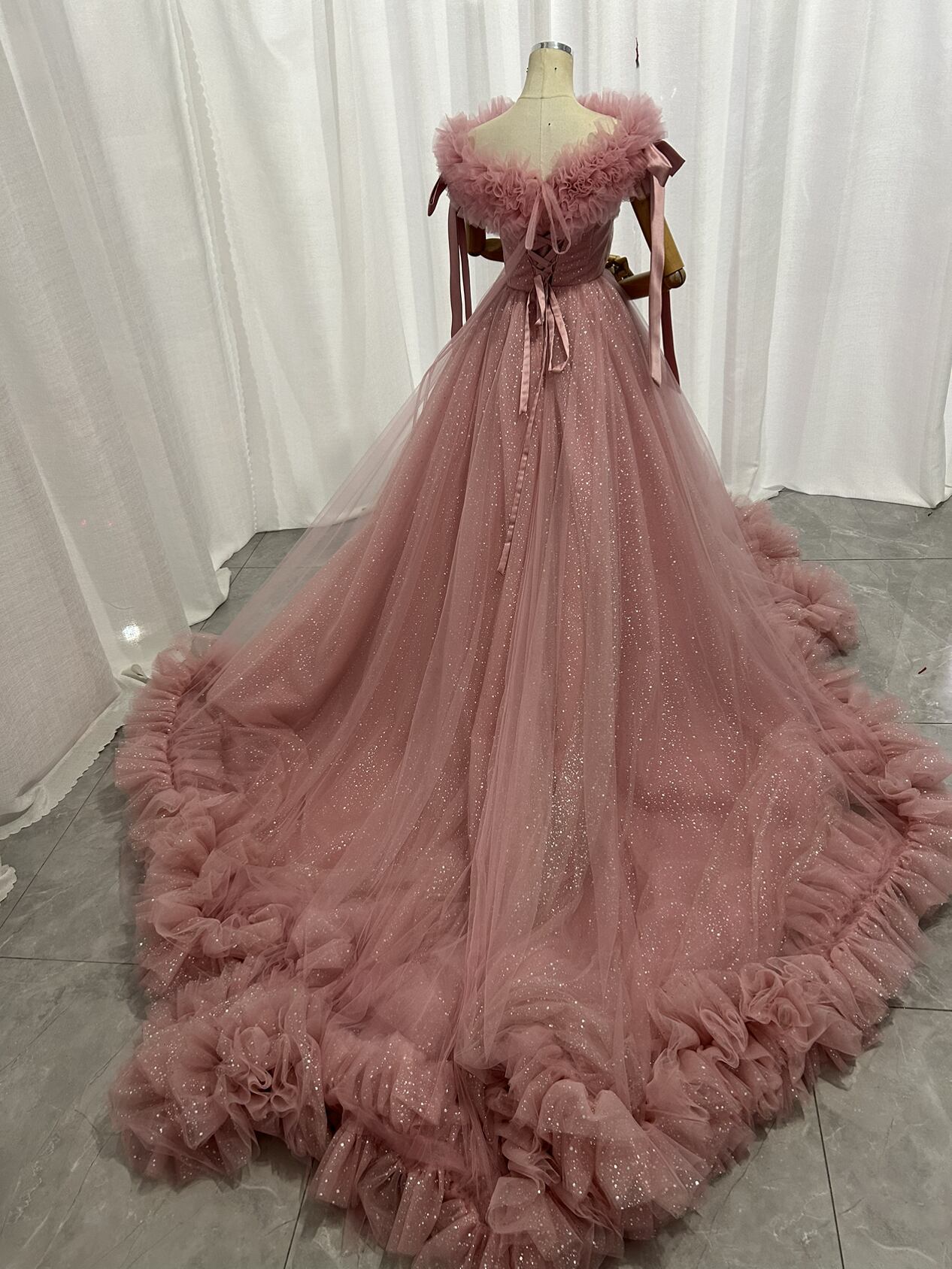 輝きな光彩を放つ 取り外しオフショルダー リボン ピンク カラードレスキラキラチュール裾に繊細レースをあしらった華やかなトレーン