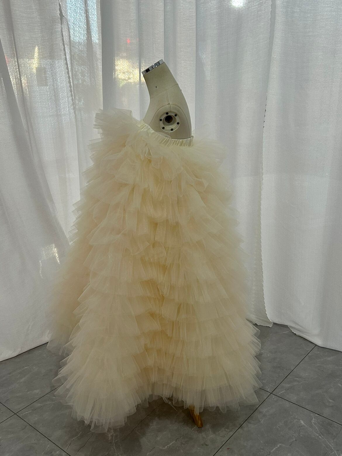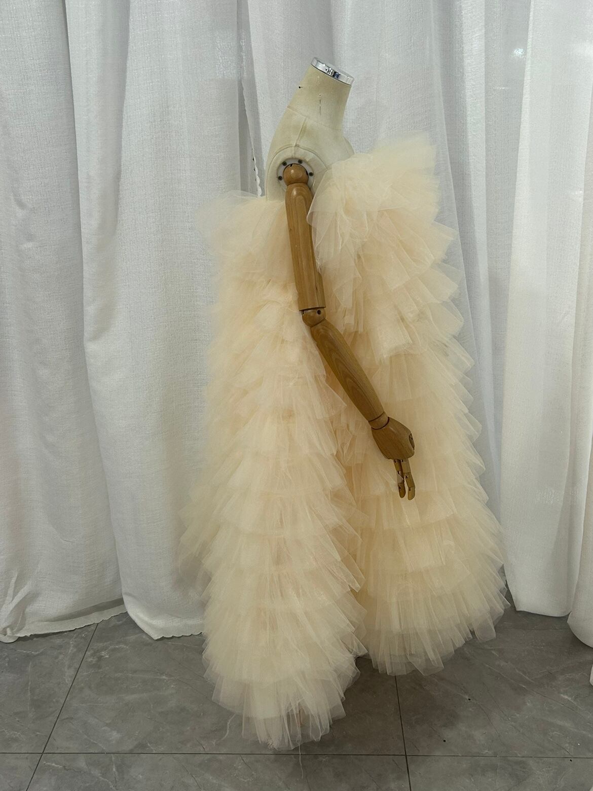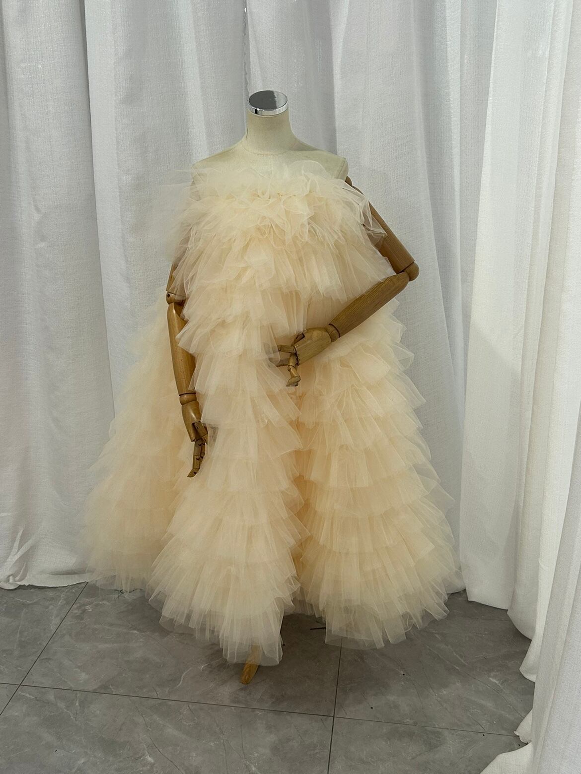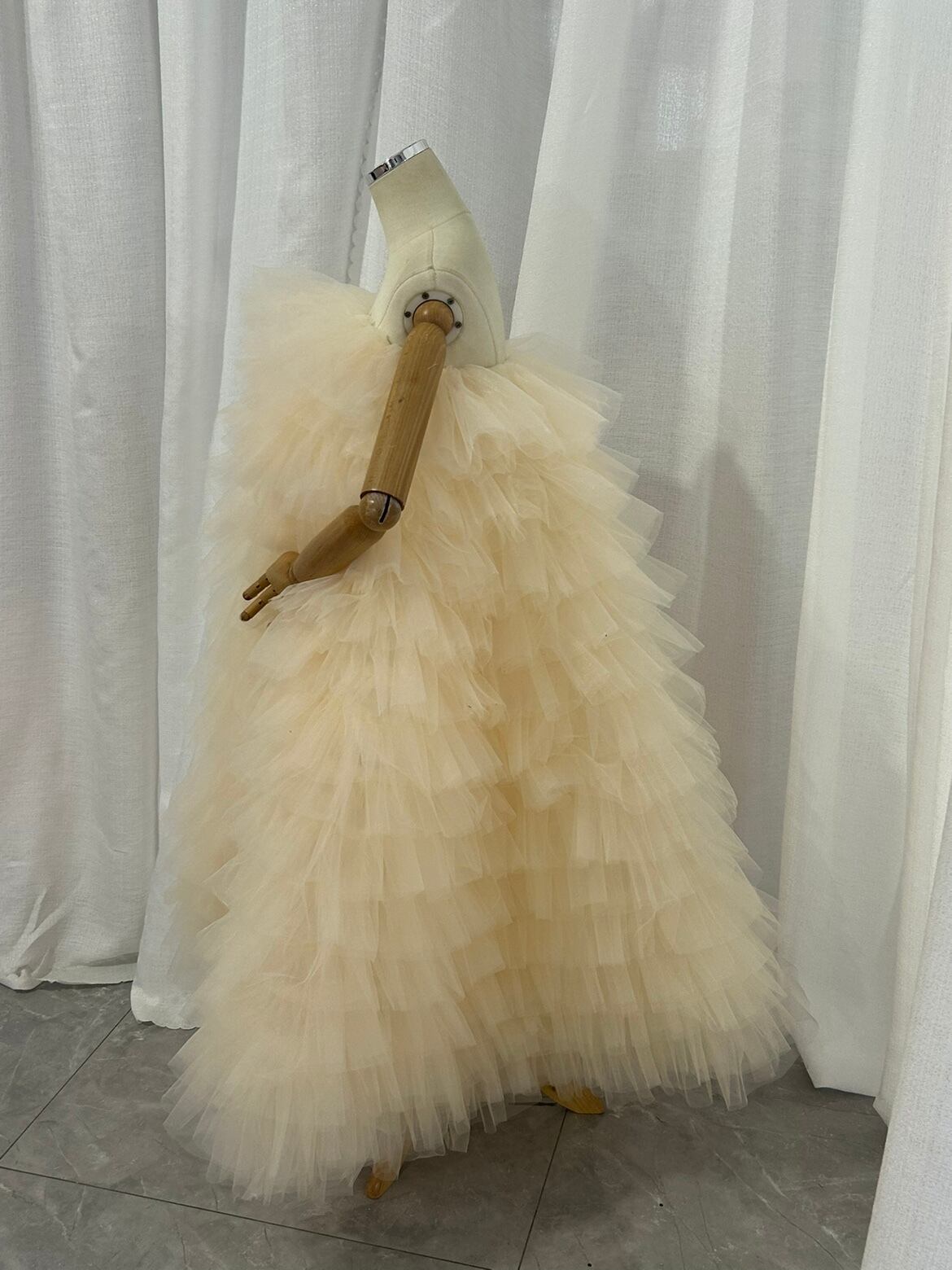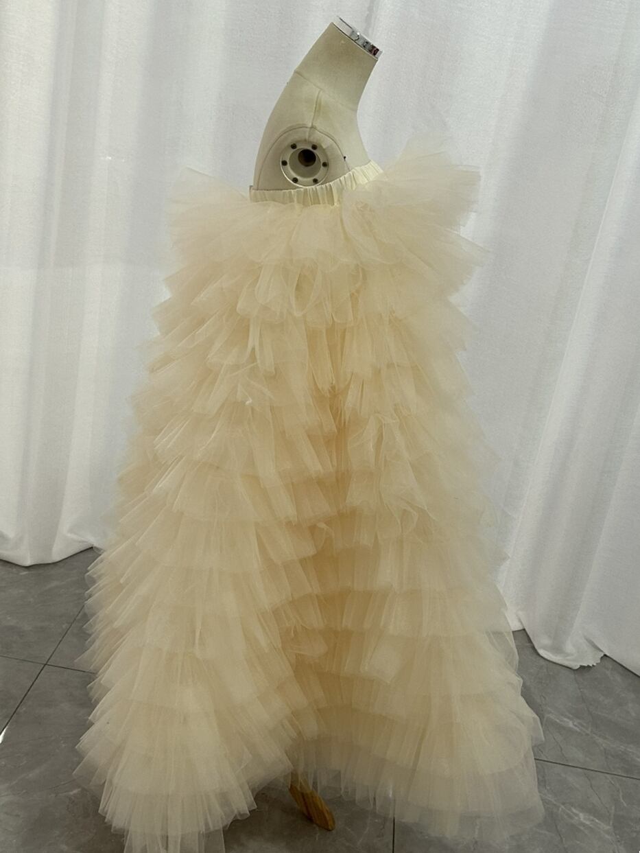 もこもこ カラードレス シャンパン色 2way チュールドレス フリルオフショルダー お色直しふわふわ もこもこドレスチュールドレス結婚式 前撮り 披露宴 | David1021k Dress(ダヴィドレス)