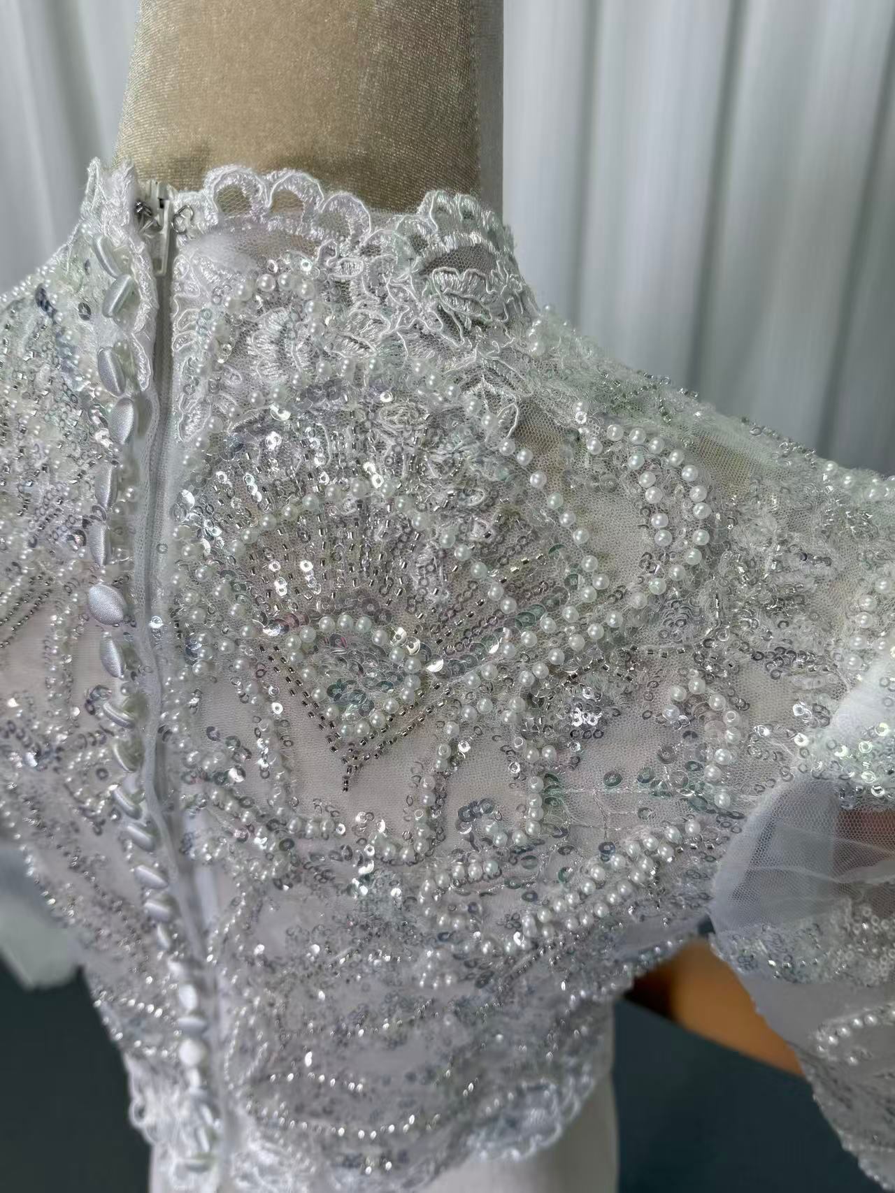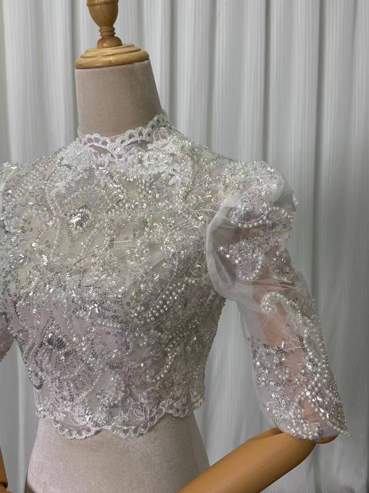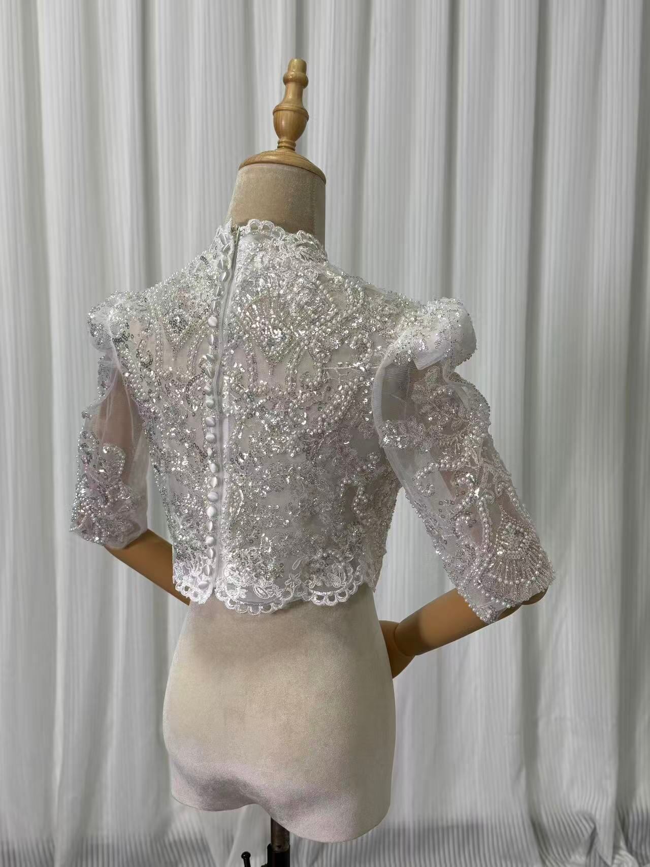 美品! キラキラのハンドビーディング ウエディングドレス チャイナドレス襟 ボレロ 3D立体レース刺繍 七分袖丈