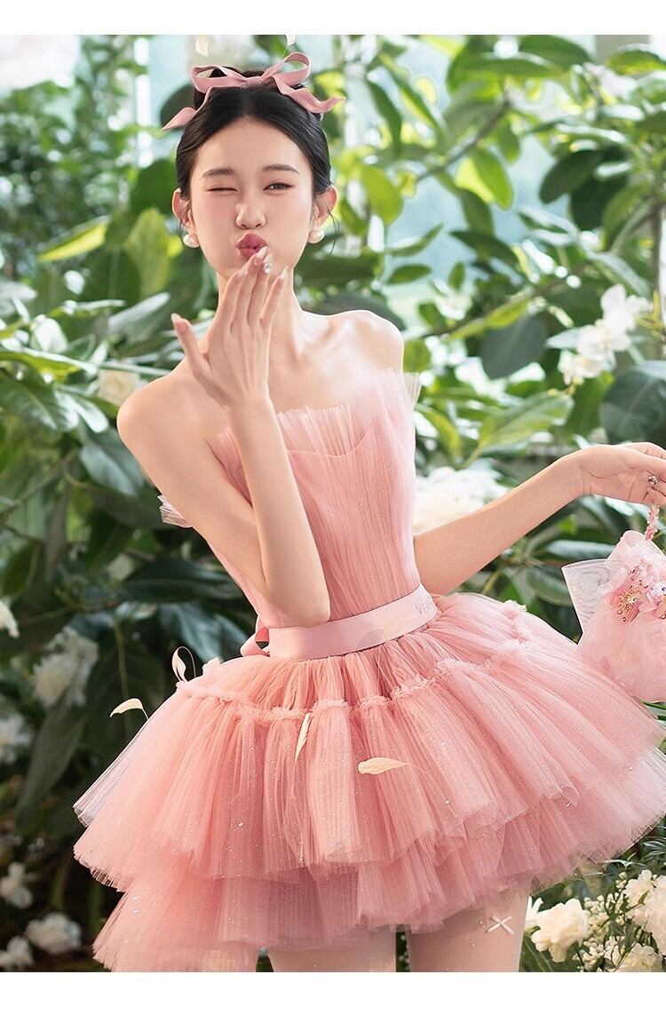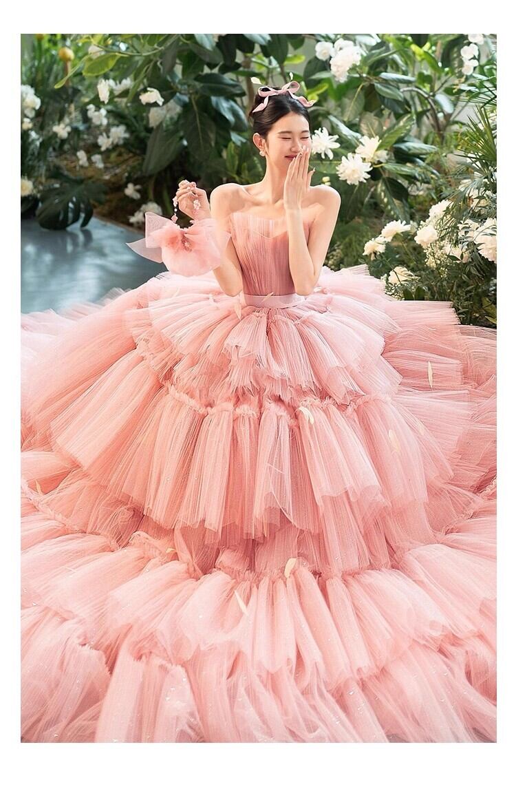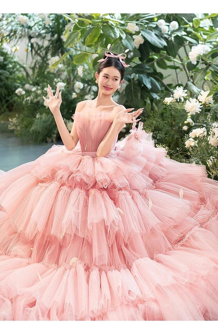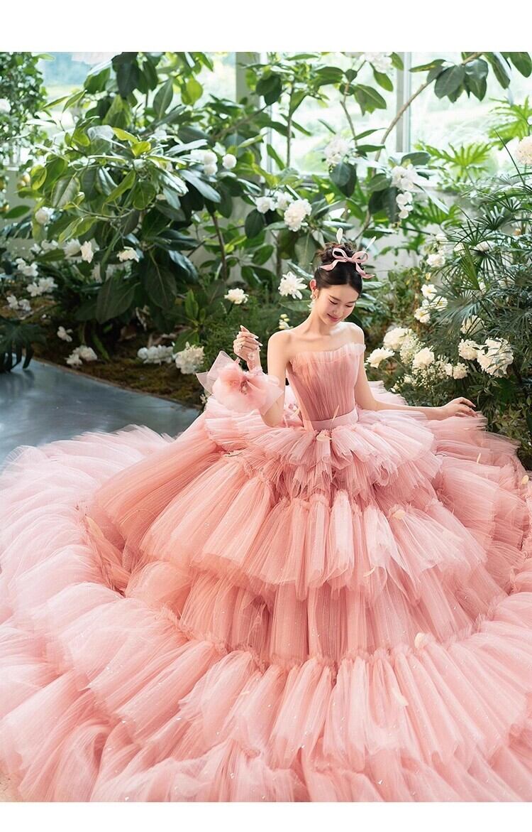 韓国風もこもこ ピンク カラードレス チュールドレス フリルオフショルダー お色直しふわふわもこもこドレスチュールドレス