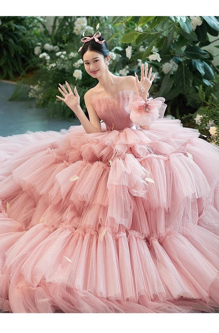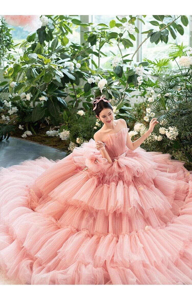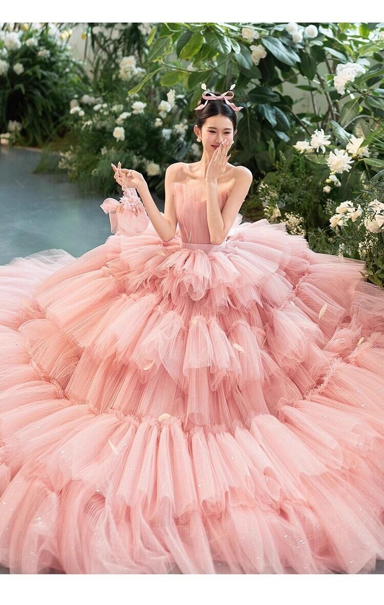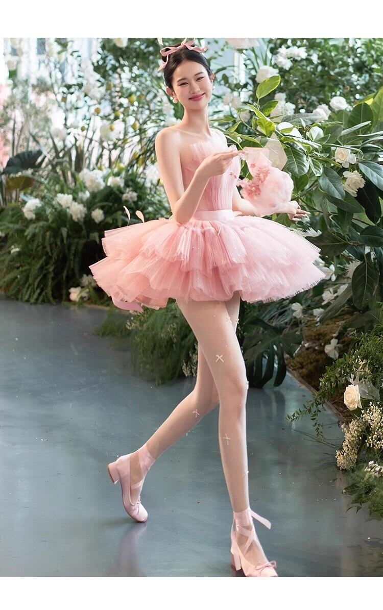 韓国風もこもこ ピンク カラードレス チュールドレス フリルオフショルダー お色直しふわふわもこもこドレスチュールドレス