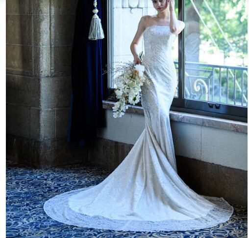 贅沢な総レース ベアトップ ウエディングドレス ソフトマーメイドライン 華やかなトレーンビジュードレス 結婚式 前撮り 披露宴
