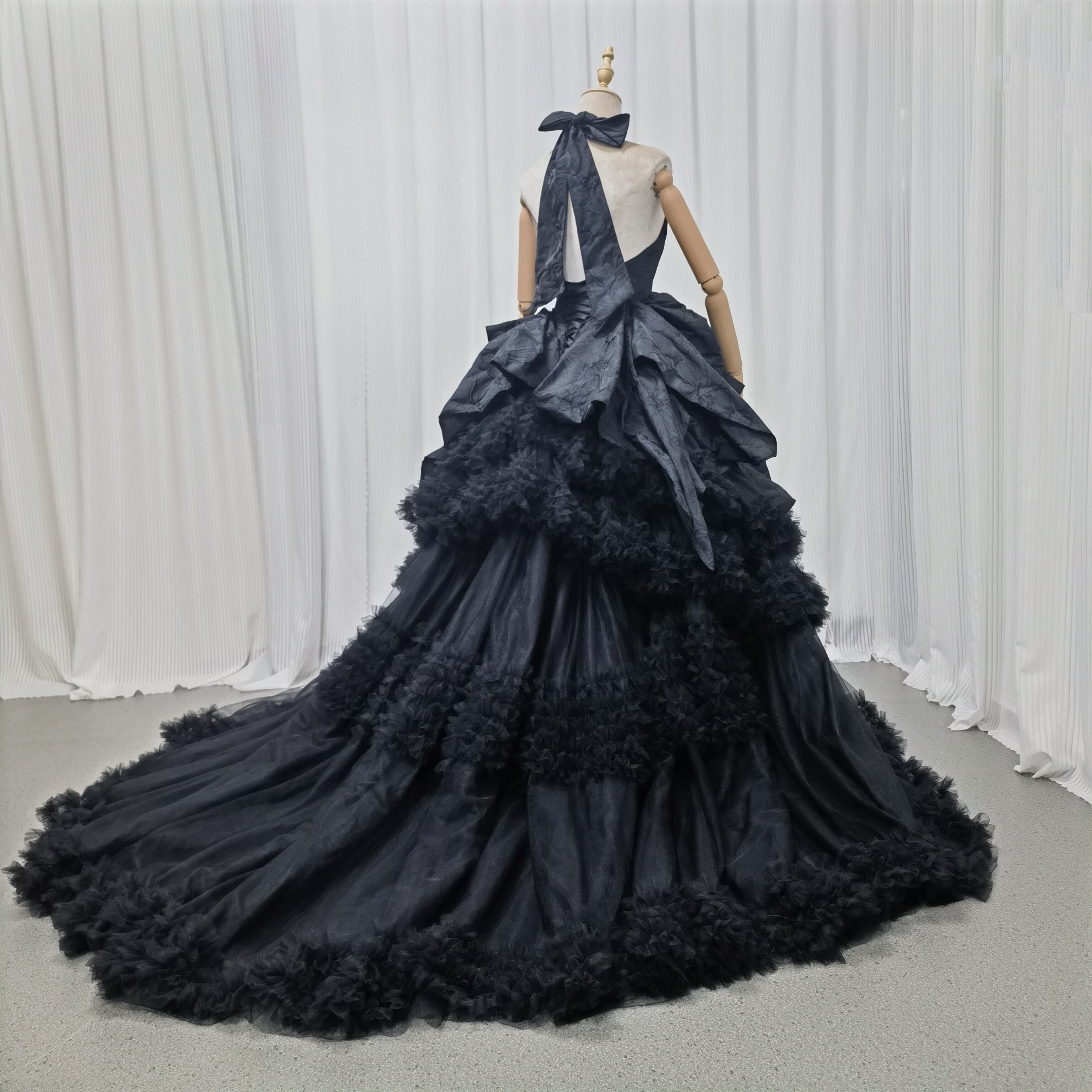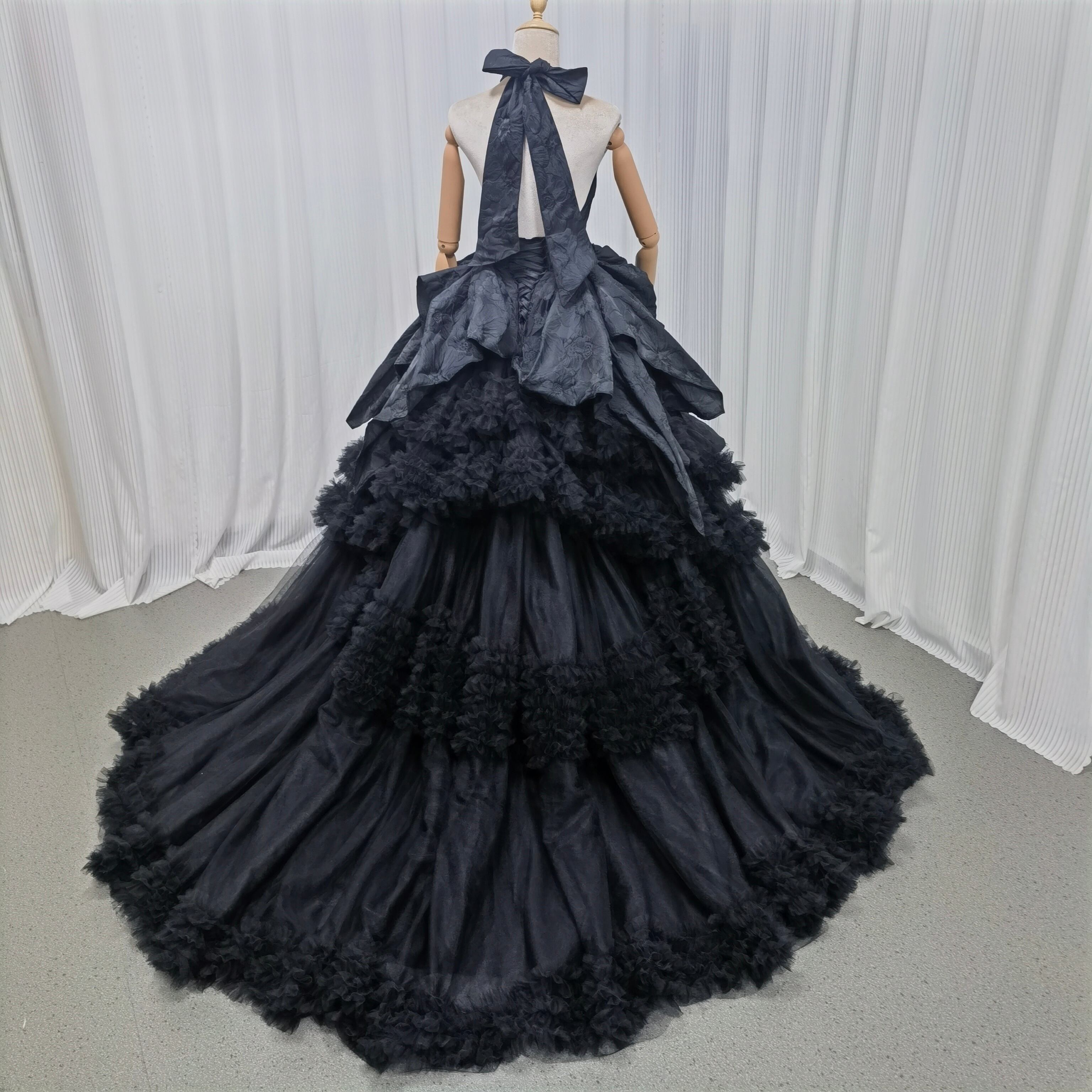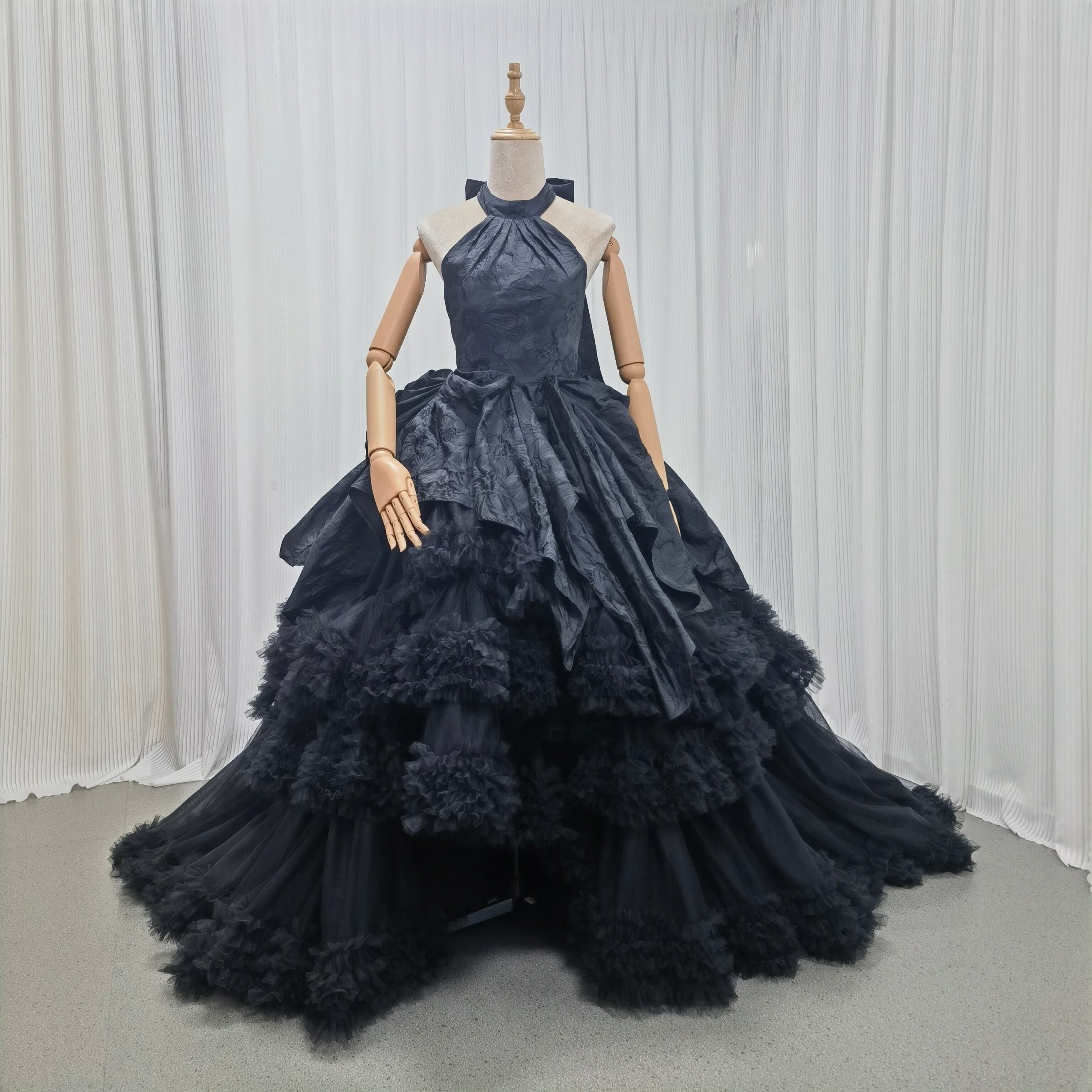 黒色 ホルターネック カラードレス韓国風ドレス チュールドレス もこもこフリルドレス ボリューミーフレアスカート 前撮り