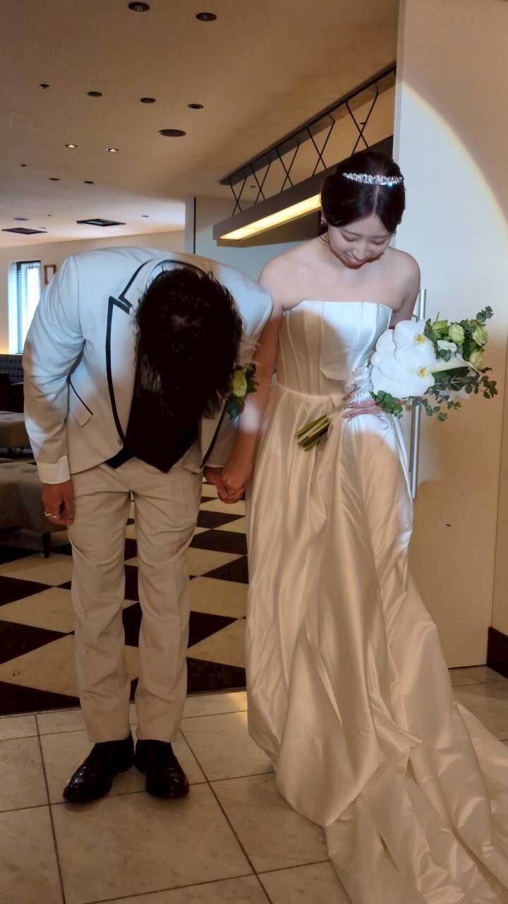 実例写真 ! ベアトップ 光沢サテン ウエディングドレス 華やかなトレーンビジュードレス 結婚式 前撮り 披露宴