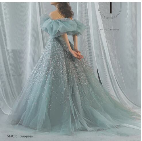 上品 ブルーグレー 取り外しオフショルダー カラードレス 魅惑の花レース ソフトチュール 2次会 花嫁 挙式