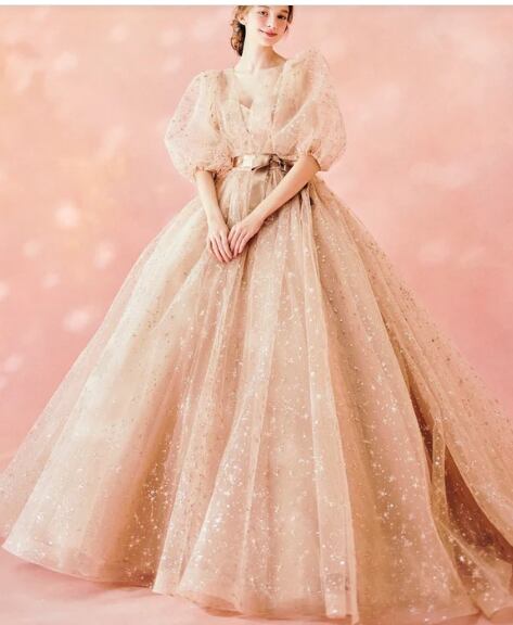 上品 シャンパン色 カラードレス キラキラチュール 姫袖 ソフトチュール 2次会 花嫁 挙式