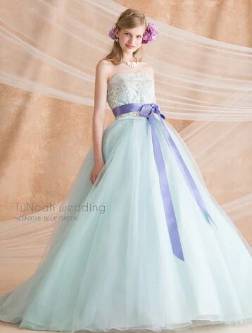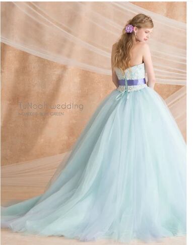 上品 水色 ベアトップ カラードレス 枝花刺繍 ソフトチュール 2次会 花嫁 挙式