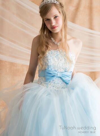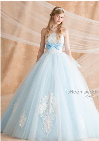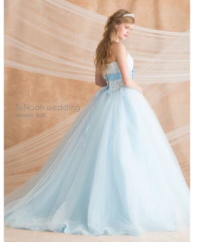 水色 ベアトップ カラードレス 枝花刺繍 ソフトチュール ふっくら柔らかなバックリボン 2次会 花嫁 挙式