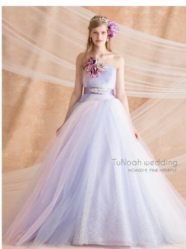 紫 のグラデーション ベアトップ カラードレス 枝花刺繍 ソフトチュール ふっくら柔らかなバックリボン 2次会 花嫁 挙式