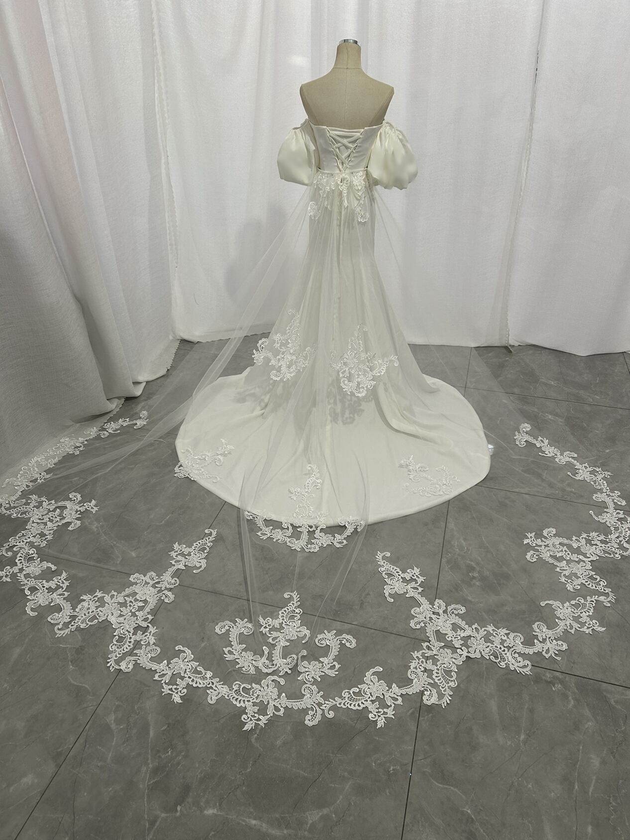 美品! 取り外し袖 ウエディングドレス クレープ生地 + 上品レース 華やかなトレーン 結婚式 前撮り 披露宴