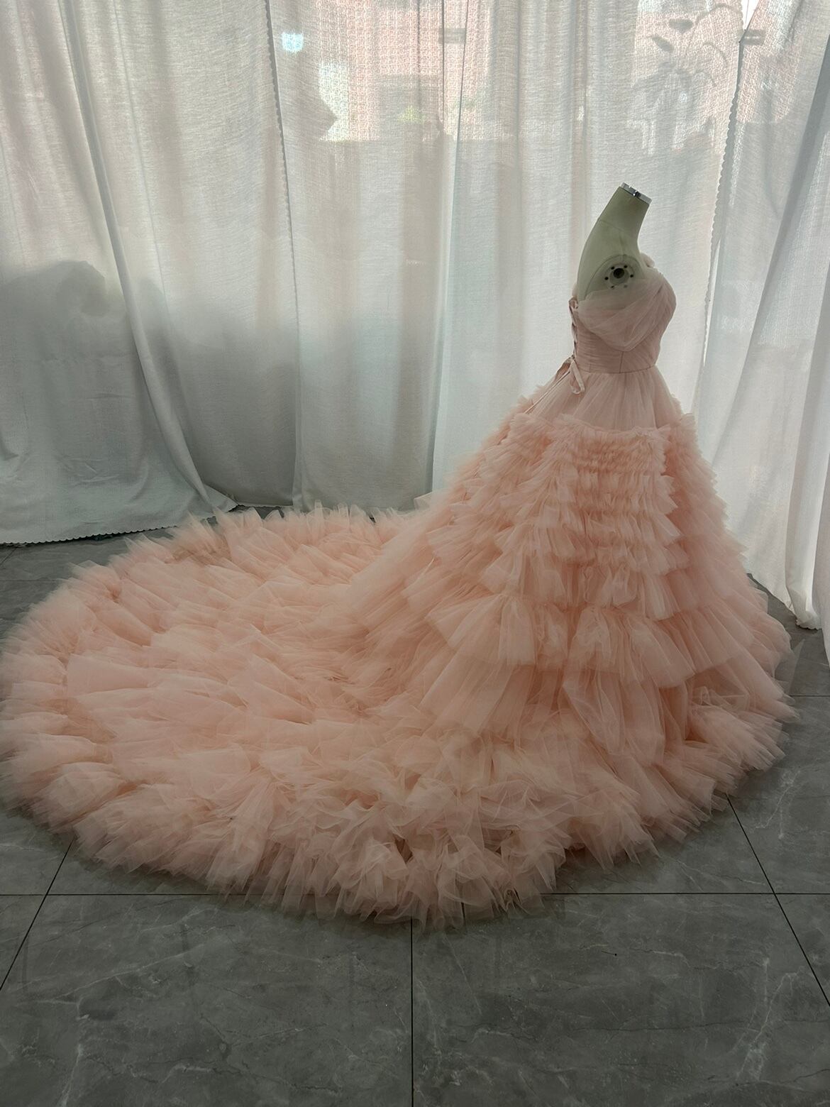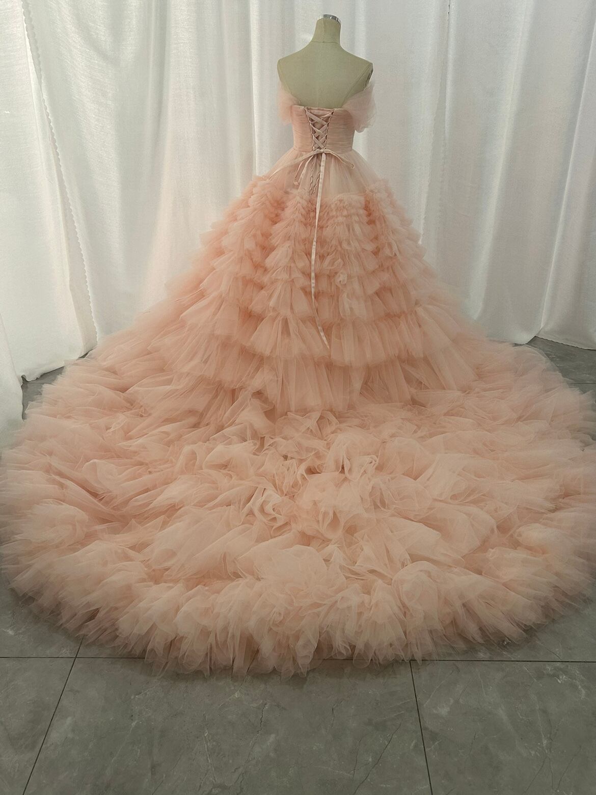 ピンク カラードレス 韓国風ドレス チュールドレス もこもこフリルドレス ボリュームドレスボリューミー華やかなトレーン