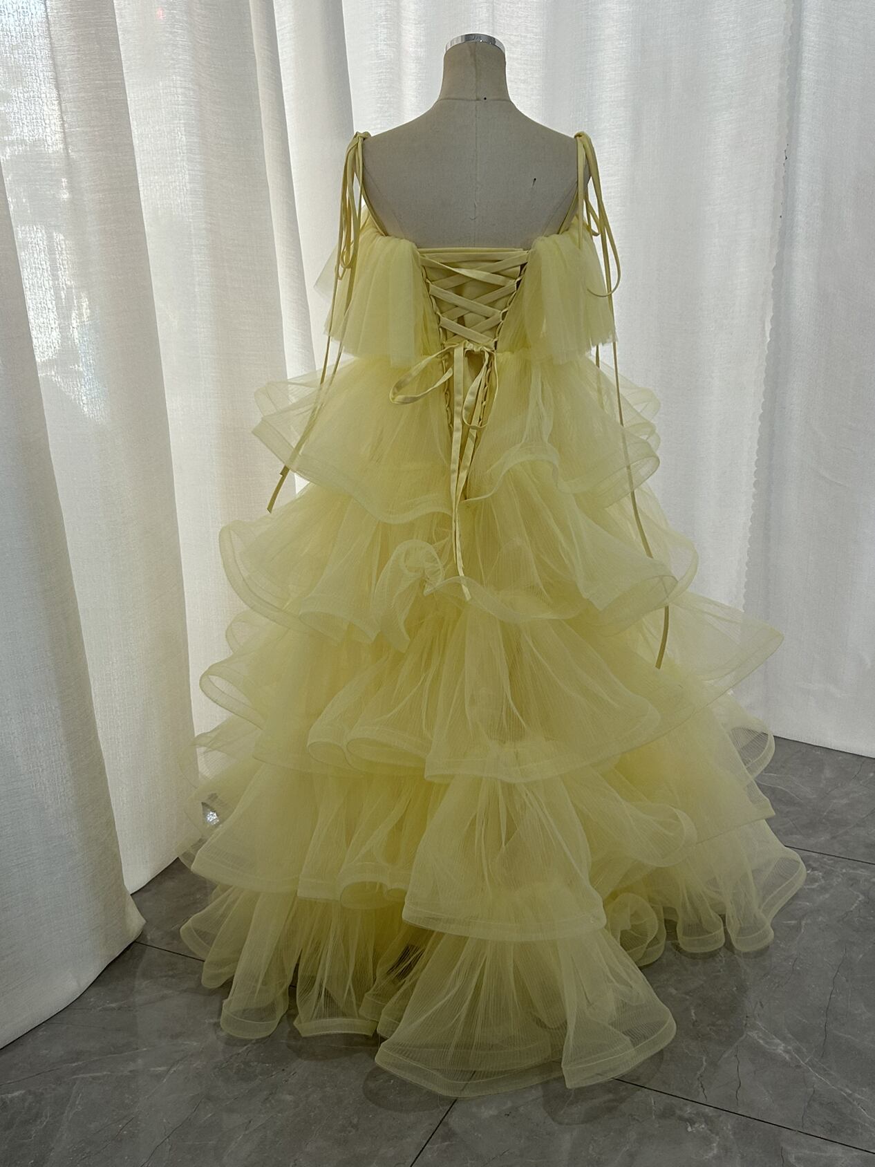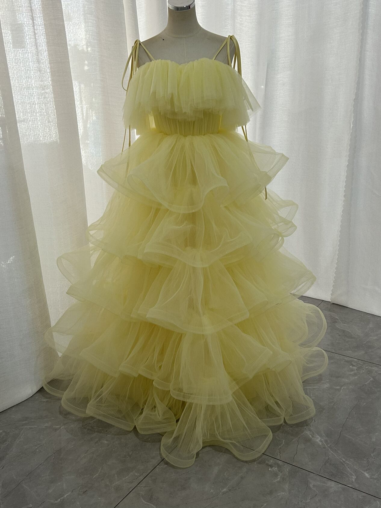 実例写真 !人気上昇 パステルイエロー ベアトップ カラードレス ソフトチュール 柔らかく重ねたチュールスカートフレアスカート