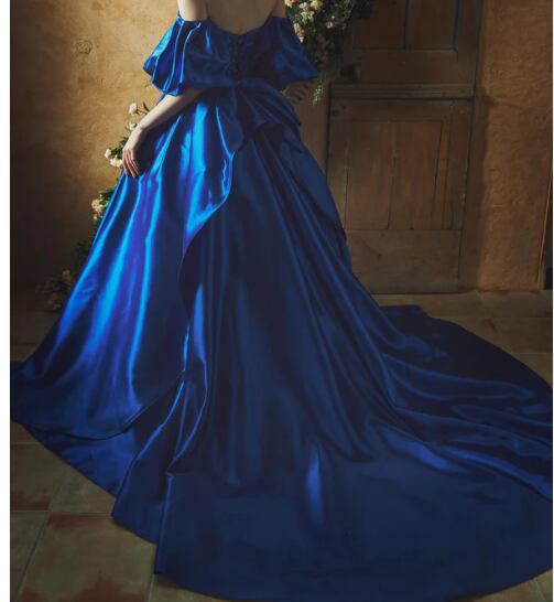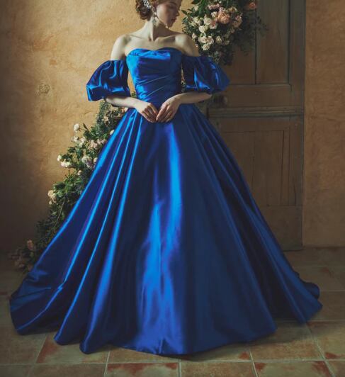 人気上昇!紺 光沢サテン 取り外し袖 カラードレス プリンセスライン 2次会 花嫁 挙式
