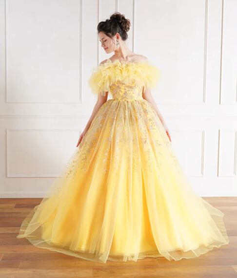 人気上昇!パステルイエロー 取り外しオフショルダー 3D立体レース刺繍 カラードレス ソフトチュール プリンセスライン 2次会 花嫁 挙式