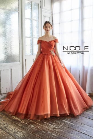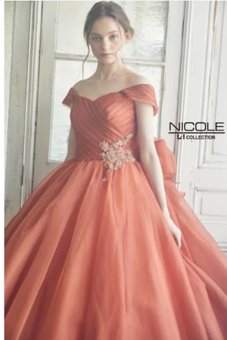 人気上昇!テラコッタ色 オフショルダー 光沢サテン カラードレスふっくら柔らかなバックリボン プリンセスライン 2次会 花嫁 挙式