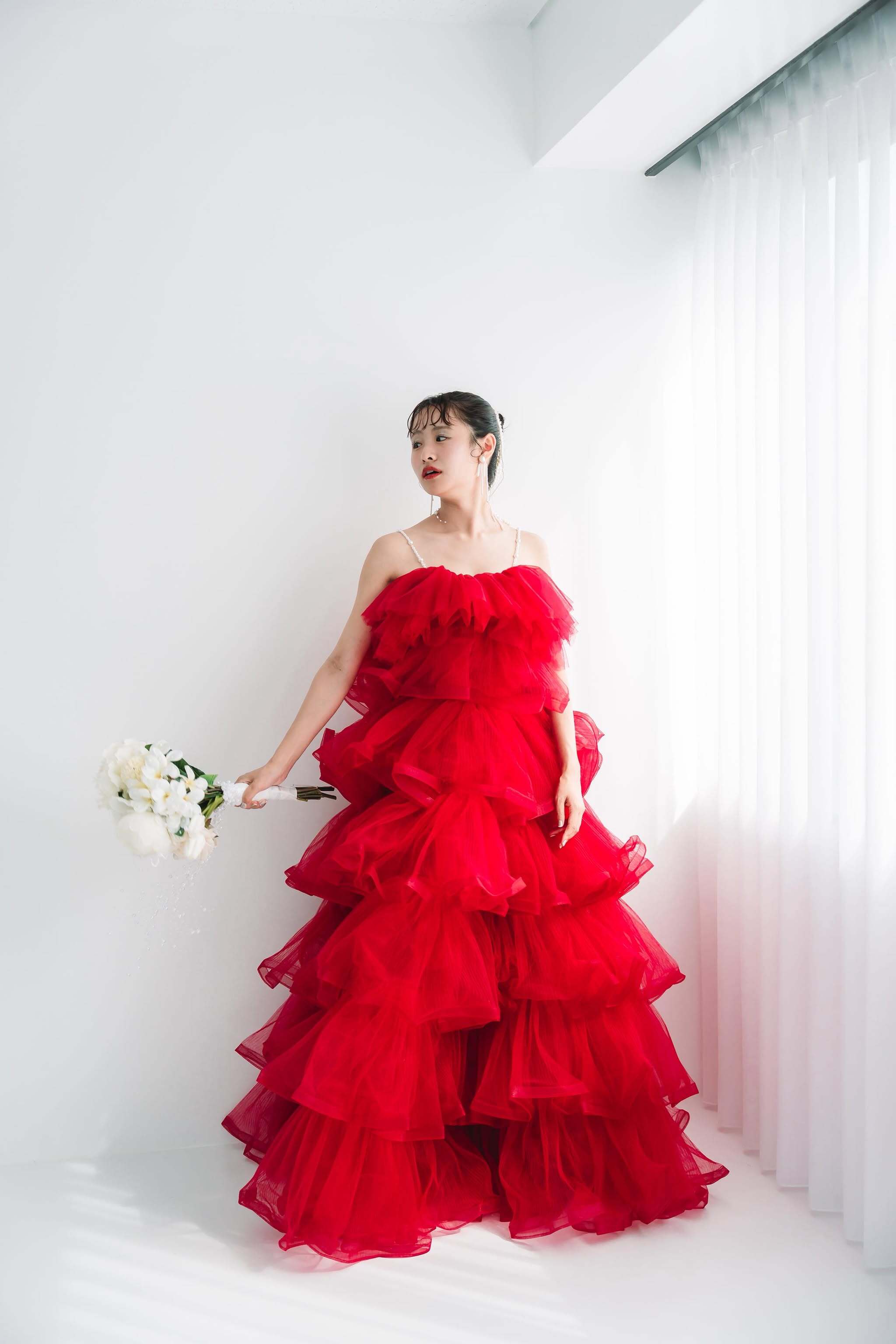 実例写真 !チェリーピンク パール カラードレス 柔らかく重ねたチュールスカート 抜群のおしゃれ見え 目立つ 前撮り 花嫁