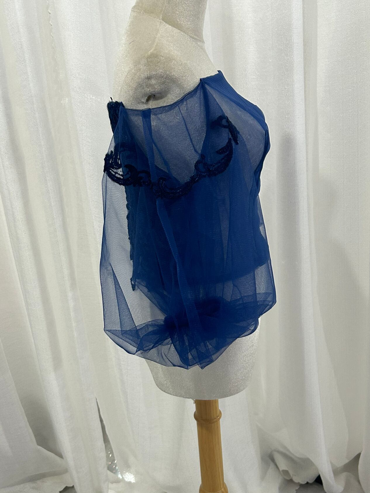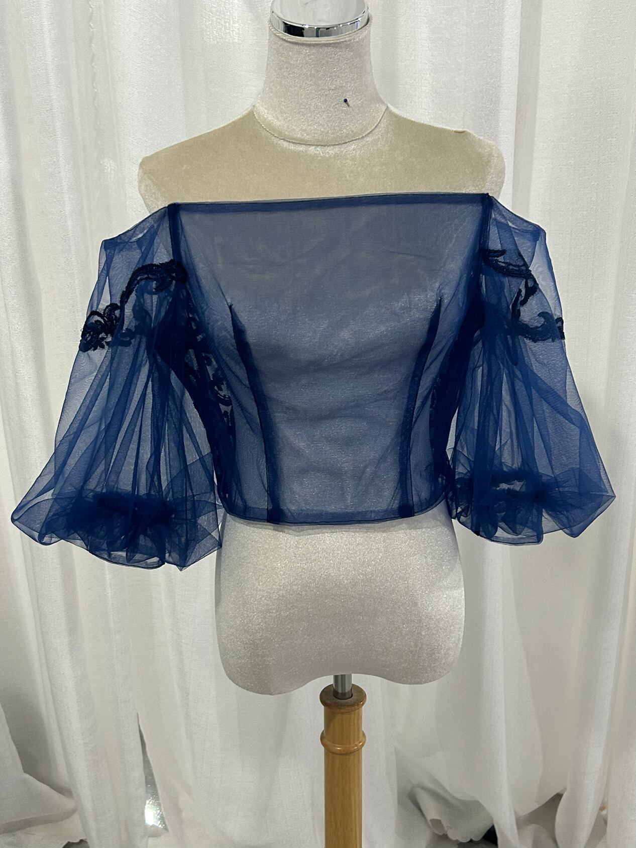 上品 紺オフショルダー 流れる透け花 エレガントレース フェミニンなフレームレースの袖トップス ボレロ ウエディング