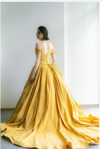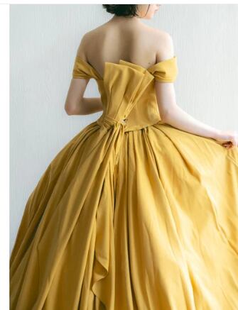 人気上昇!イエロー カラードレス ふっくら柔らかなバックリボン 華やかなトレーン 2次会 花嫁 挙式