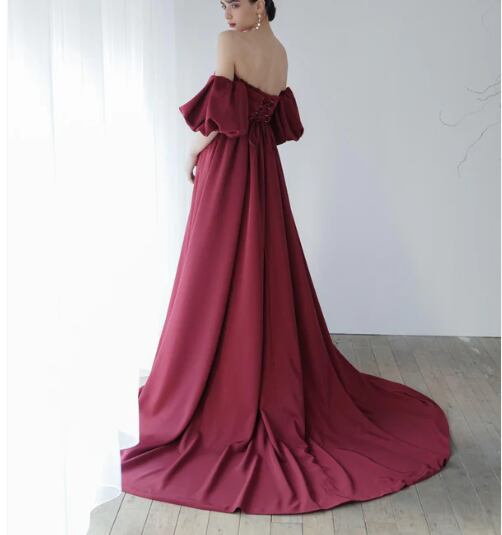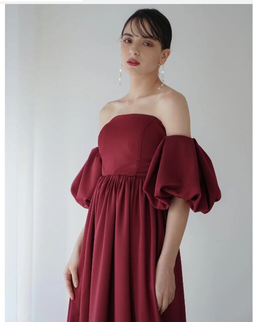 人気上昇! ワインレッド ベアトップ パフスリーブ カラードレス ミニトレーン 2次会 花嫁 挙式