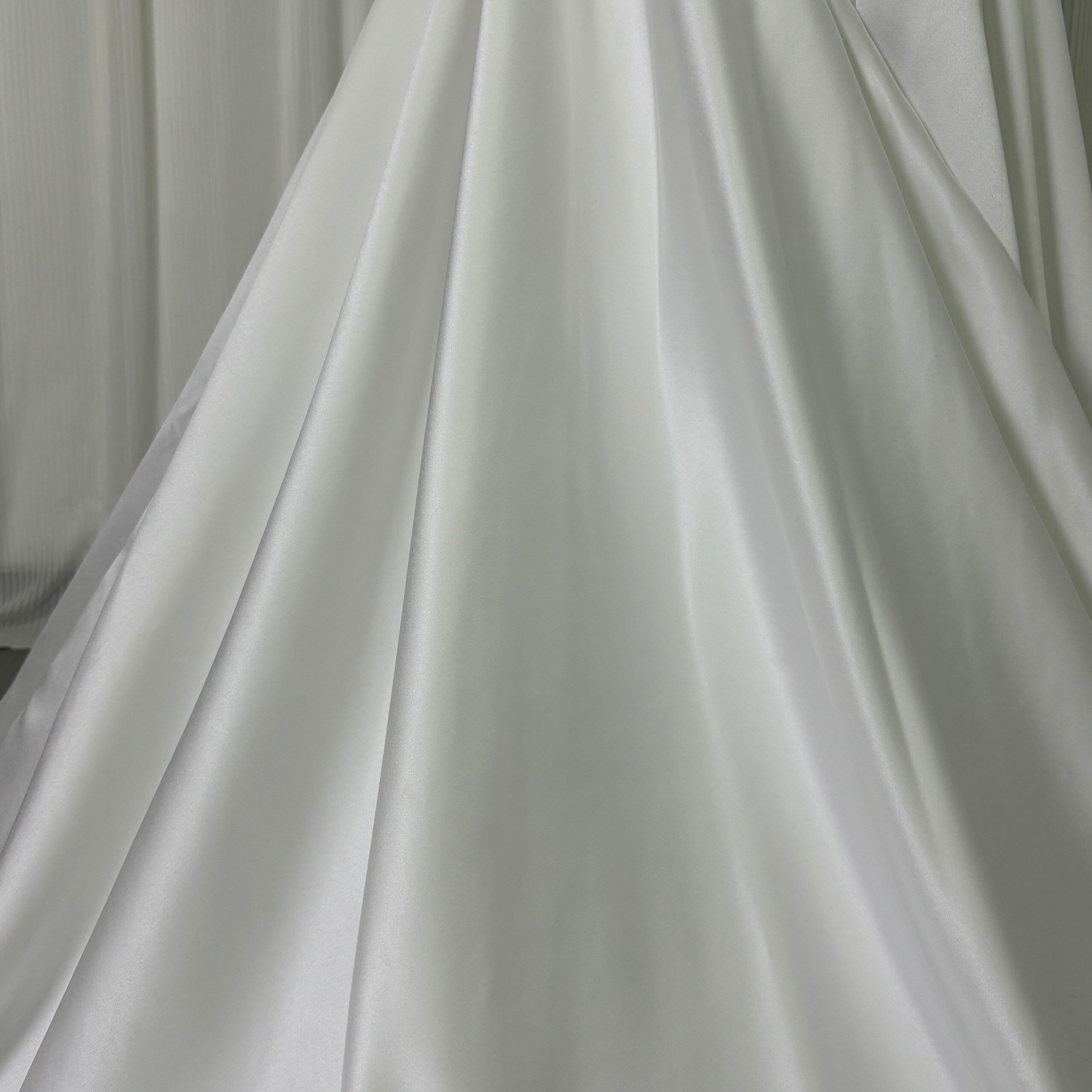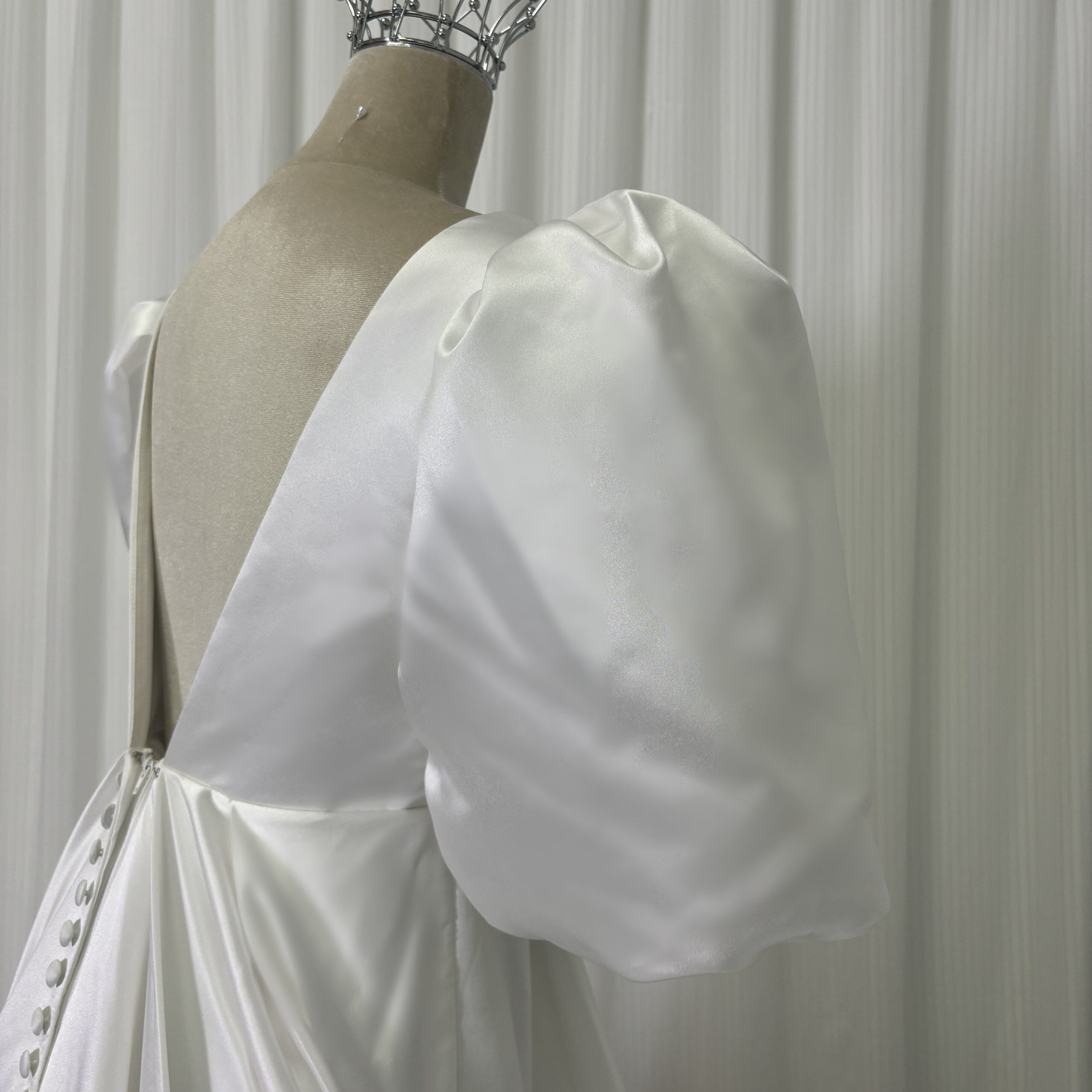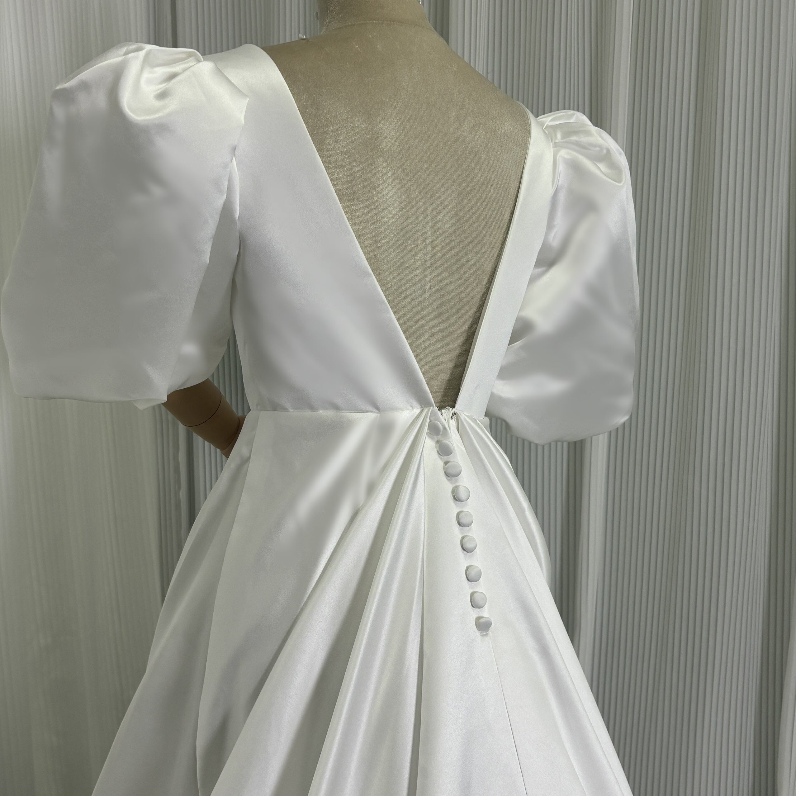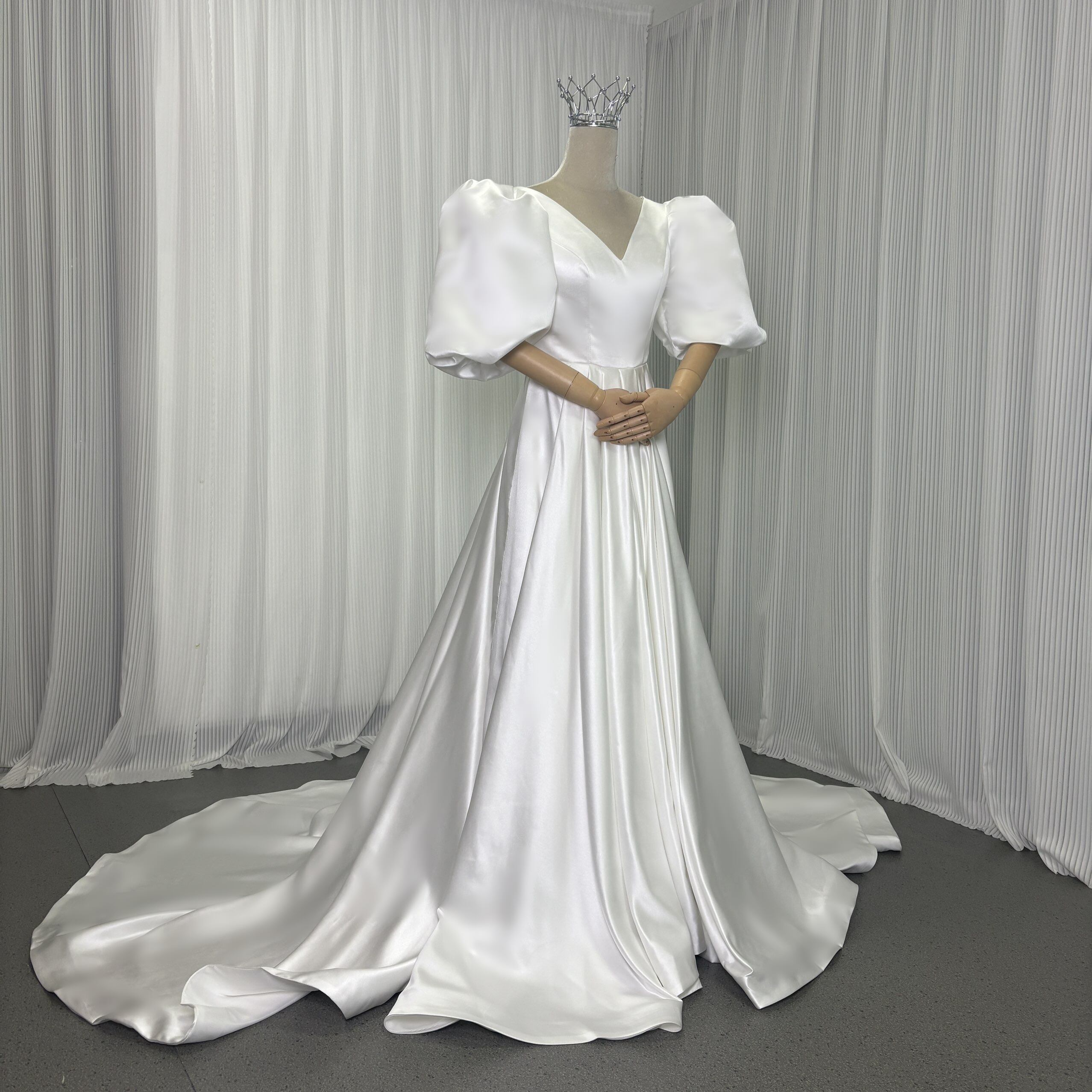 Vネック オフホワイト パフスリーブ 光沢サテン ウエディングドレス 華やかなトレーン 花嫁/結婚式/披露宴/