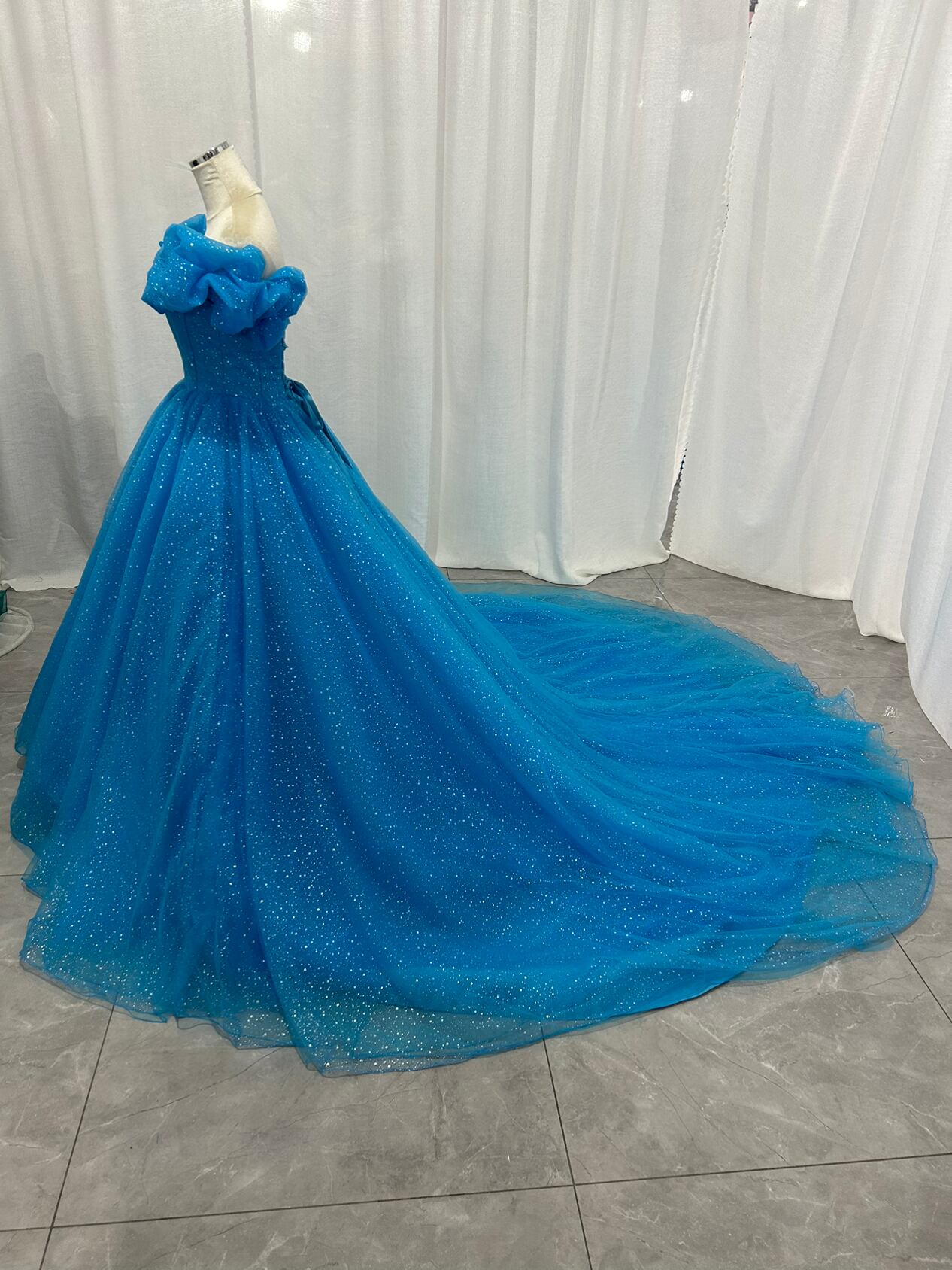 輝きな光彩を放つ 青 オフショルダー キラキラグリッターチュール カラードレス 2次会 花嫁 挙式