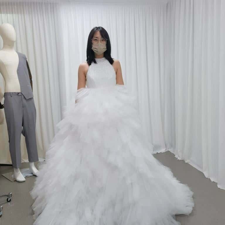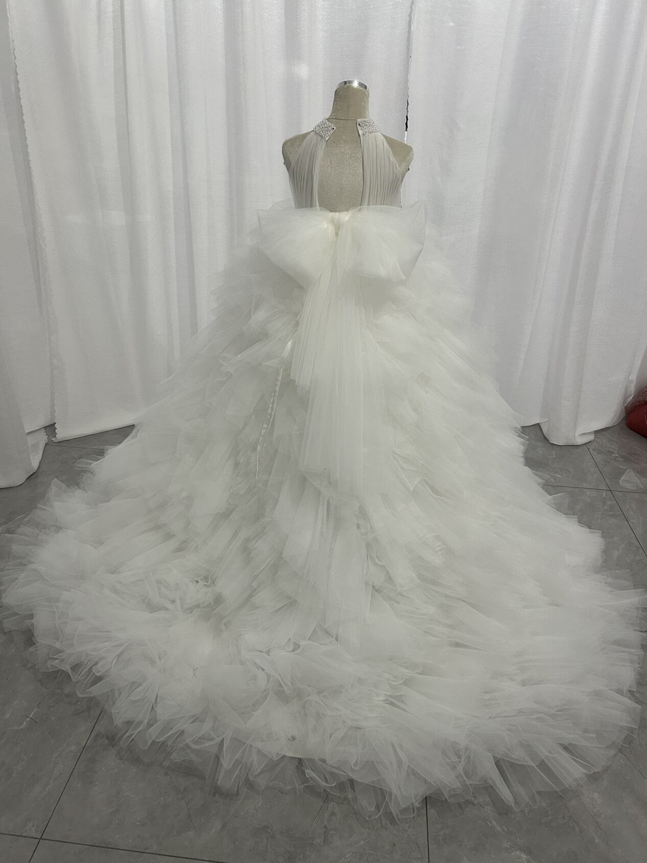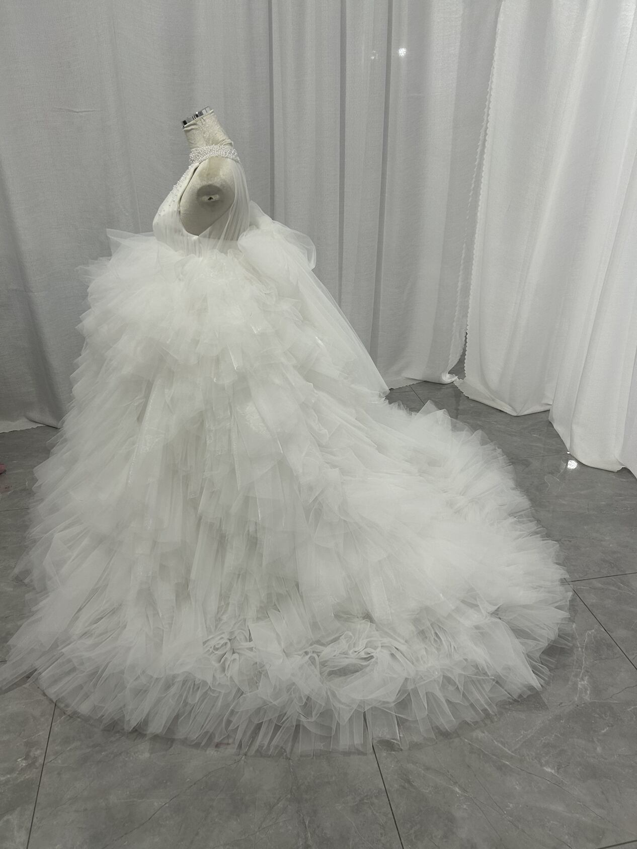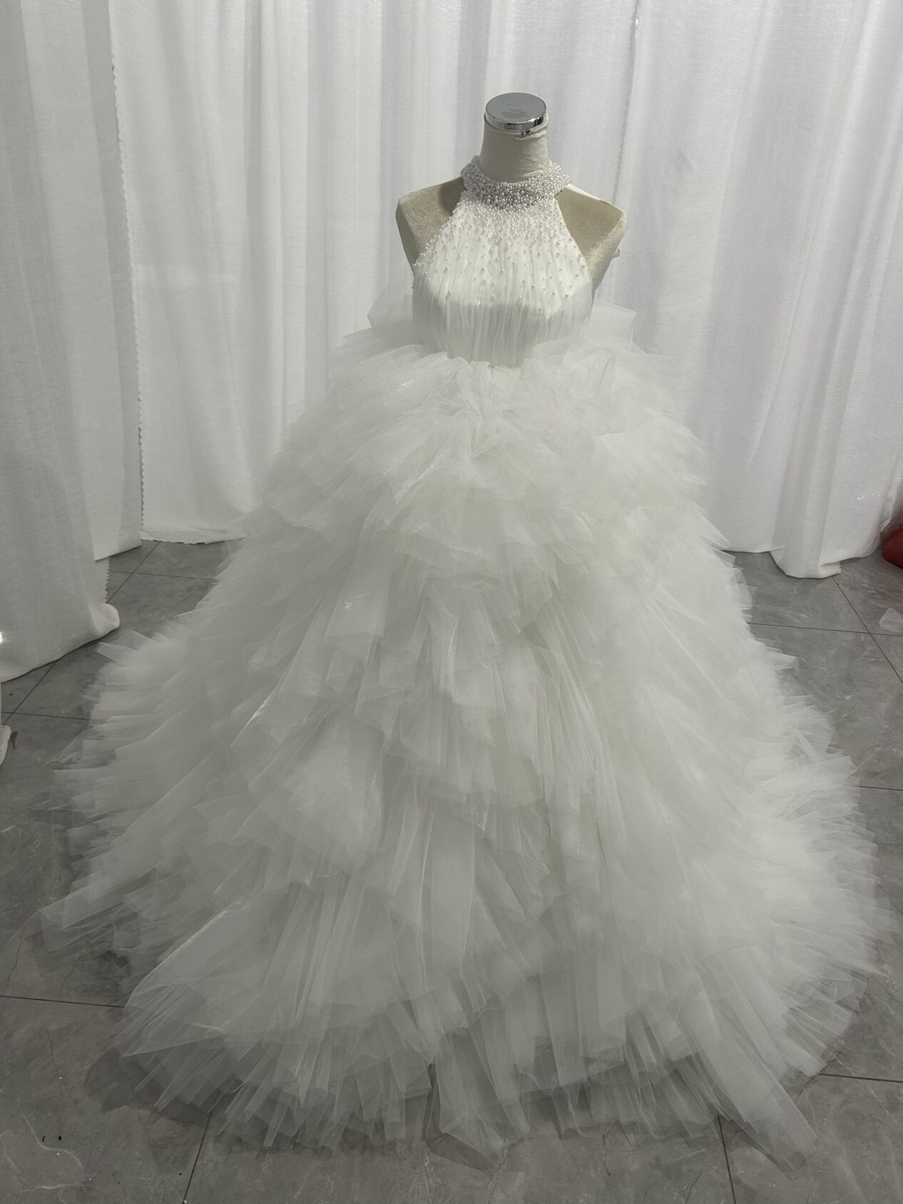 韓国風 ホルターネック パール ウェディングドレス もこもこドレス サッシュベルト フレアスカート プリンセスラインロングトレーン 花嫁