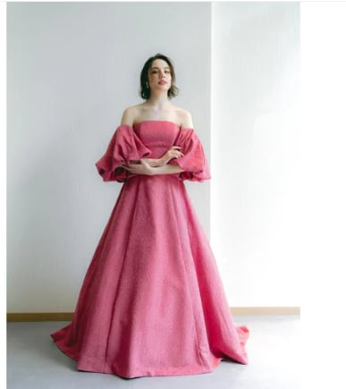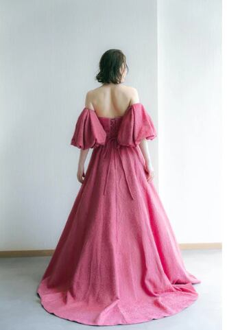 人気上昇! ビビッドピンク ベアトップ パフスリーブ カラードレス ミニトレーン 2次会 花嫁 挙式
