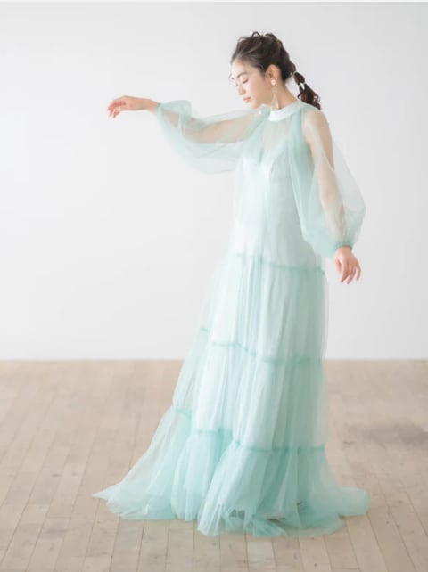 上品! グリーン キャミソールソフトチュール ふわふわ袖 カラードレス プ お色直し結婚式 披露宴